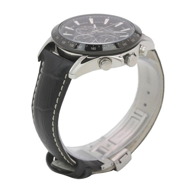 スポーティなクロノグラフとワニ型押しのレザーベルトが高級感のあるビジネススタイルを演出。