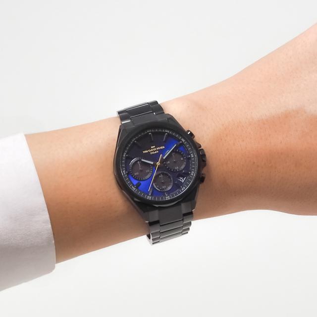 ケースとブレスレットは、マットなヘアライン仕上げと艶やかなポリッシュ仕上げを組み合わせたブラックIP仕様。落ち着きの中にエッジの効いた存在感を放ちます。また、ソーラー充電式クロノグラフムーブメントを搭載し、実用性とデザイン性を両立。