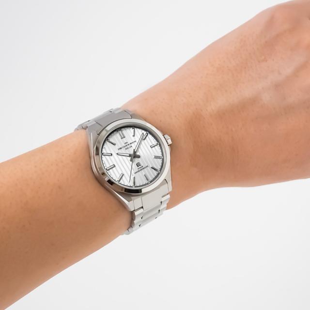 また、時計本体の仕上げには、メンズウォッチならではのメタル感を際立たせるシャープで力強いヘアライン仕上げと、艶やかなミラー仕上げを組み合わせています。