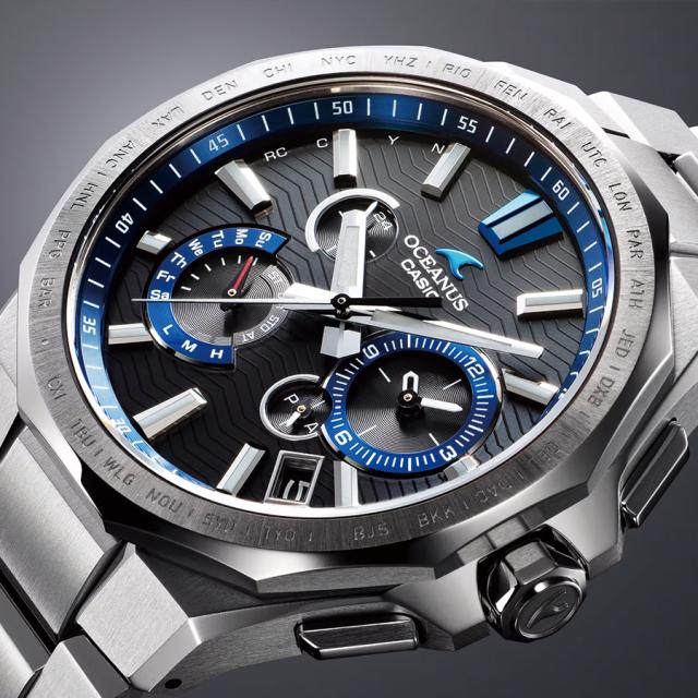 ザラツ研磨によって磨き上げられたケースと12面カットのベゼルでソリッドさを際立たせました。バンドの長さは5mm間隔で調整可能。ダイアルにはOCEANUSが着想の源にしている海の波をパターンに採用しています。