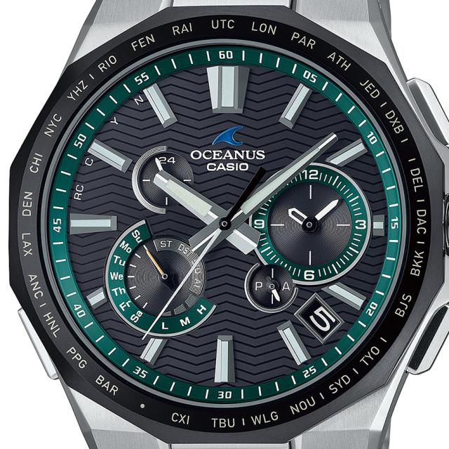 ザラツ研磨によって磨き上げられたケースと12面カットのベゼルでソリッドさを際立たせました。バンドの長さは5mm間隔で調整可能。ダイアルにはOCEANUSが着想の源にしている海の波をパターンに採用しています。