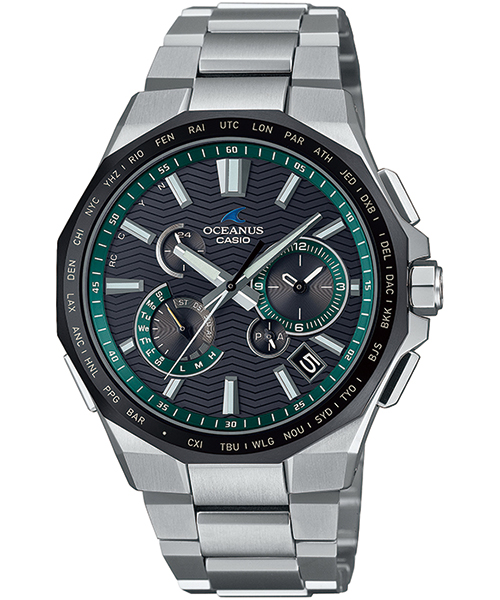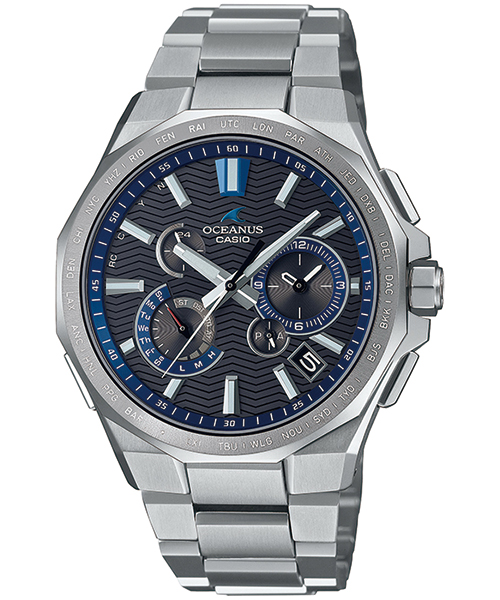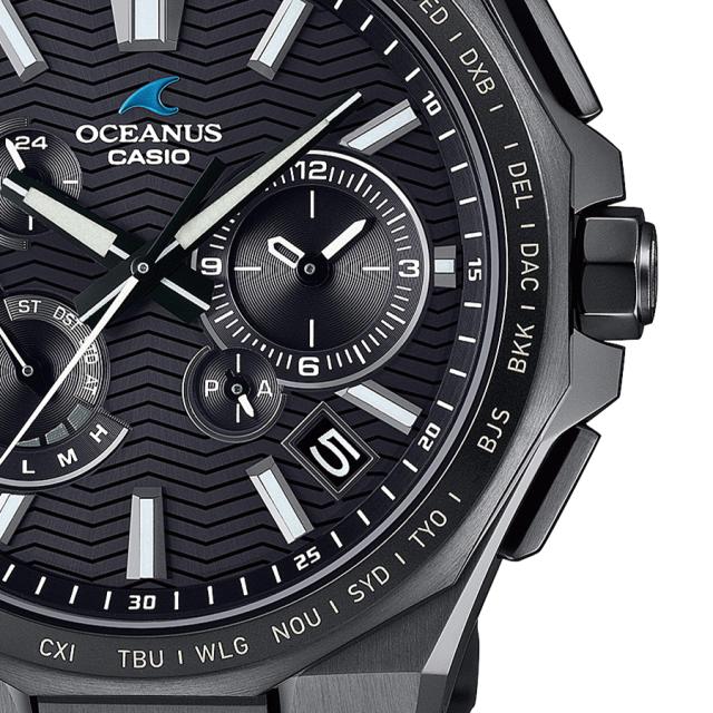 バンドは幅広の中駒を外駒より高く配置することで際立たせ、ソリッド感と腕馴染みを考えて設計しました。さらに、ブラックカラーの文字板には、OCEANUSが着想の源にしている海の波をパターンに採用しています。
