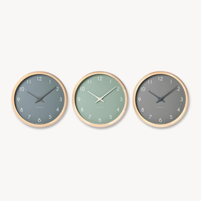 瑞々しい息吹を感じるグリーン、 落ち着いた深みあるグレー、ノーブルさと清新さを兼ね備えたブルーの3色です。差し色として空間にフレッシュなアクセントを与えつつも、計算されたシンプルなデザインで程よく調和します。フォントと針はやわらかな曲線を活かしたデザイン。時計枠はカットしたブナ材を8つ組みにして 材料も無駄をなくし、強度も確保した構造に。オイル塗装を施して、自然な木の経年変化をたのしんでいただけます。
