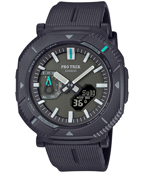 ケース、バンドなどの主な樹脂パーツには環境配慮型のバイオマスプラスチックを使用。加えて、タフソーラーやBluetooth®を搭載し、スマートフォン連携も可能です。