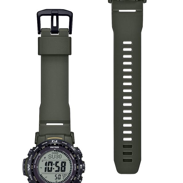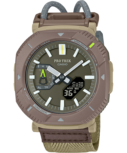 ベースモデルのPRW-35と同様、ケース、バンドおよび樹脂製の裏蓋には環境負荷の低減が期待されるバイオマスプラスチック樹脂を採用、環境への配慮を形にしました。