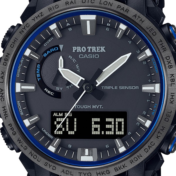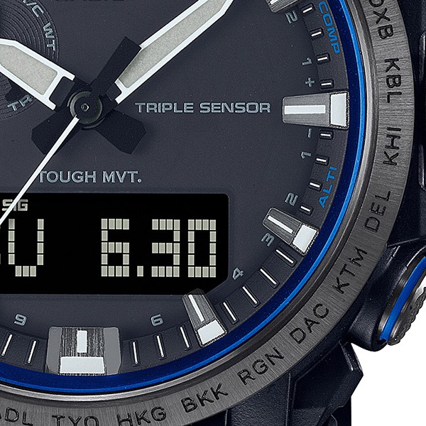 PRW-61FCは、バイオマスプラスチックを使用したフィールドコンポジットバンドを初めて採用しました。今回採用のフィールドコンポジットバンドは、メタルを埋め込んだバイオマスウレタンとバイオマスプラスチック素材の中駒を採用しました。割れや変色などに強く、耐久性を維持しながらも軽量なバンドになっています。風防にサファイアガラス、ガラス外周にはブルー蒸着を施し、10時位置のインダイアルと合わせてクールな印象に仕上げました。ケースと樹脂製の裏蓋にもバイマスプラスチックの素材を使用しています。時計本来の機能として世界6局の電波を受信するマルチバンド6やタフソーラーなど実用的な機能も兼ね備えます。様々なシーンで対応する高い機能性と実用性を詰め込んだモデルです。