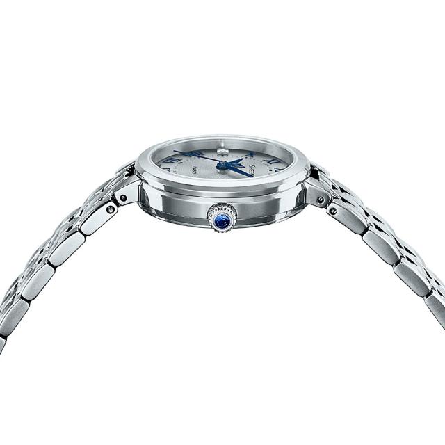 ダイアルの9時位置にクリスタルパーツを配置。りゅうずにはブルークリスタルを用いました。緻密な形状の多列バンドが腕馴染み良く上品なデザインです。