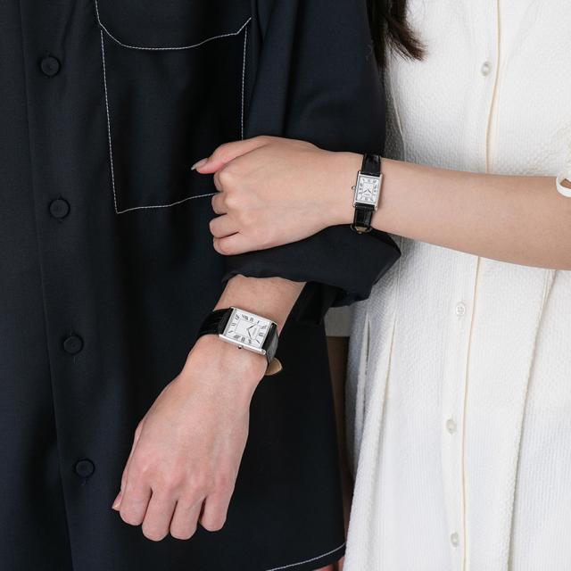 ブラックのレザーバンドには、ハーフマット仕上げの型押しカーフレザーを採用。落ち着いた質感で、カジュアルにもビジネススタイルにも馴染む一本です。