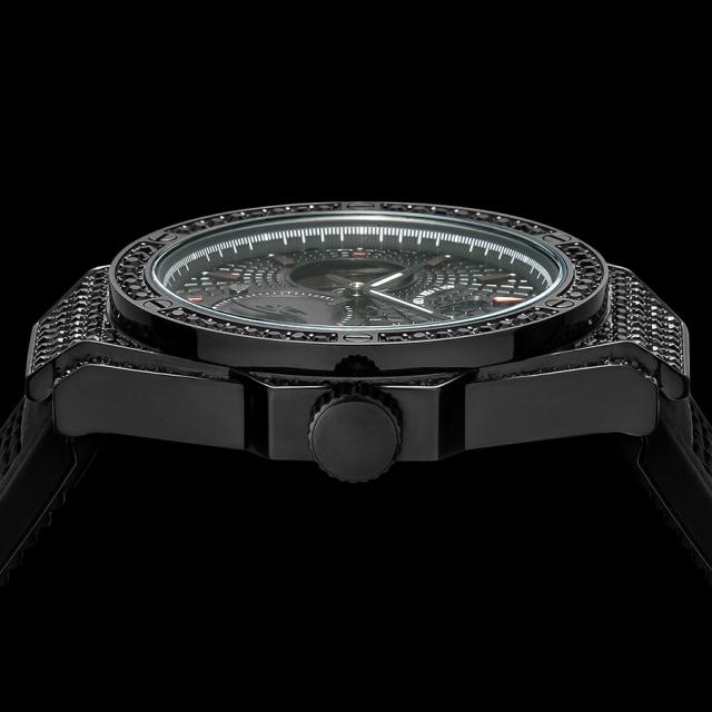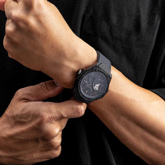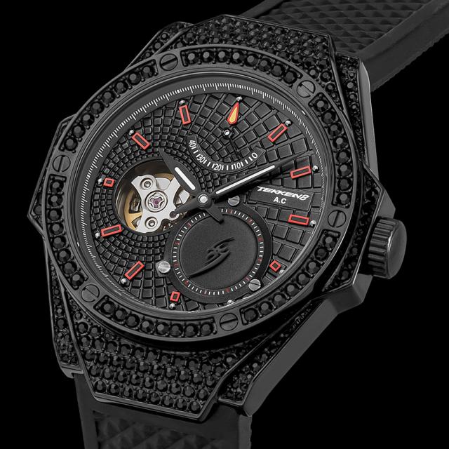 ケース全体に236石のブラッククリスタルガラスをセットし、漆黒の世界で妖しく煌めく様子が孤高にして唯一無二の存在感を際立たせています。また、内部に搭載された機械式ムーブメントの一部が覗けるオープンハートデザインは、魂を懸けて激突する彼らのように「時計の魂」を明らかにします。