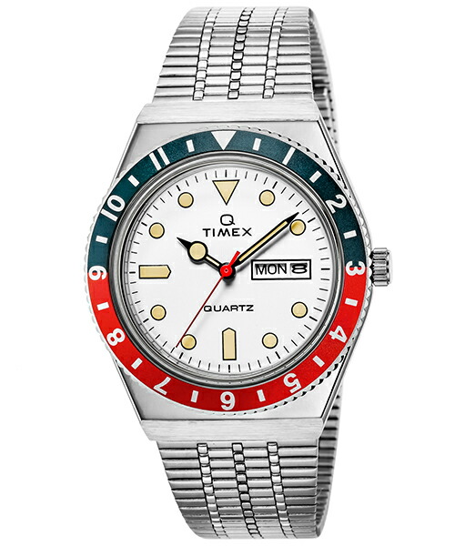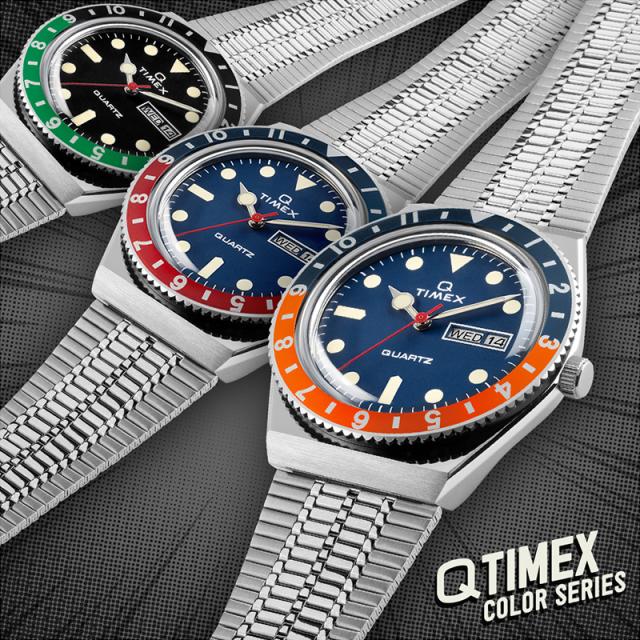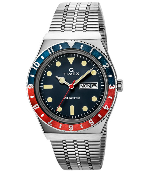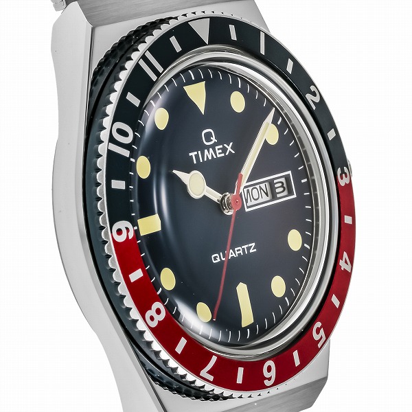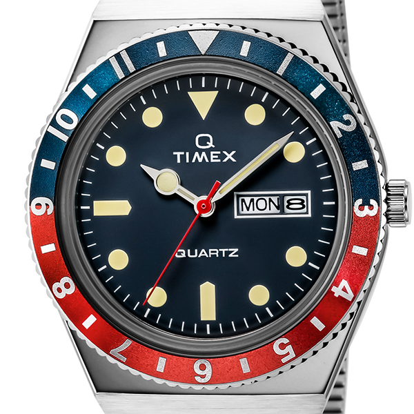 1979年当時のモデルを復刻したQ TIMEX。アルマイト加工の2色ベゼルや、細かい作りのステンレス製ブレスレット、便利なデイ・デイト機能、風合いのあるドーム風防、そしてケース裏のバッテリー交換用ハッチなど、こだわりのディテールが満載です。