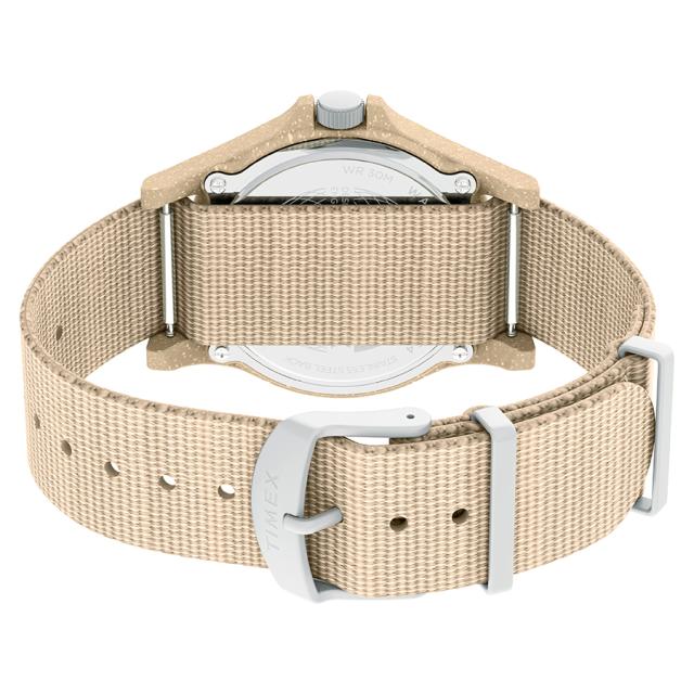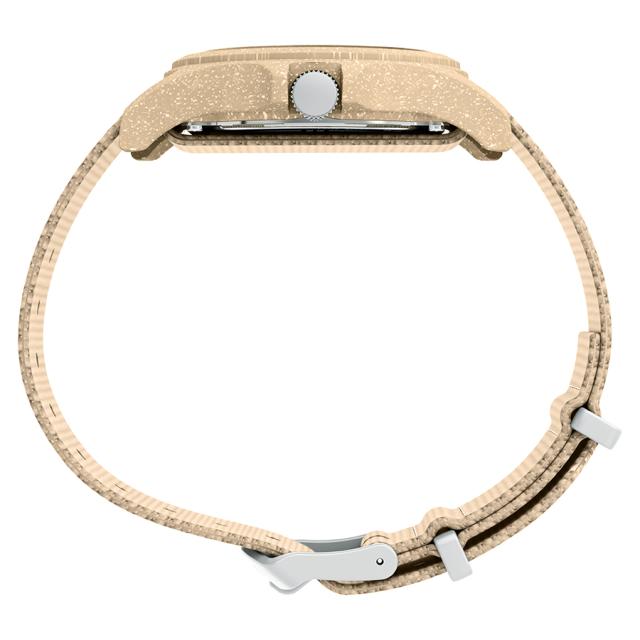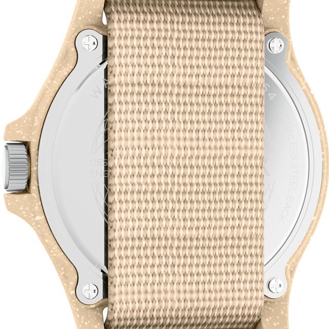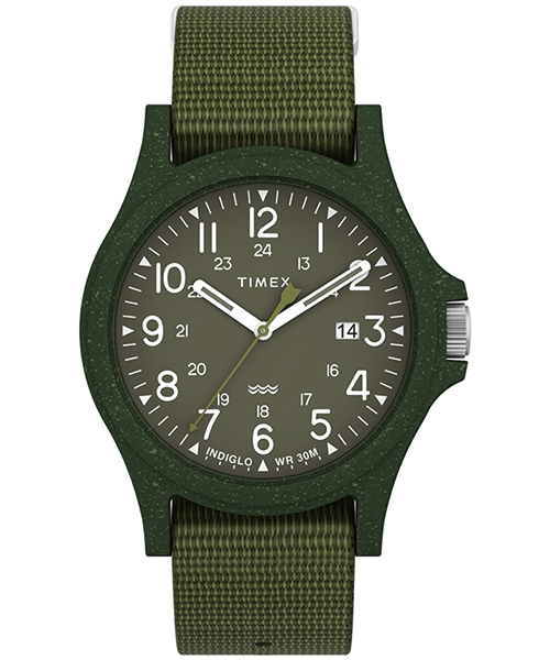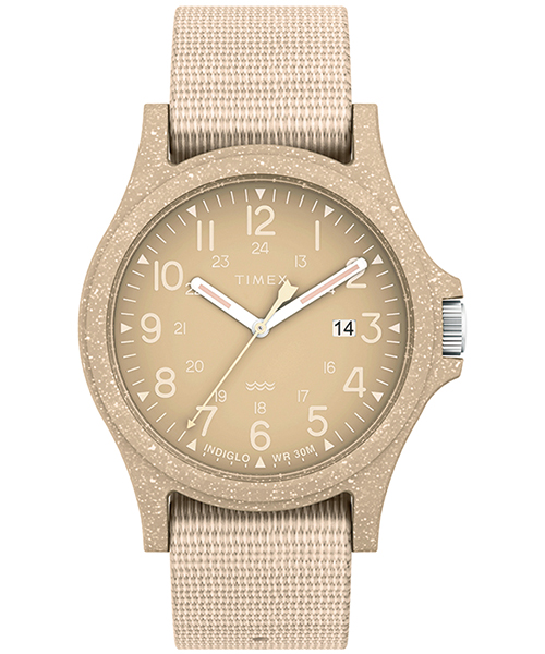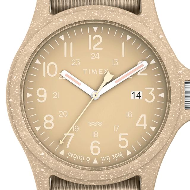 いつの時代の愛される永遠のスタンダードであるタイメックスの定番、オリジナル・キャンパーのDNAを受け継ぐ文字盤デザインをベースに、リューズガードを設けた40mmの新しいケースと引き通しタイプのストラップに海洋プラスチックを100%再生利用したスイス・タイド社の素材を採用しています。さらには普段使いにある便利な日付表示に備え、デイリーにもアクティビティにも合わせやすいデザインとスペックを両立しています。