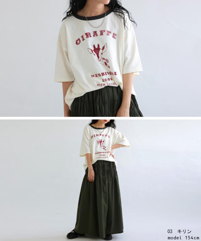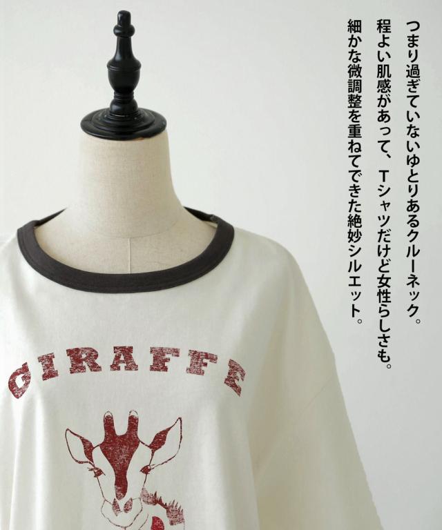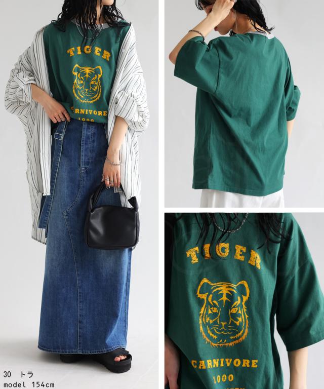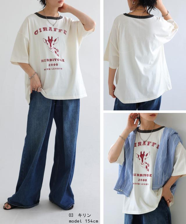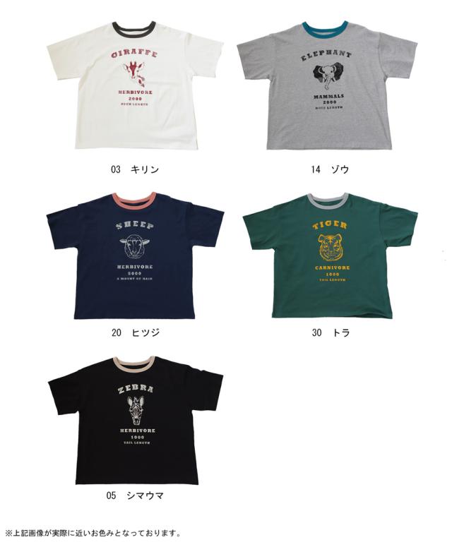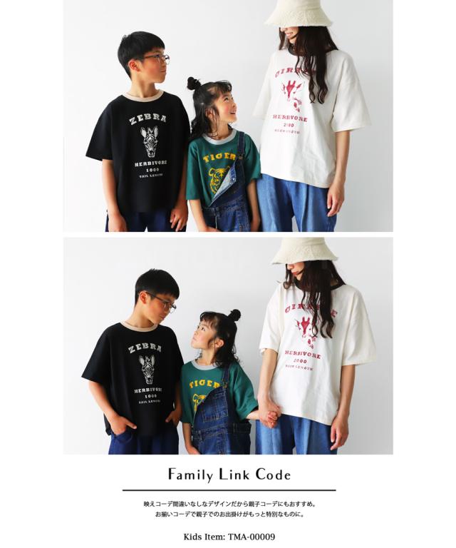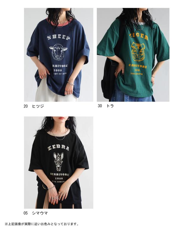 ama-00008 綿100 カットソー 半袖 五分袖 アニマルプリント 配色 ロゴT 手描き オリジナル プリント ヴィンテージ感 レトロ 古着風 ゆったり ジャスト丈 リンクコーデ 親子コーデ