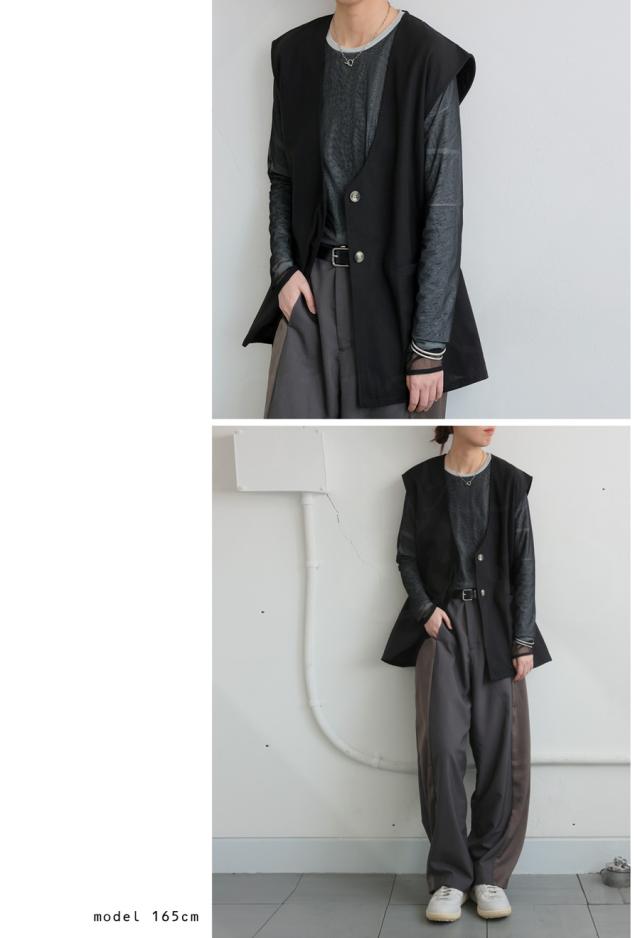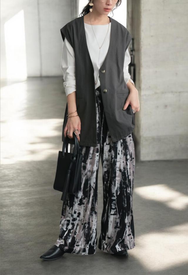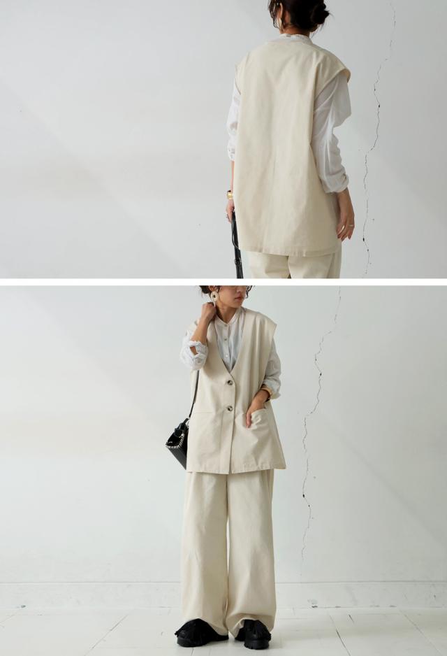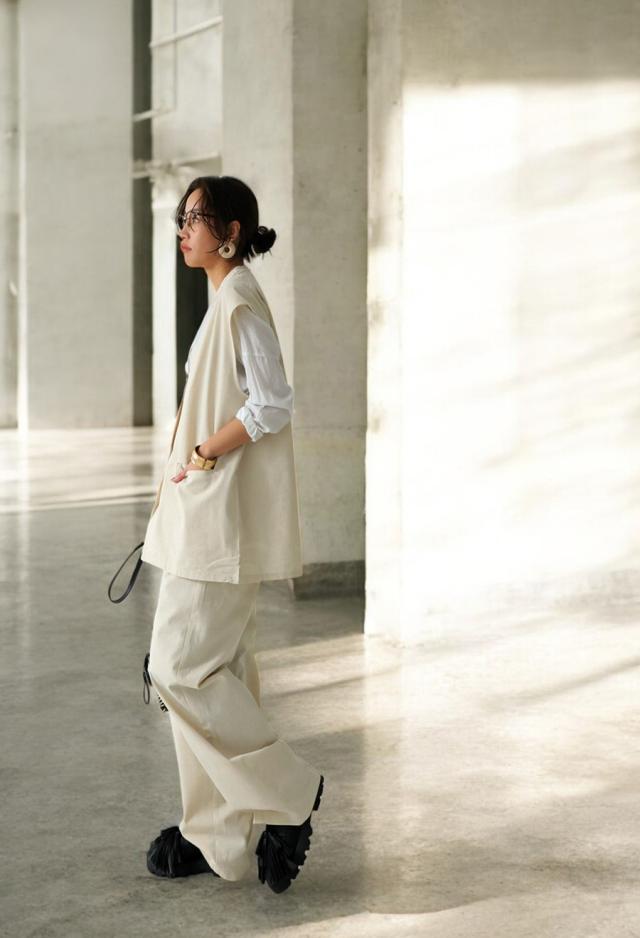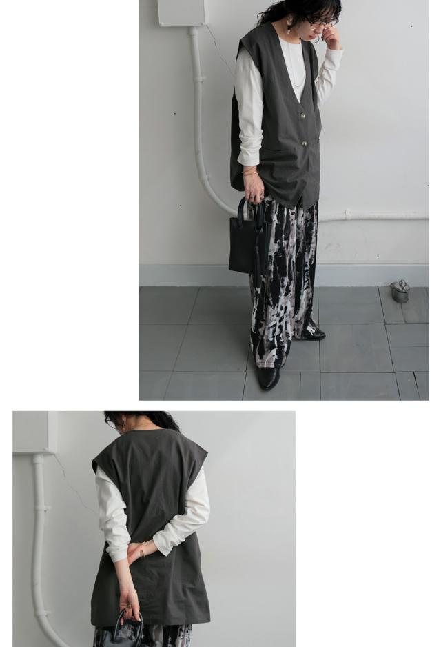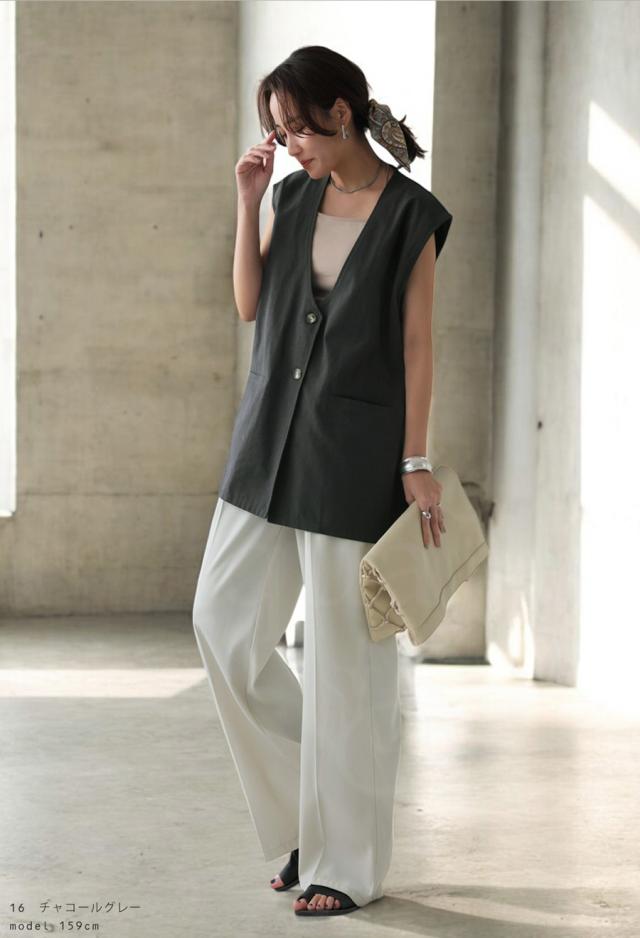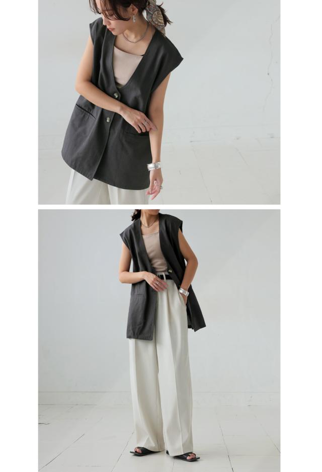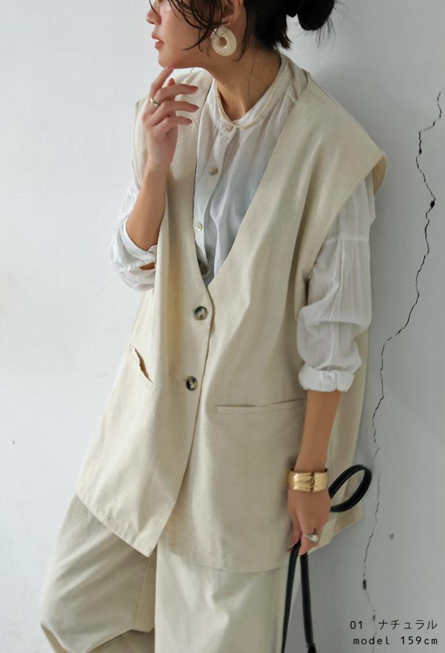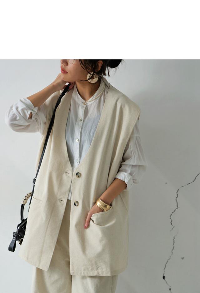 前下がりのシルエットが、程よいきちんと感を演出してくれるリネンベスト。