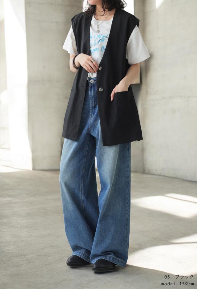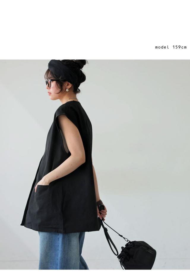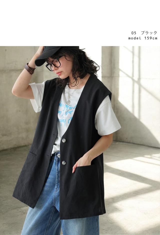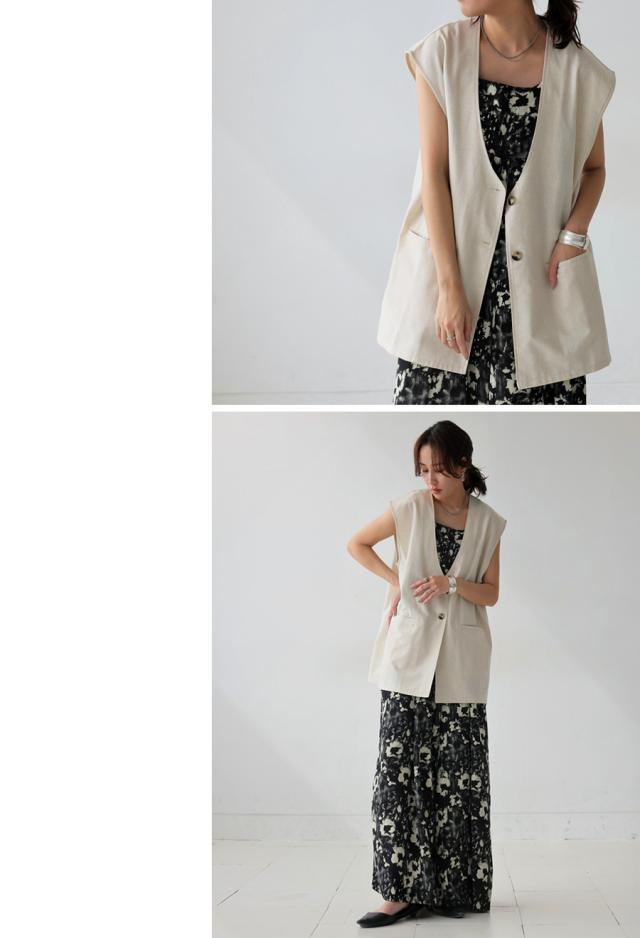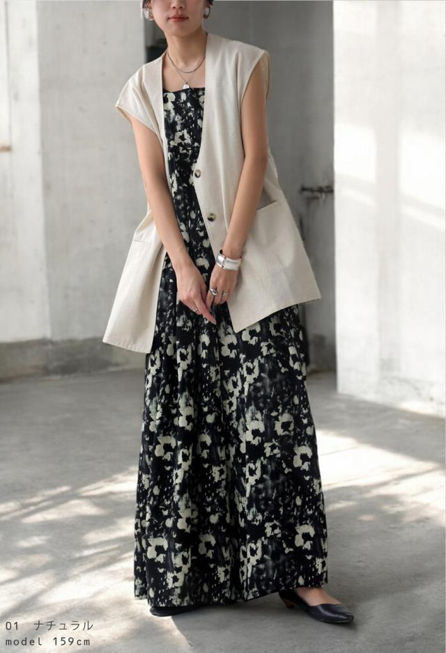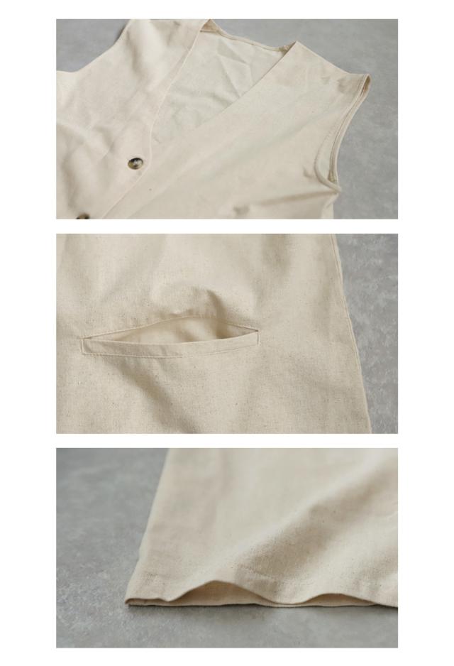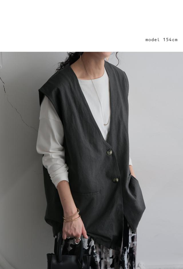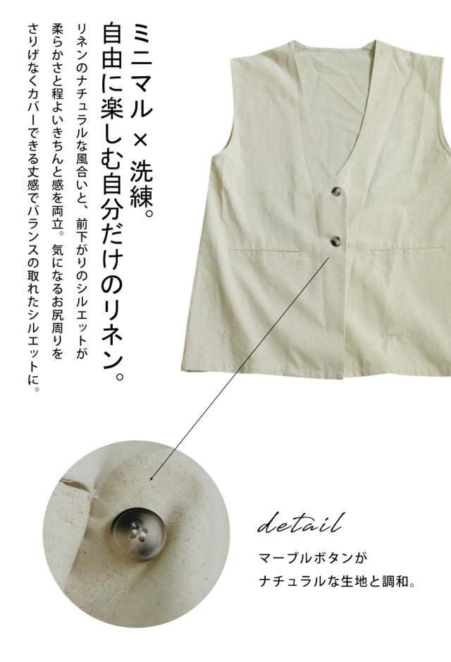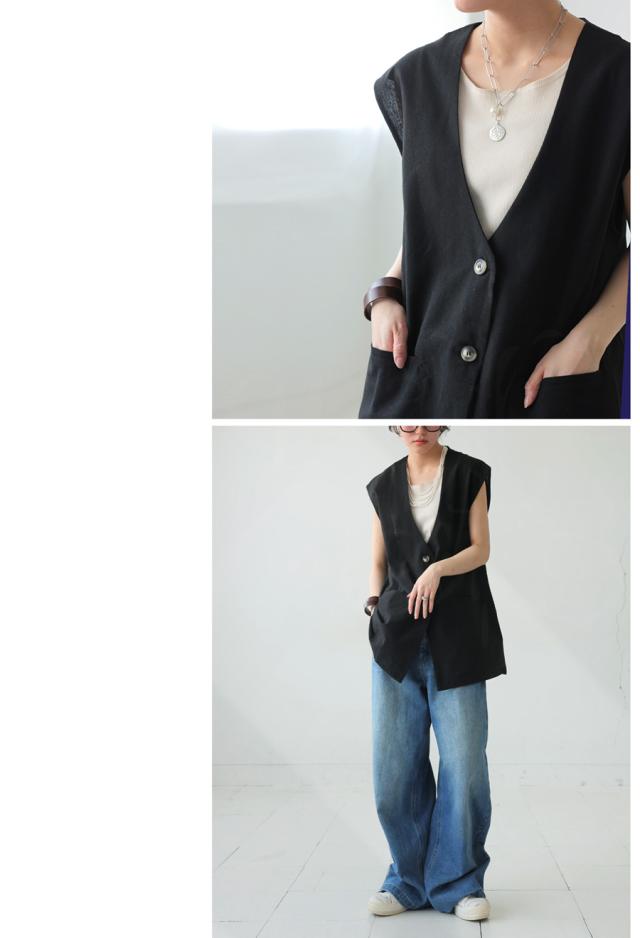 aya-00034 麻 麻混 Vネック 前開き ボタン ゆったり ノースリーブ シンプル きれいめ 上品 レイヤード 重ね着 スタイリッシュ マーブルボタン ミニマル 体型カバー 長め丈 きちんと感