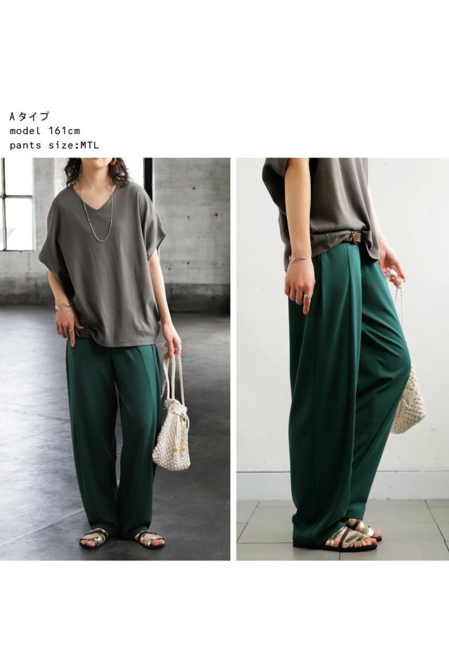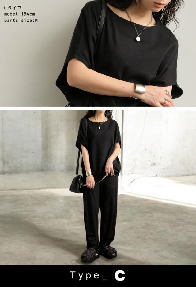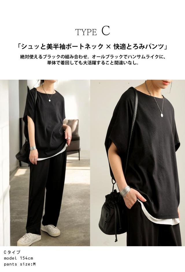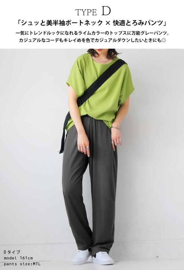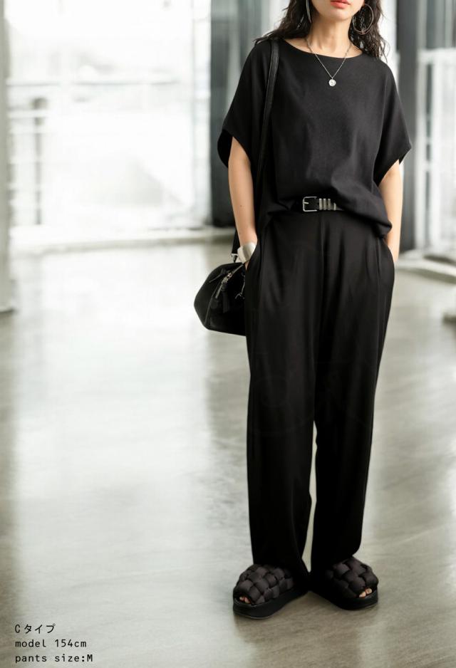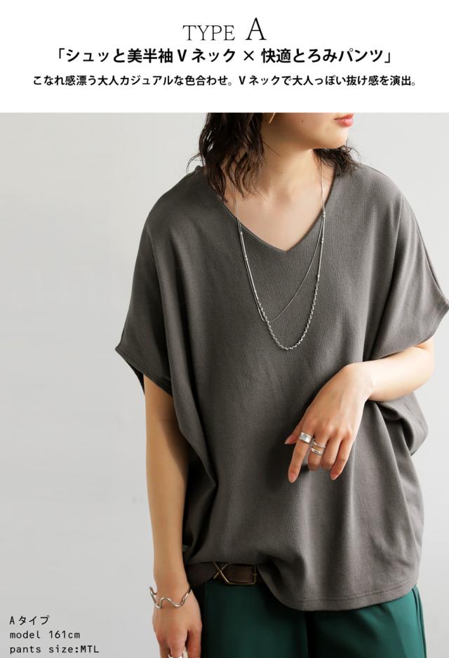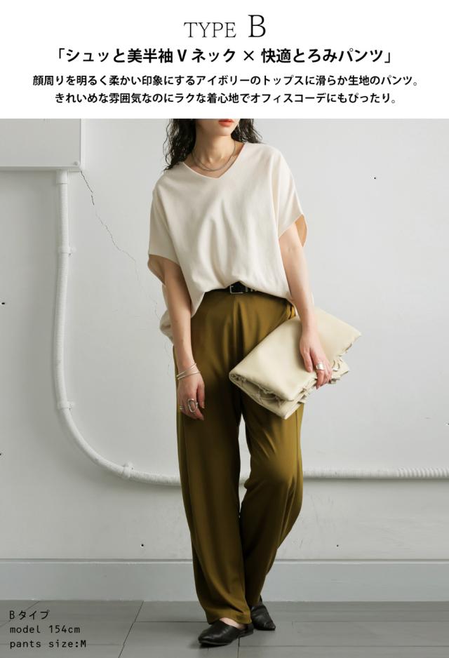 code-00041 シュッと美シリーズ トップス 半袖 ボートネック Vネック 無地 Tシャツ パンツ ボトムス ロング ストレート 落ち感 ポケット付き ラフ 内紐 ストレッチ プルオーバー