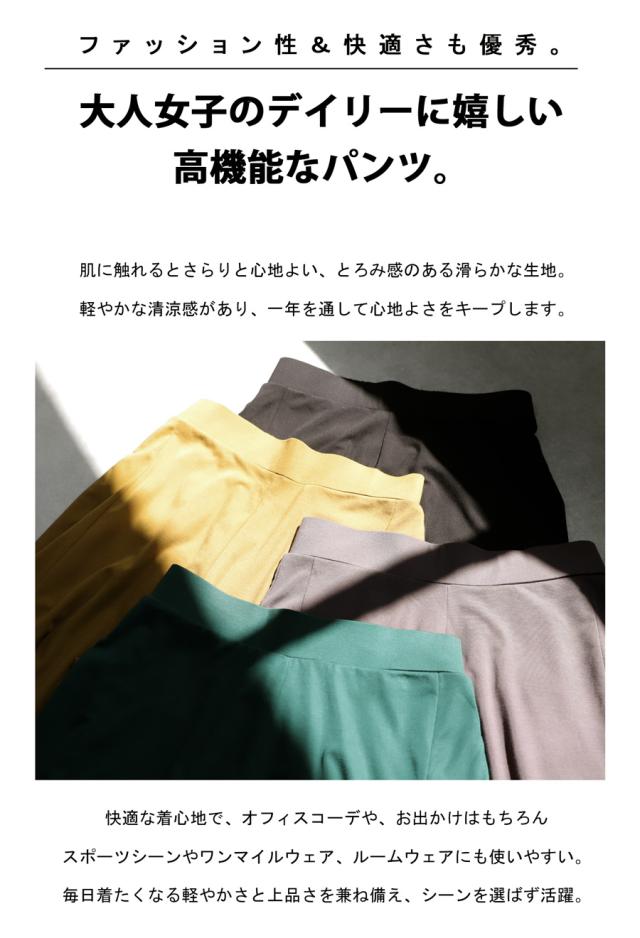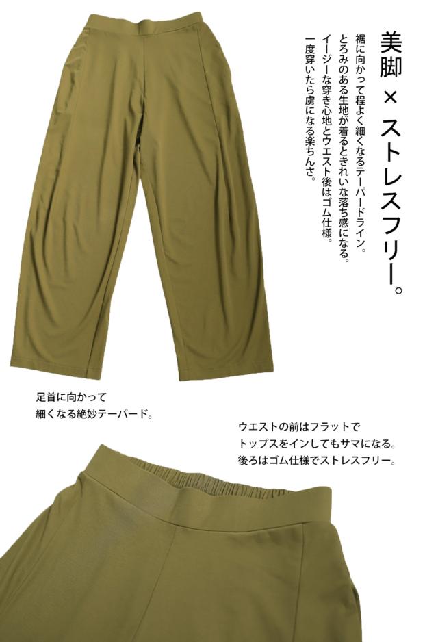 パンツは裾に向かって細くなるテーパード形状で、美脚ラインを演出しながら、ストレスフリーな後ろゴム仕様。
