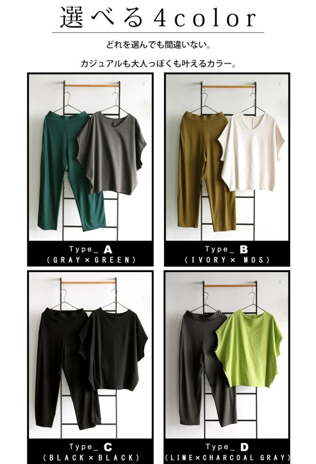 とろみ素材のトップスとテーパードパンツの2点セットが登場。