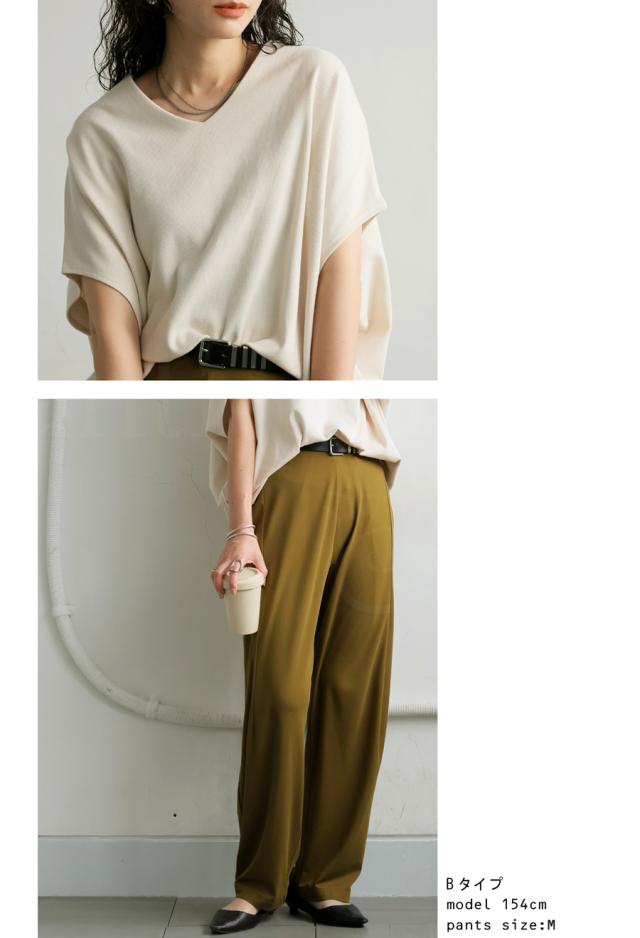 トップスはネックラインに変化をつけたVネックとボートネックの2種類で、顔まわりをすっきりと見せてくれます。