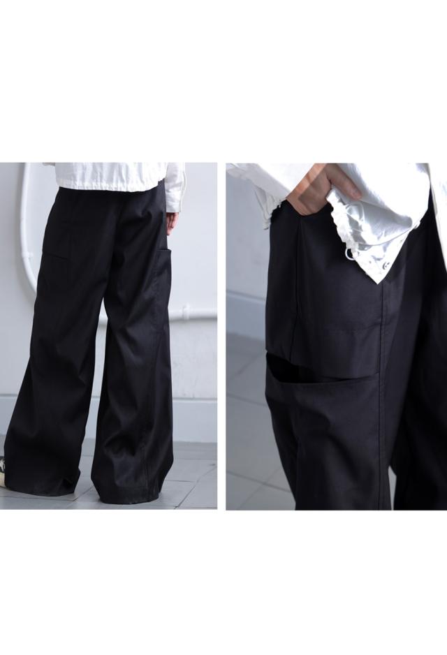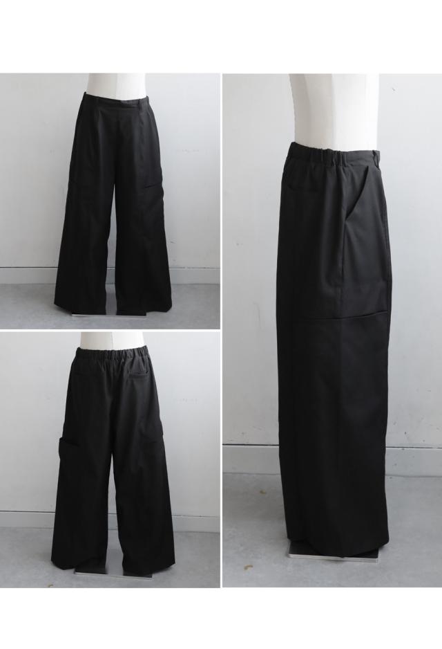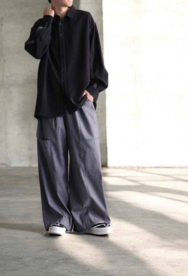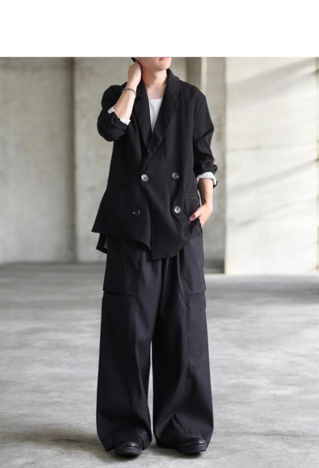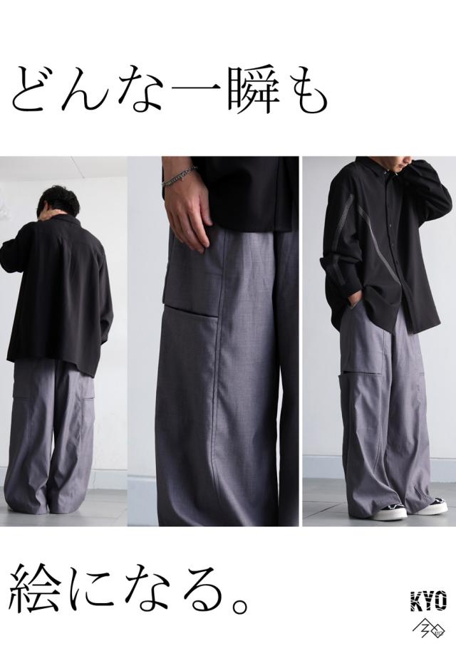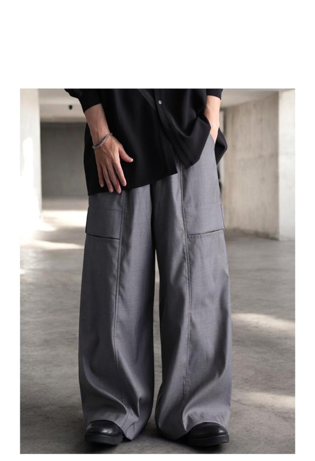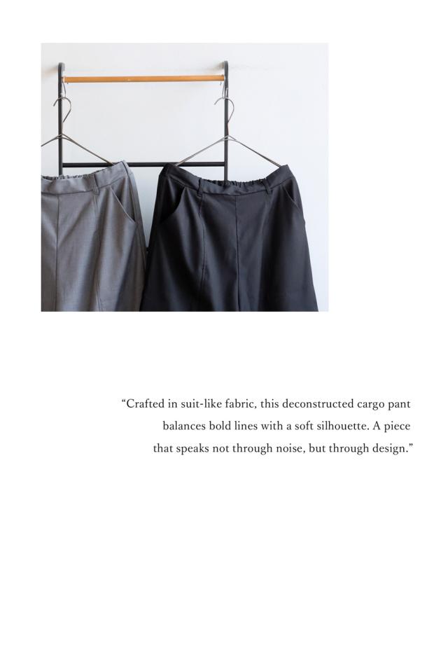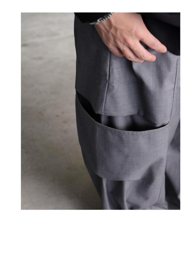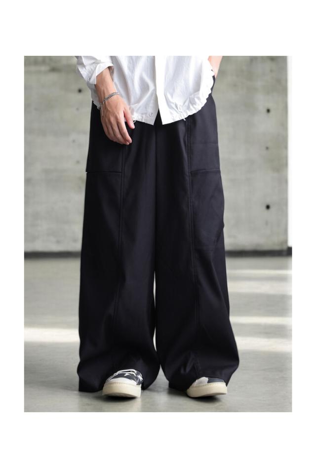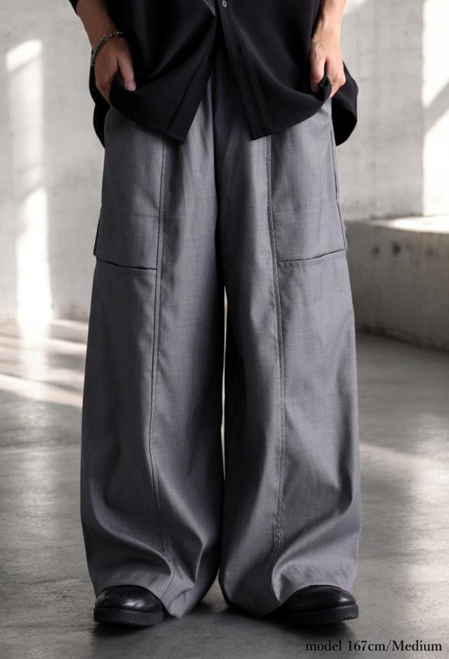 上品なスーツ素材で仕立てた、メンズ仕様のワイドカーゴパンツです。