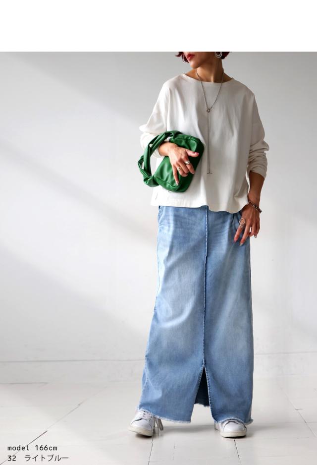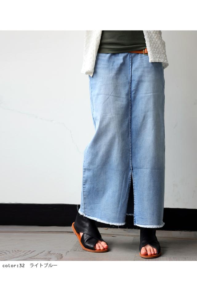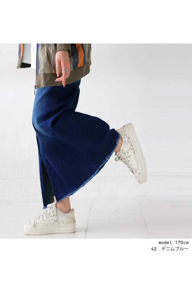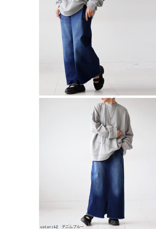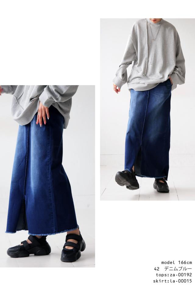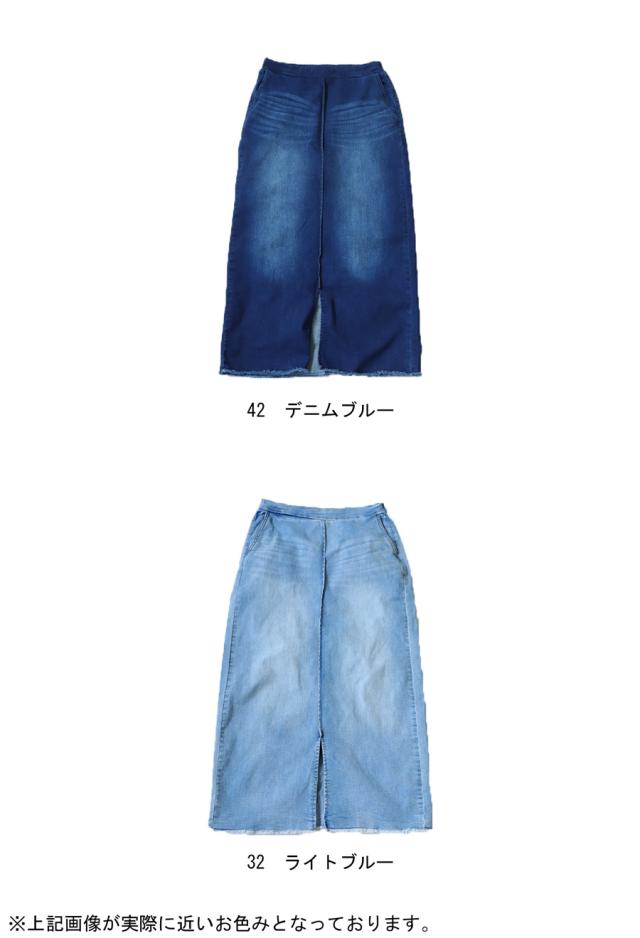 la-00015 綿混 ロングスカート マキシ丈 切りっぱなし フリンジ 伸縮 ストレッチ ストレッチデニム ヴィンテージ感 フロントスリット スリット Iライン ストレート 後ろゴム ゆったり
