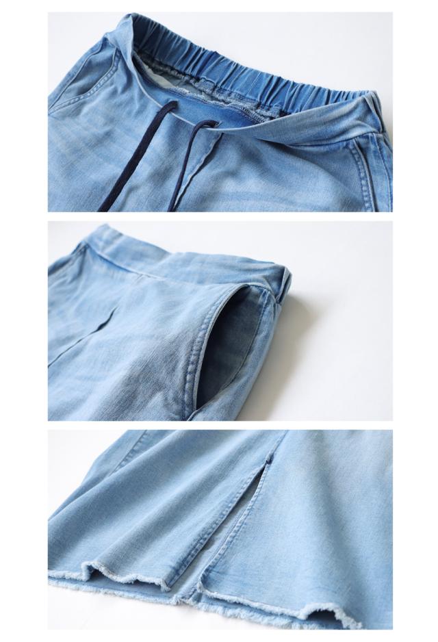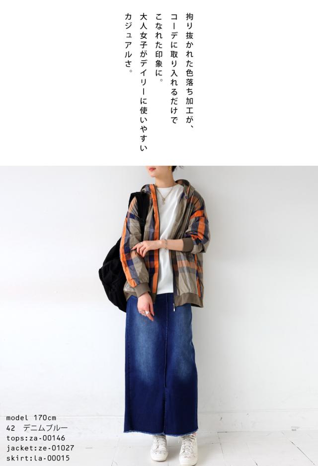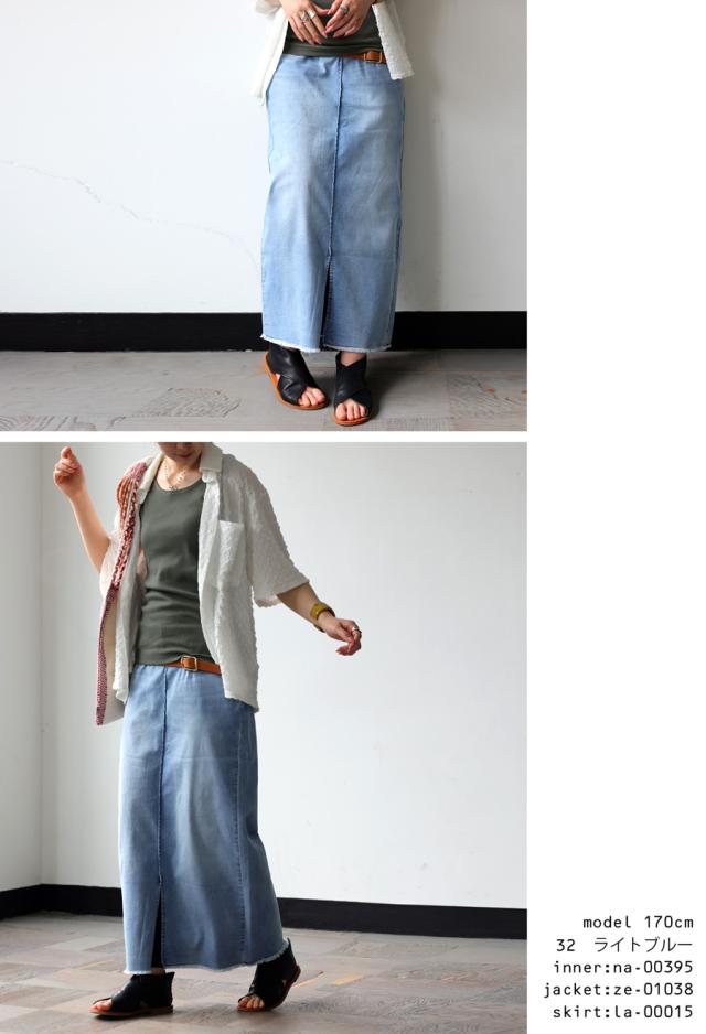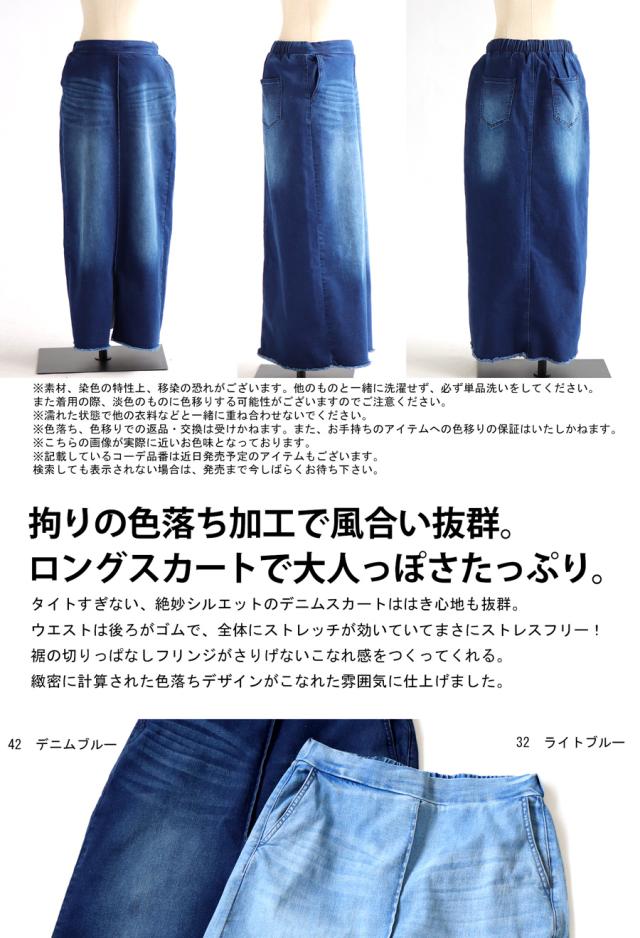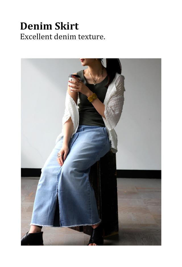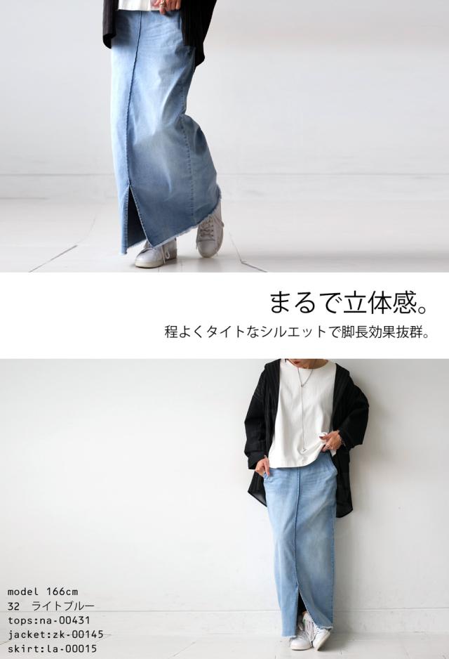 la-00015 綿混 ロングスカート マキシ丈 切りっぱなし フリンジ 伸縮 ストレッチ ストレッチデニム ヴィンテージ感 フロントスリット スリット Iライン ストレート 後ろゴム ゆったり