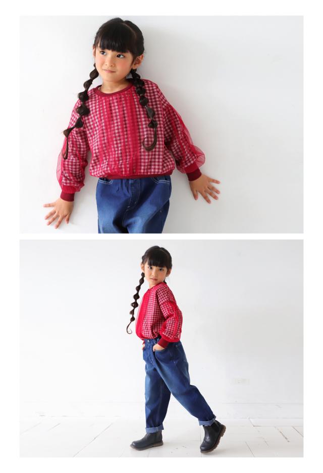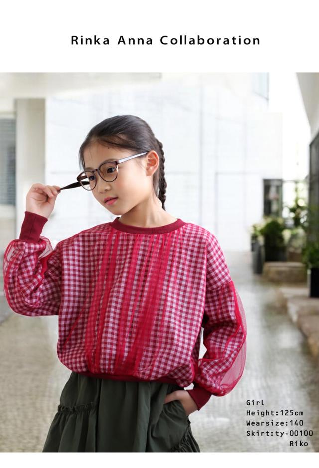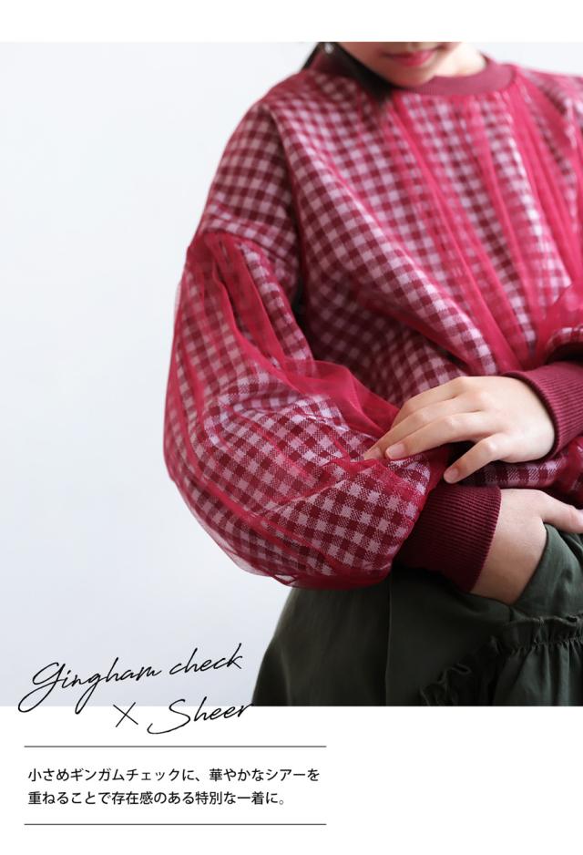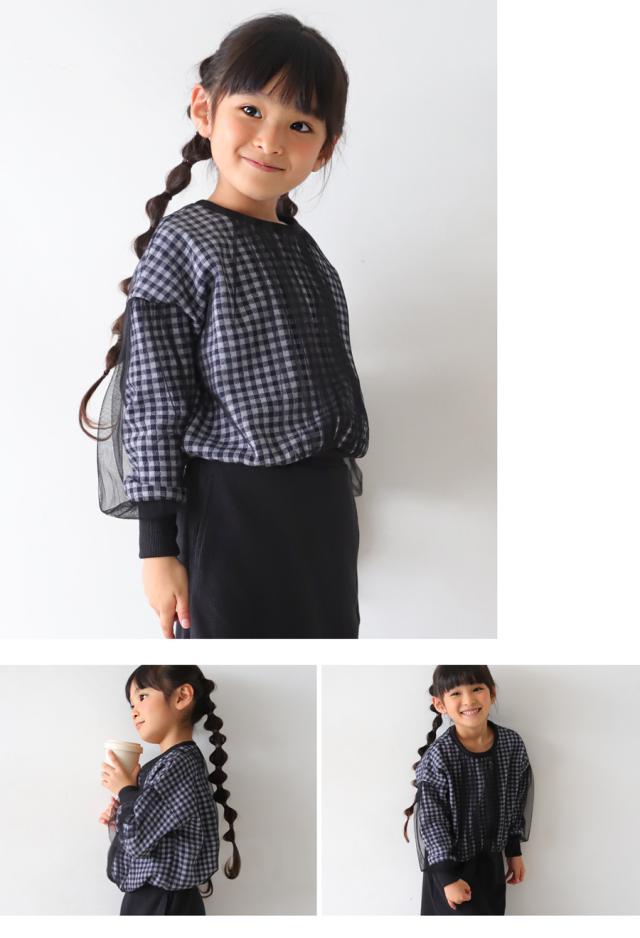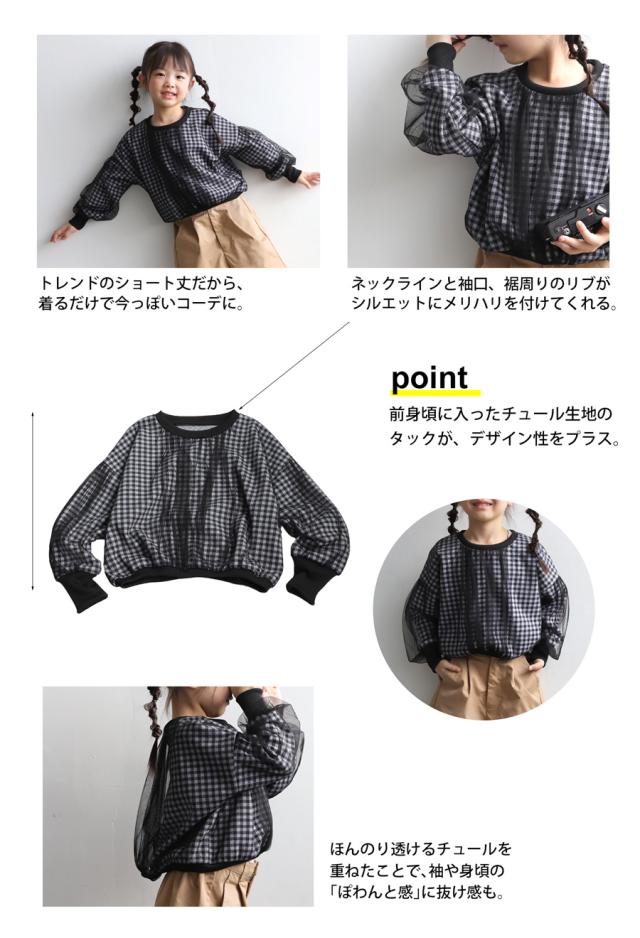 mra-0003 キッズ 子供服 女の子 ジュニア 低学年 高学年 長袖 丸首 クルーネック ギンガムチェック 柄トップス 柄 チュール デザイントップス リブ プルオーバー ゆったり きれいめ