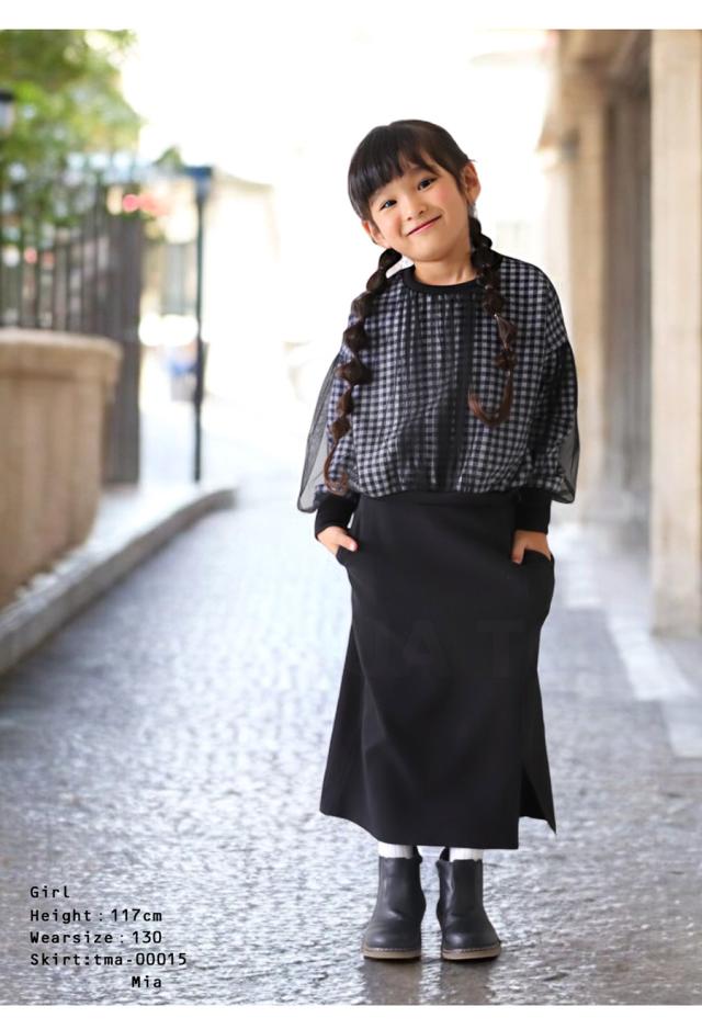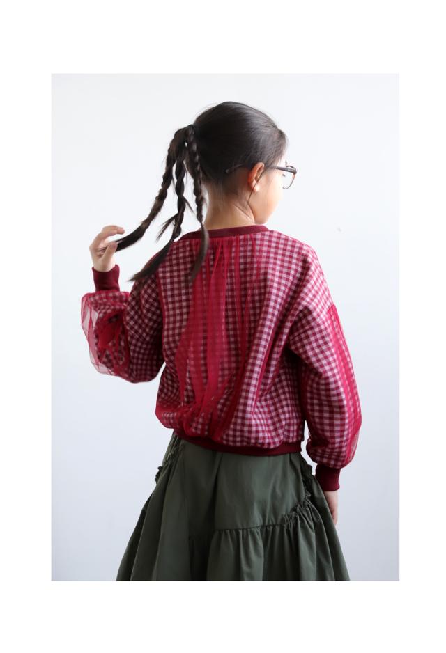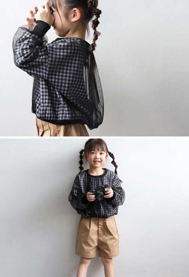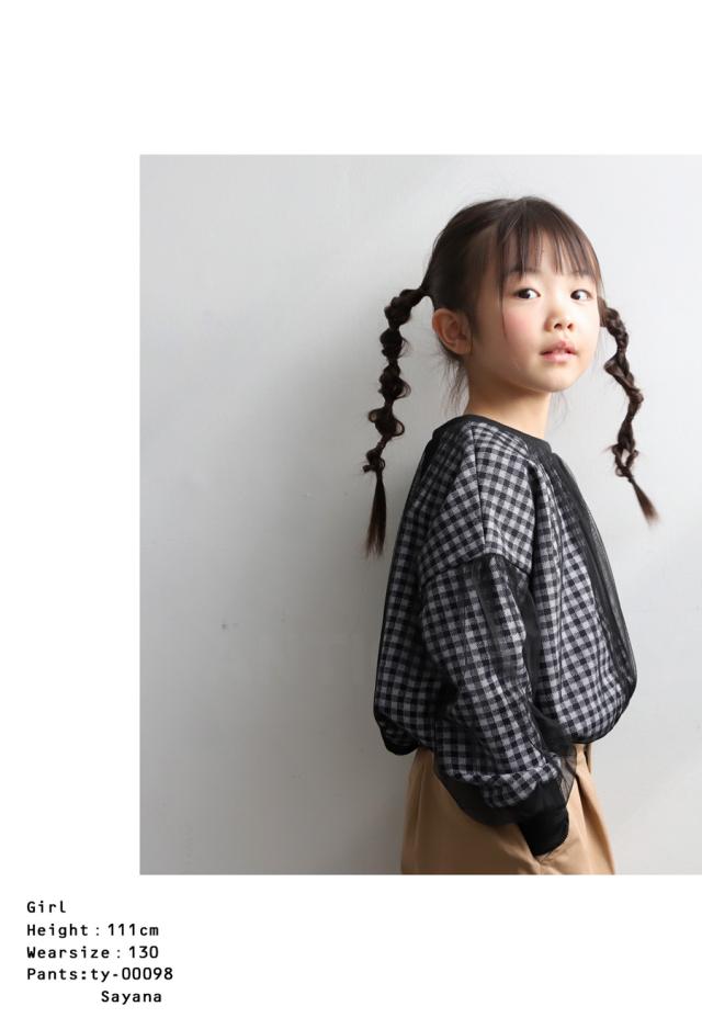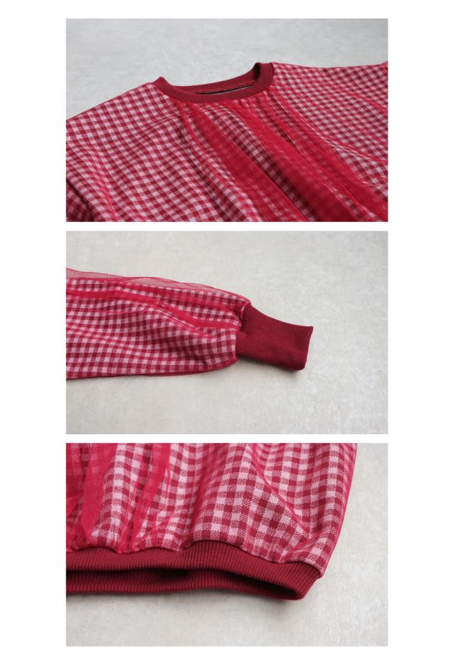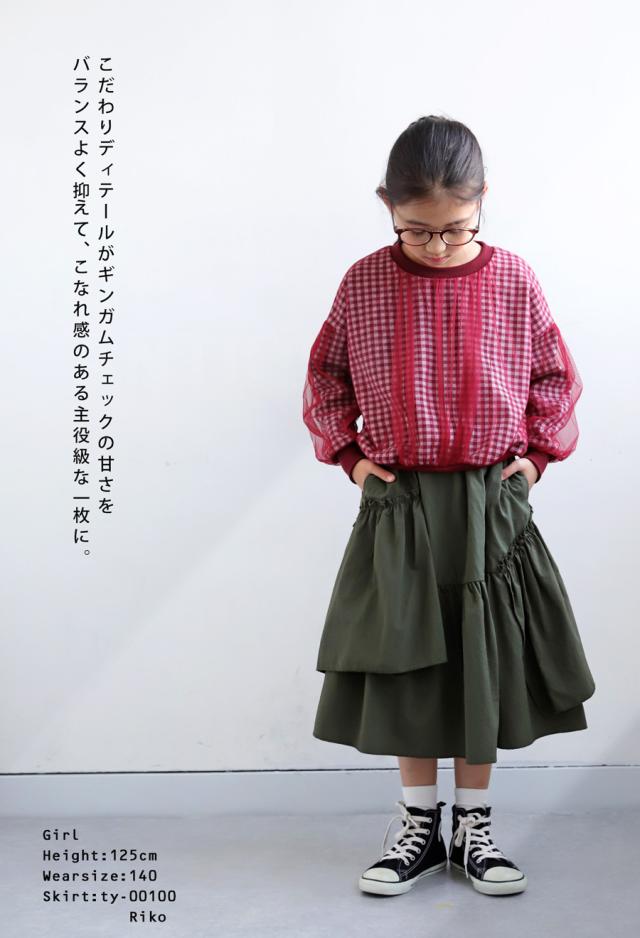mra-0003 キッズ 子供服 女の子 ジュニア 低学年 高学年 長袖 丸首 クルーネック ギンガムチェック 柄トップス 柄 チュール デザイントップス リブ プルオーバー ゆったり きれいめ
