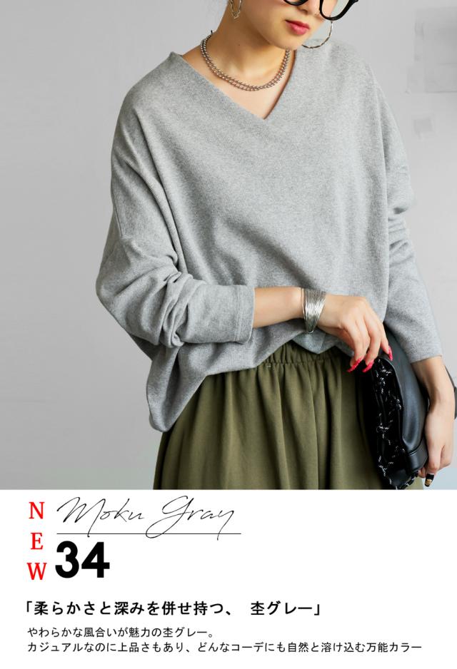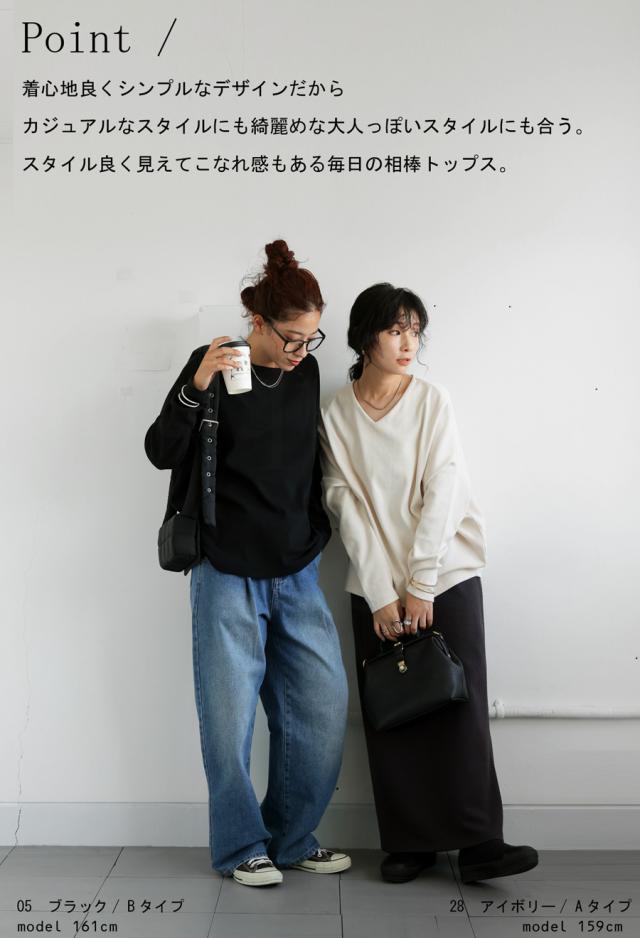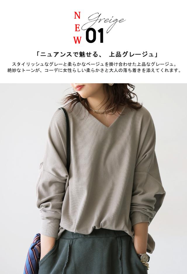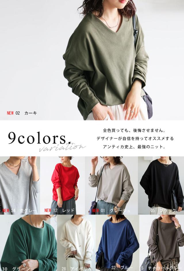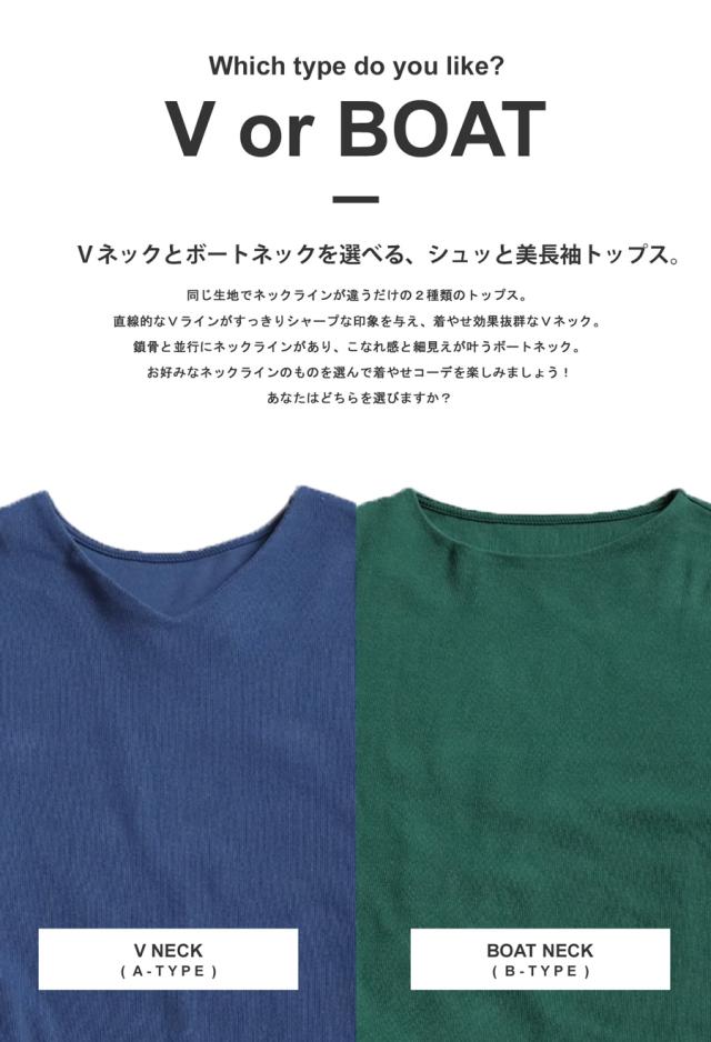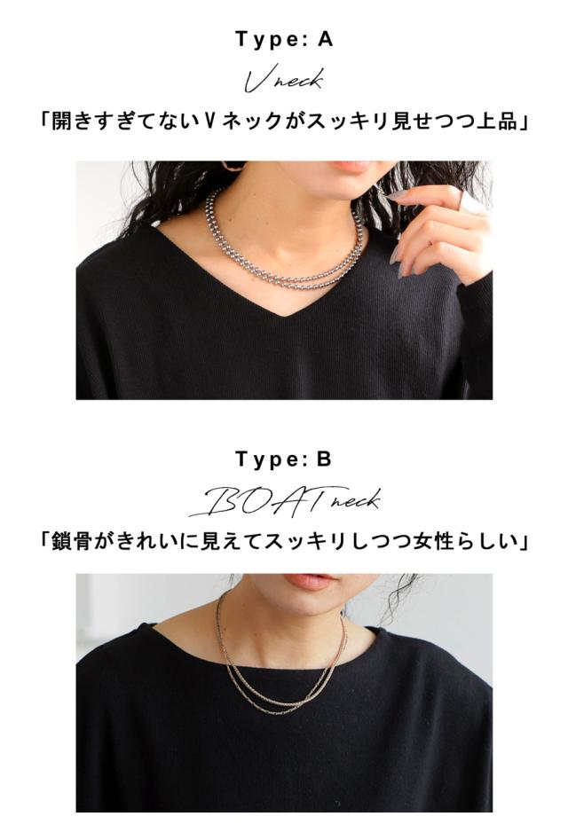 顔周りをすっきり見せてくれるVネックタイプと、女性らしい柔らかさが漂うボートネックタイプ。