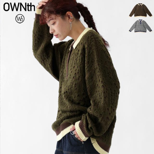 owt-0101 ポロニット トップス ポロシャツ ニット セーター ジャガードニット バイカラー 配色 ジャガード リブ ゆったり 透かし編み バイカラー レイヤード デザインニット