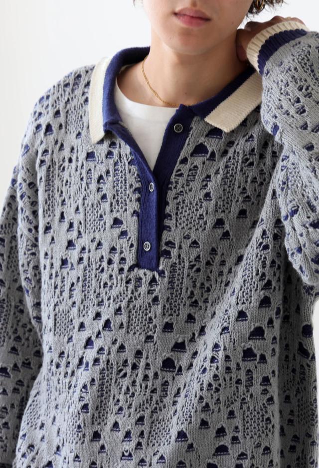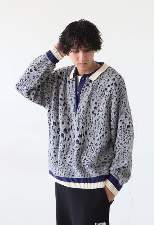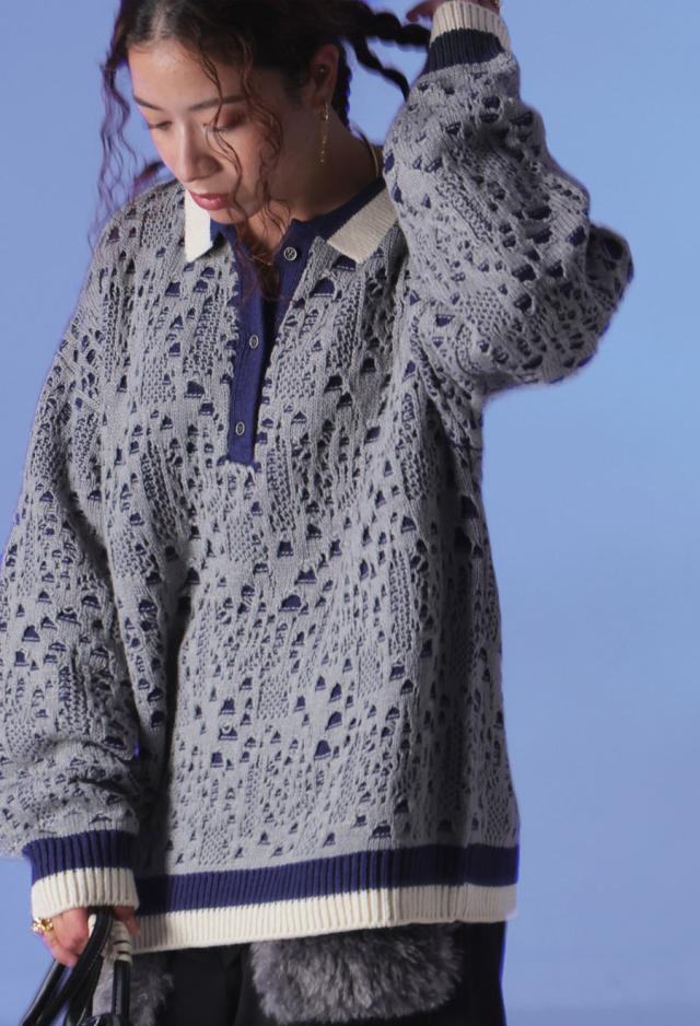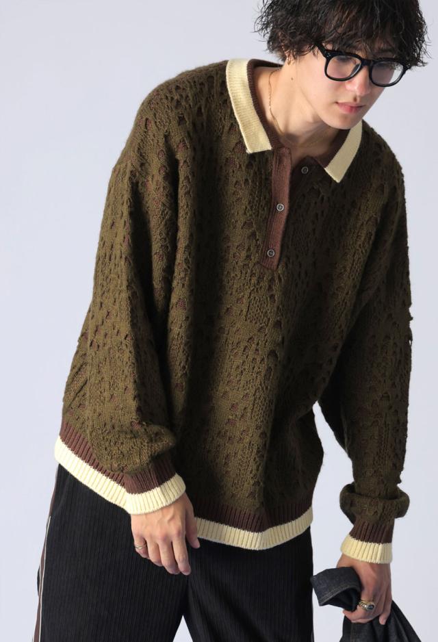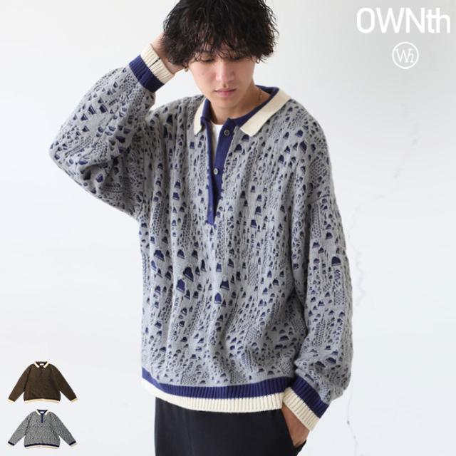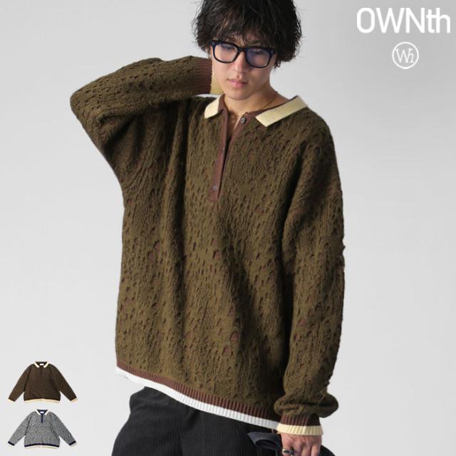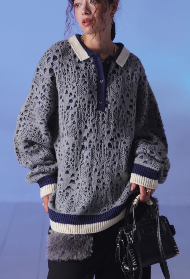 owt-0101z ポロニット トップス ポロシャツ ニット セーター ジャガードニット バイカラー 配色 ジャガード リブ ゆったり 透かし編み バイカラー レイヤード デザインニット