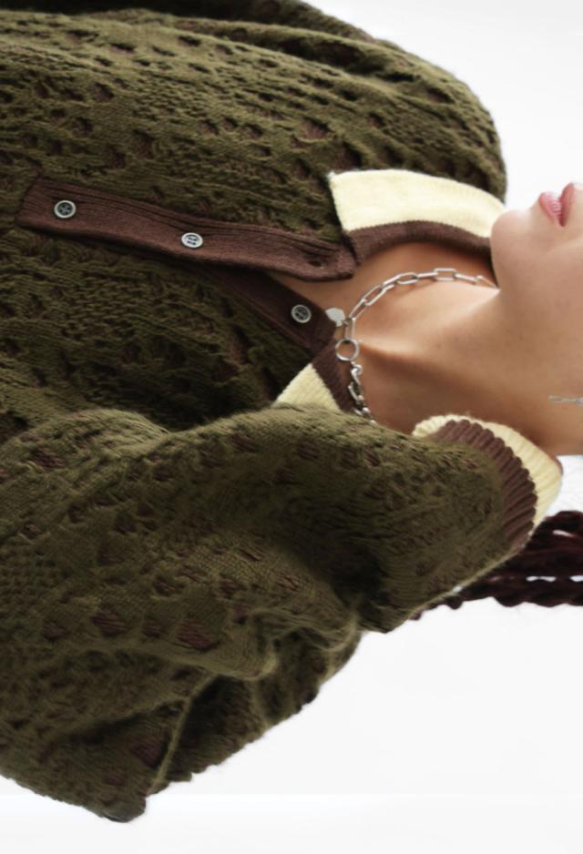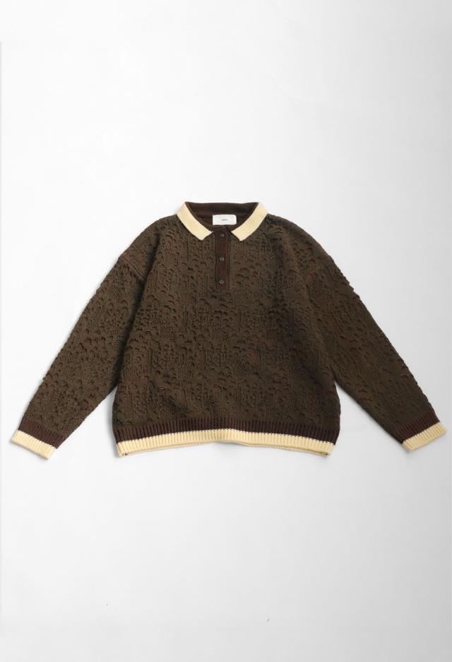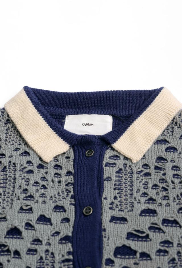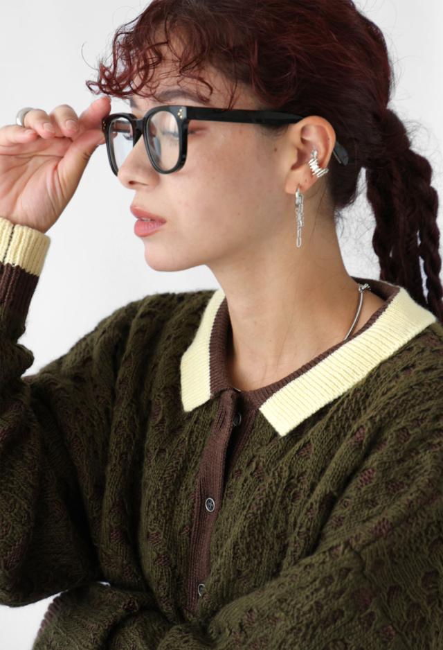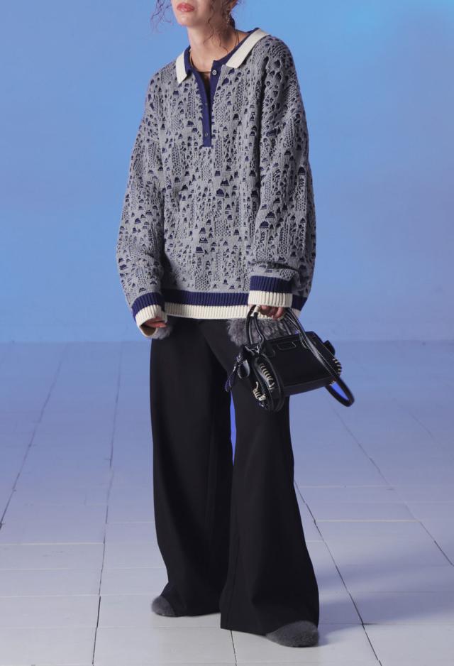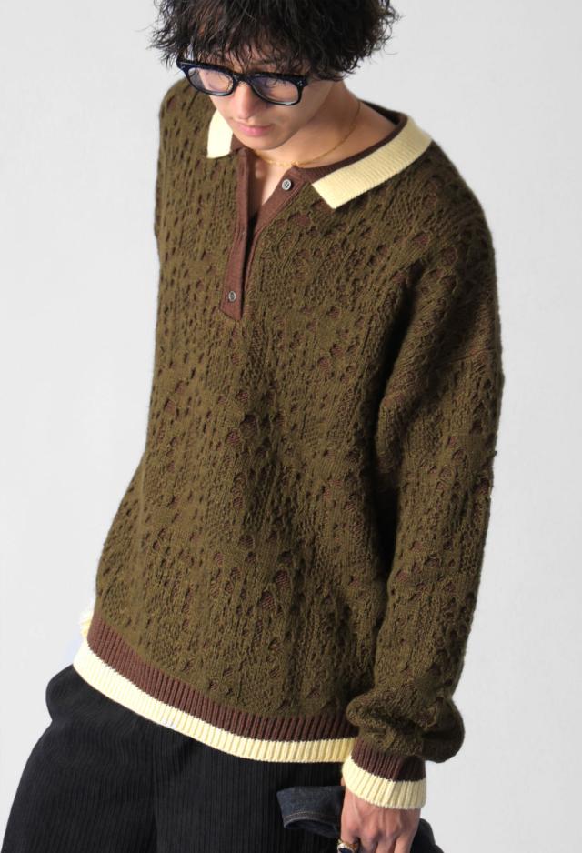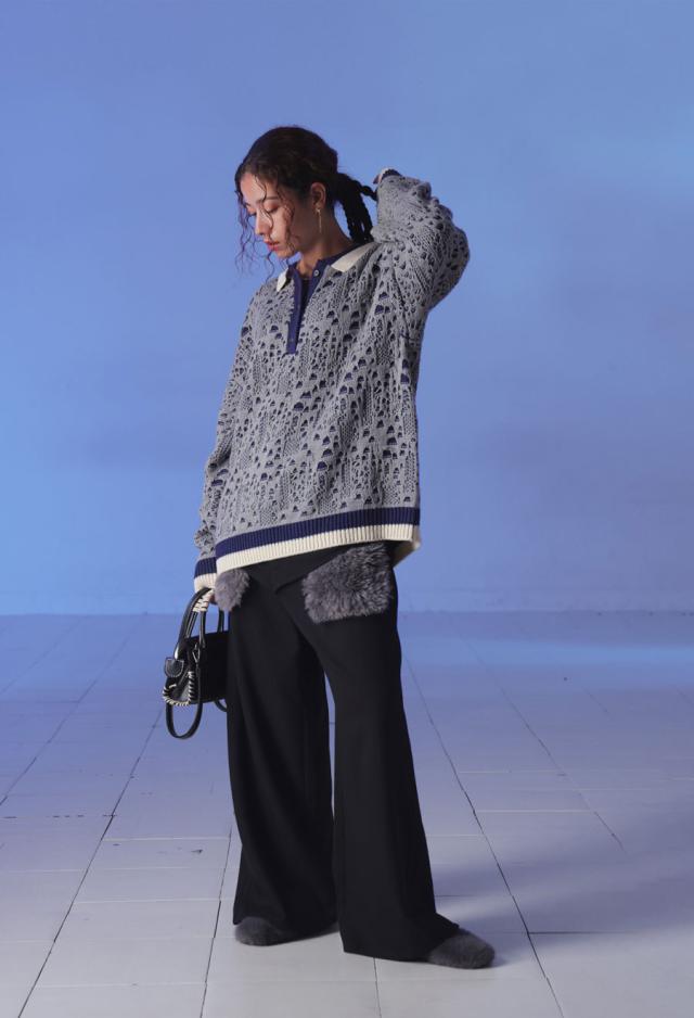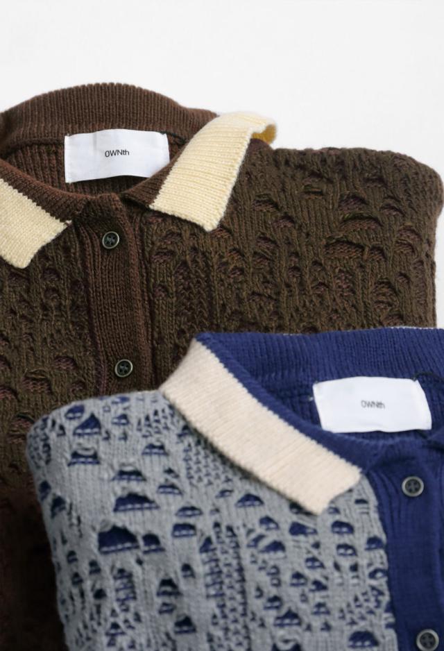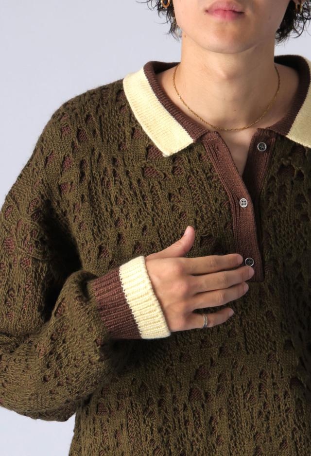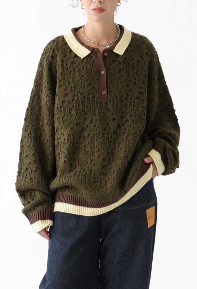 奥行きある透かし編み模様と、バイカラーのコントラストが印象的なポロニットトップスです。