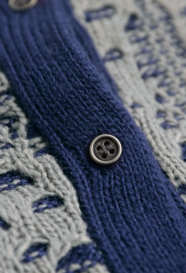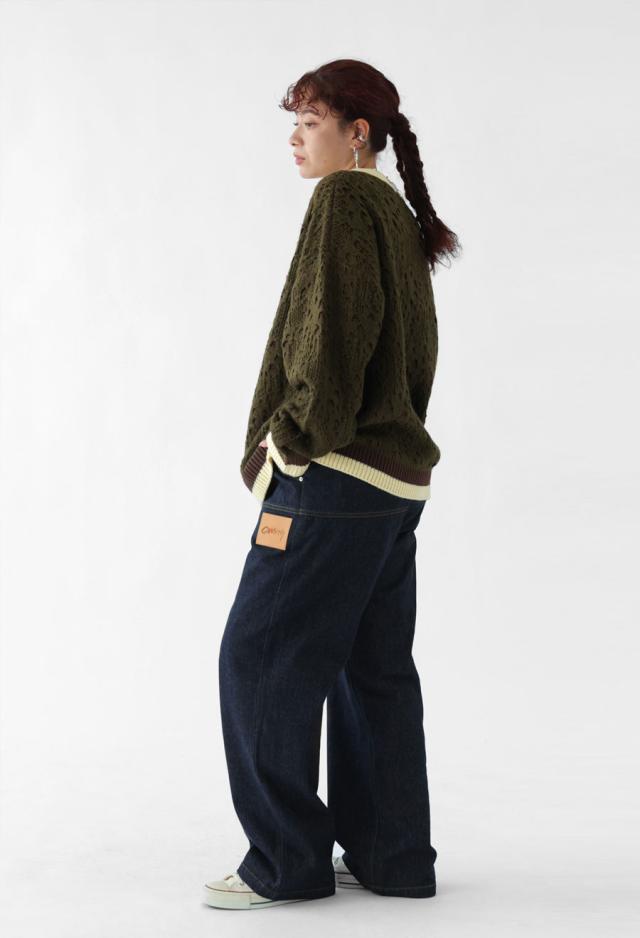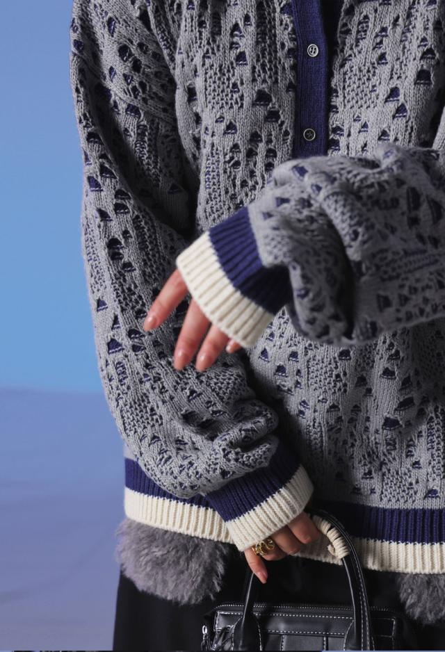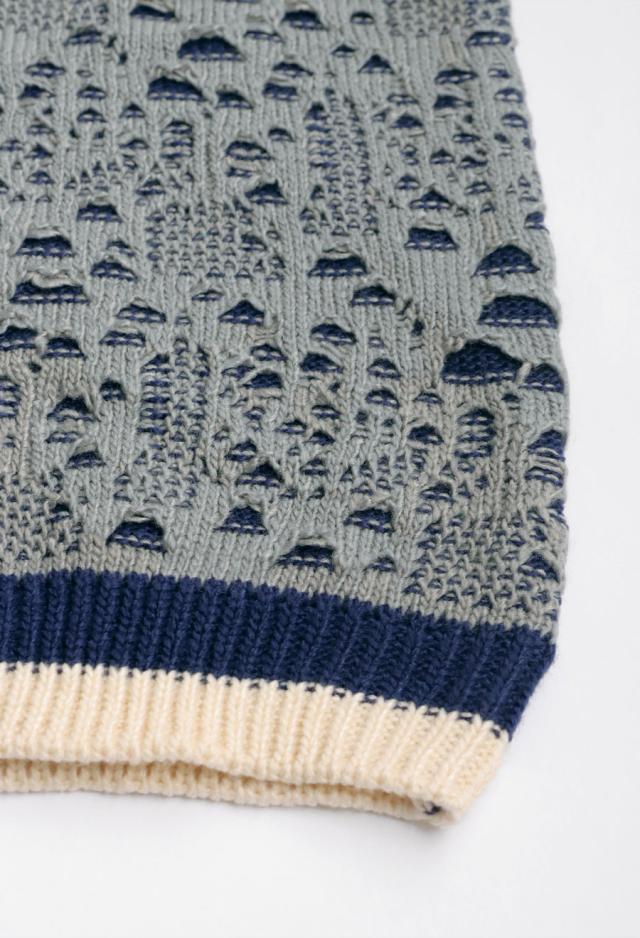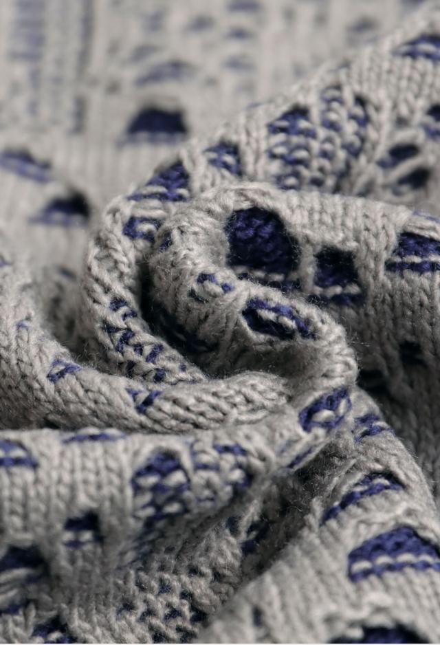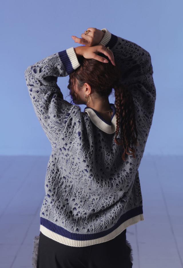 全体に広がる透かし編み柄が印象的で、ベースのニットに陰影を加え、ニュアンスある表情を演出します。
