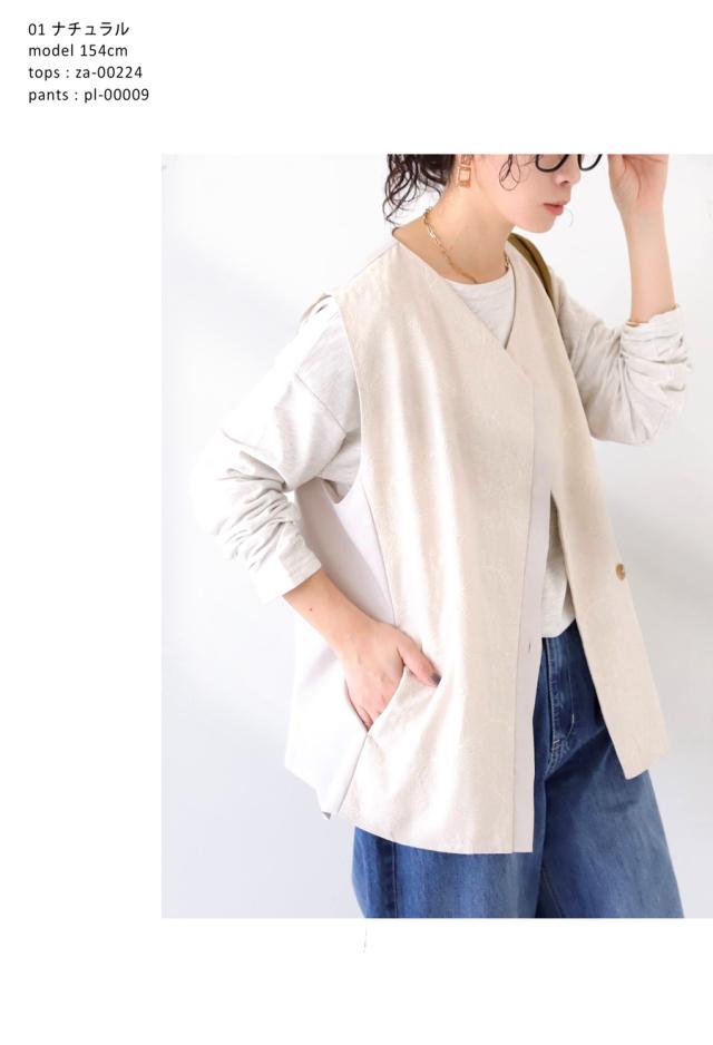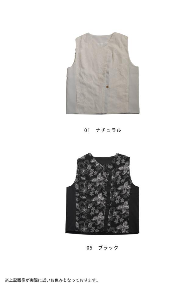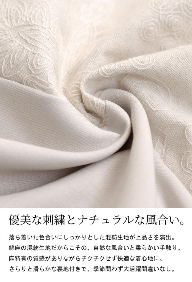 pk-01284 ノースリーブ 刺繍 柄 ボタニカル 花 無地 切り替え Vネック 前開き マーブルボタン レイヤード 重ね着 ポケット付き 裏地付き ゆったり 綿 コットン 麻 シンプル レトロ