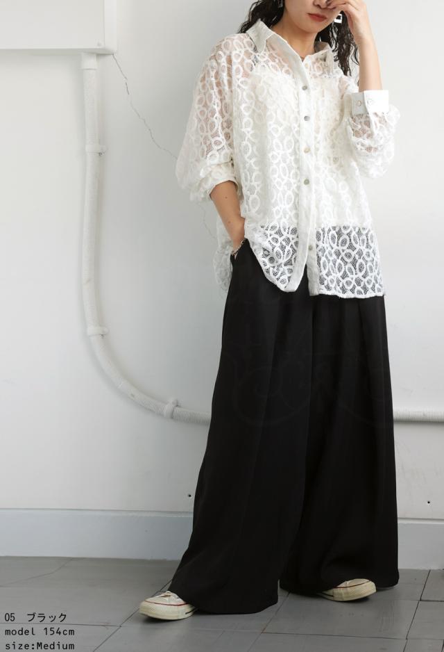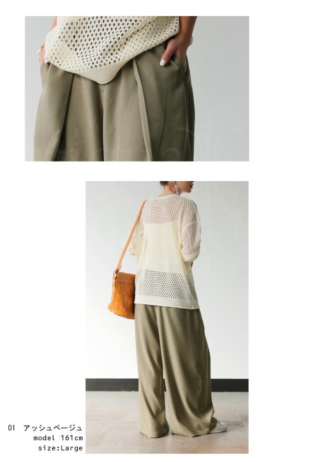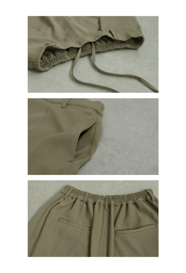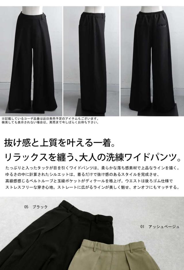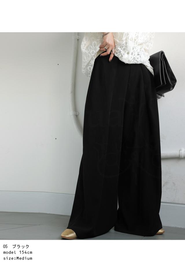 柔らかな落ち感素材で上品なラインを描くワイドパンツ。