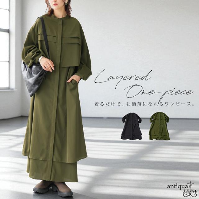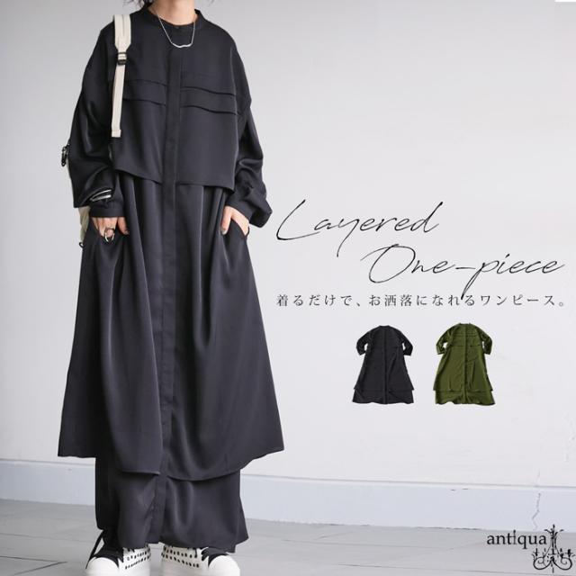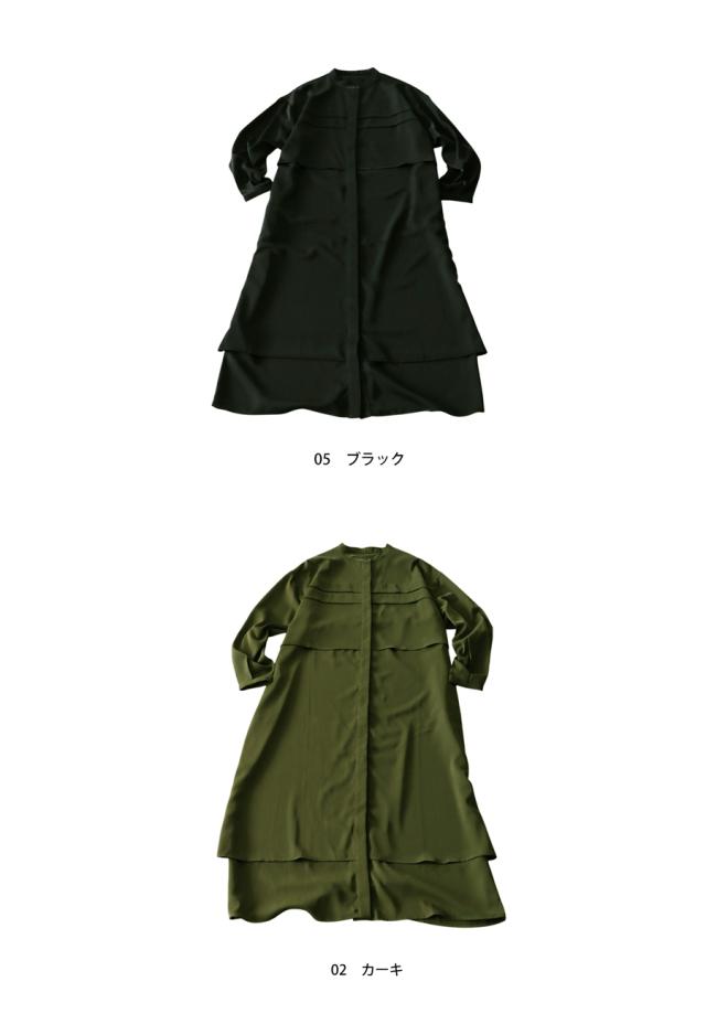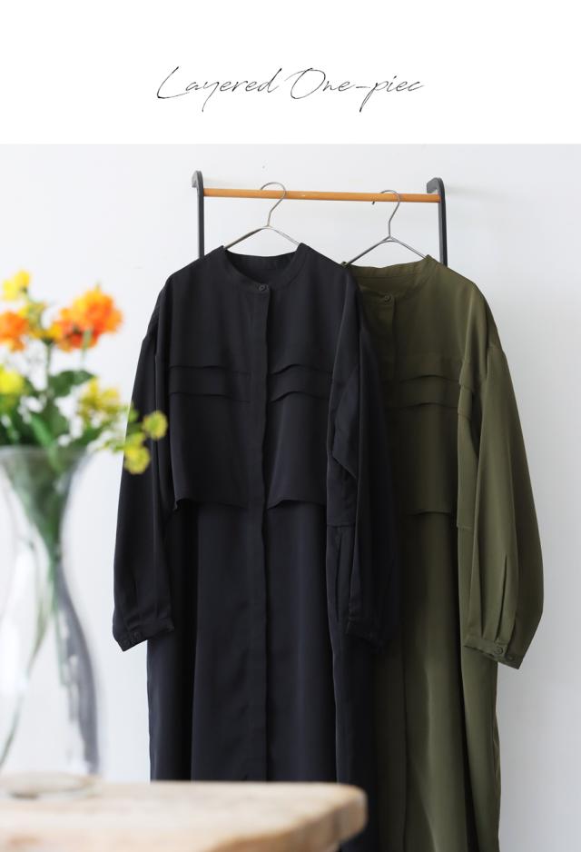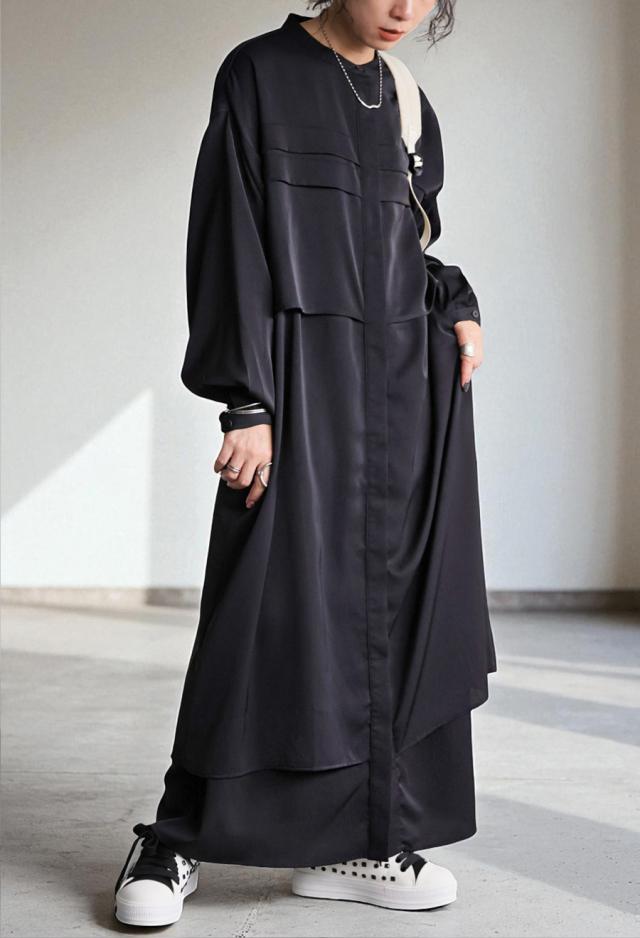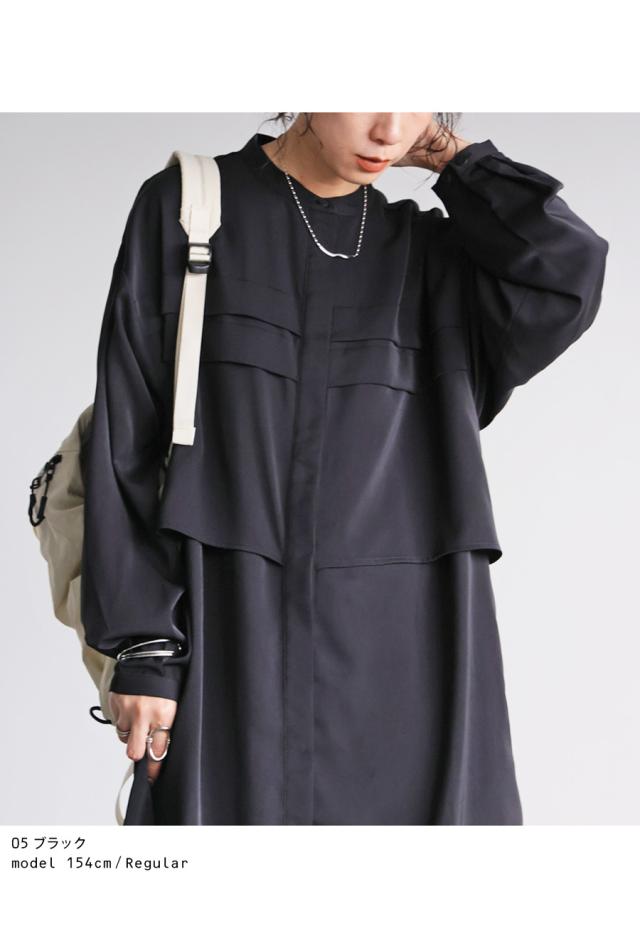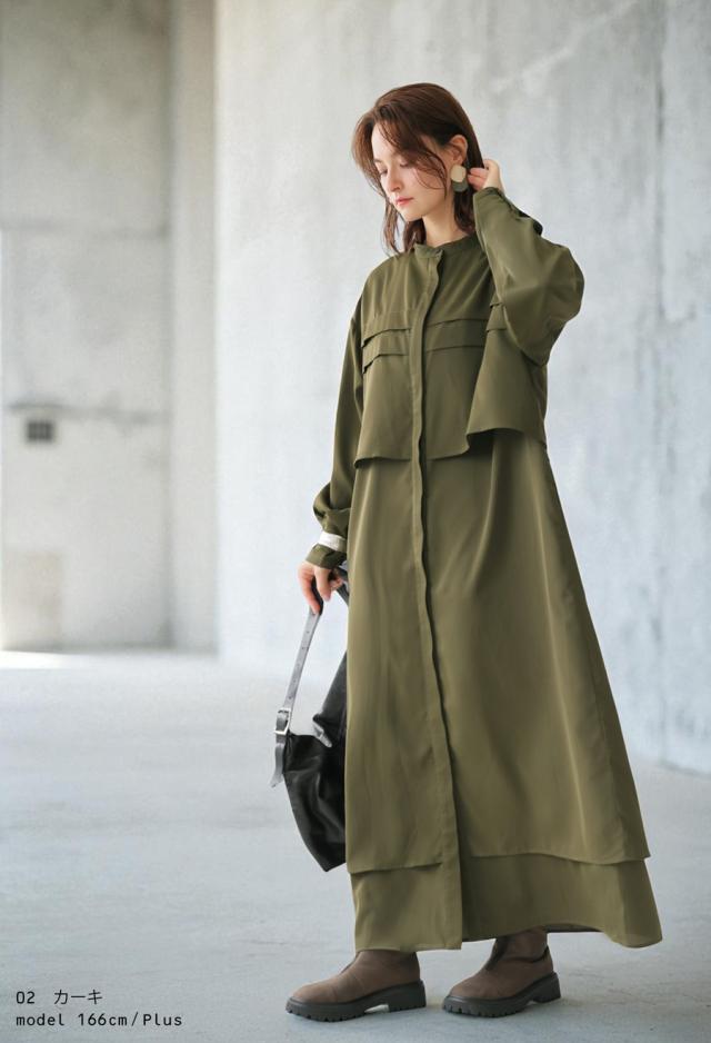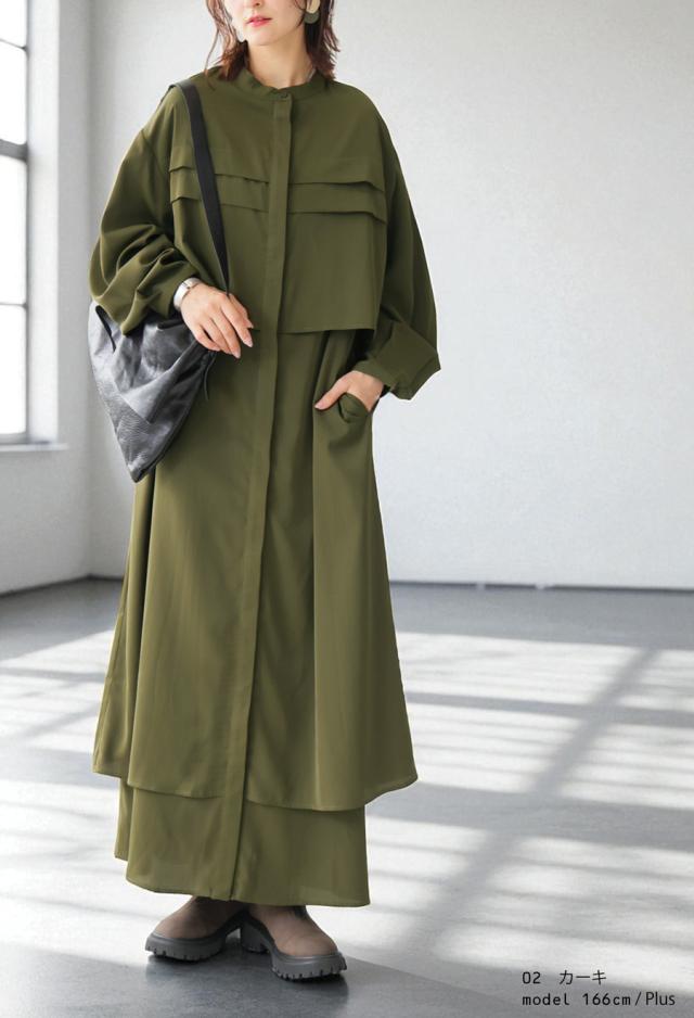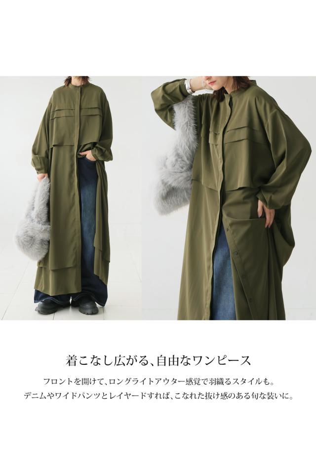 pk-01326 ワンピ ロングワンピース ロング 長袖 比翼 バンドカラー タック Iライン ストレートライン 体型カバー タック 落ち感 前開き 無地 モード感 裏地付き ポケット付き