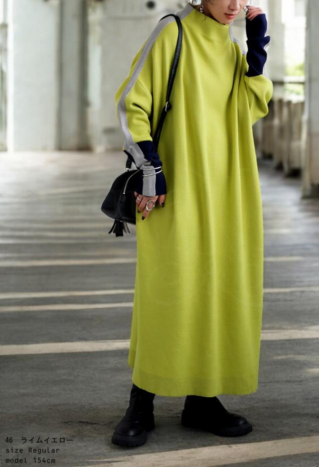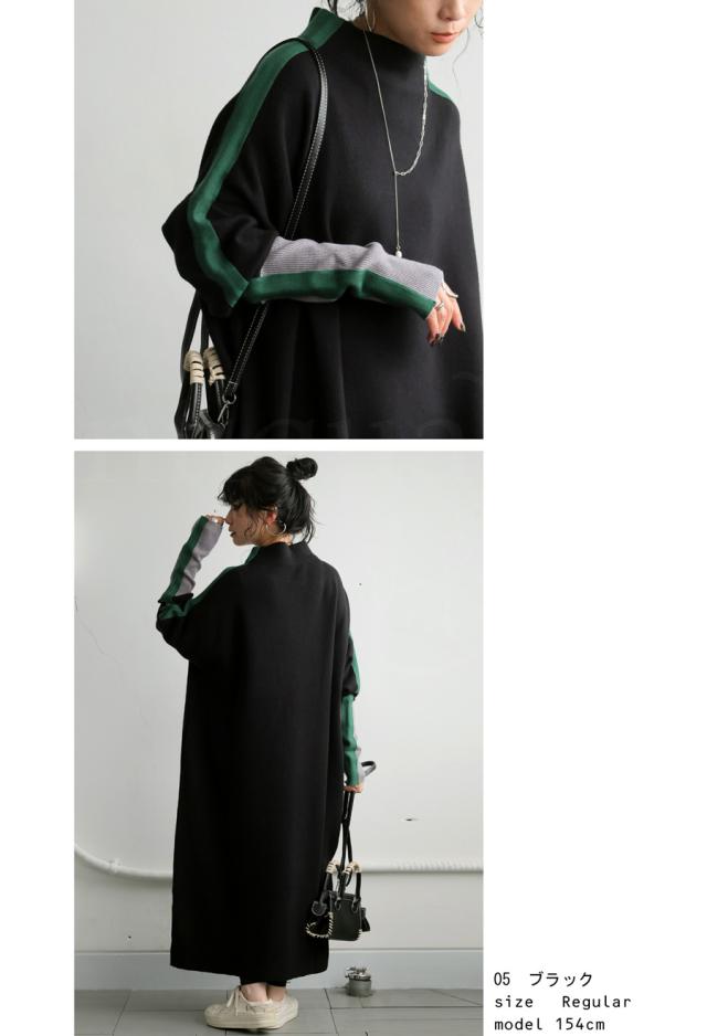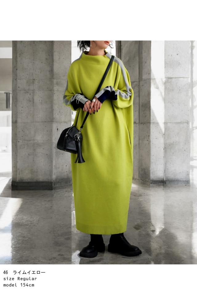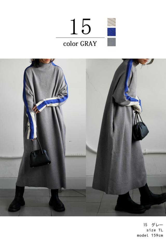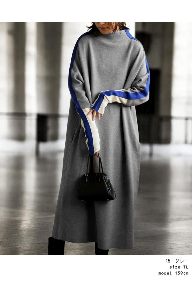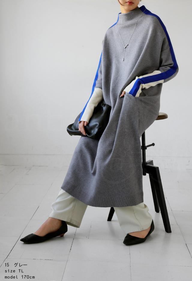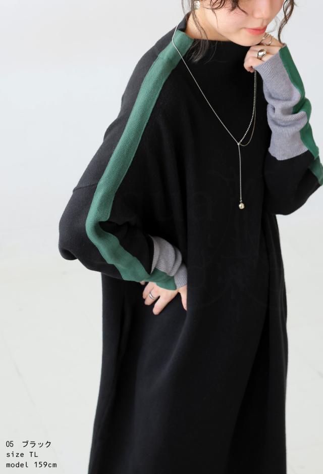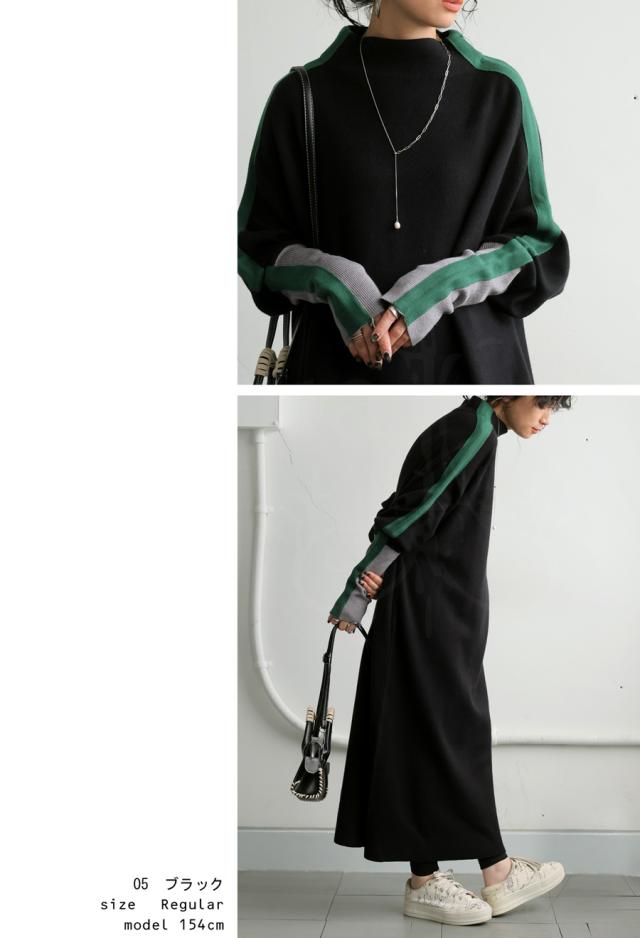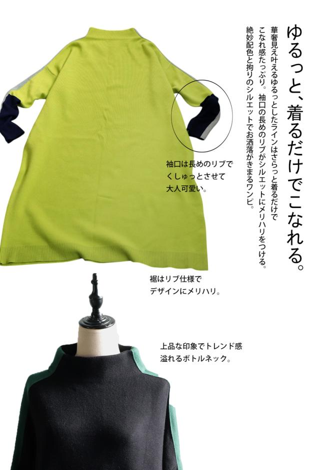 pn-00533 長袖 ライン配色 ゆったり ボトルネック ハイネック マシュマロタッチ ニット ニットワンピ ニットワンピース きれいめ プルオーバー シンプル 高級感 ダブルジャガード