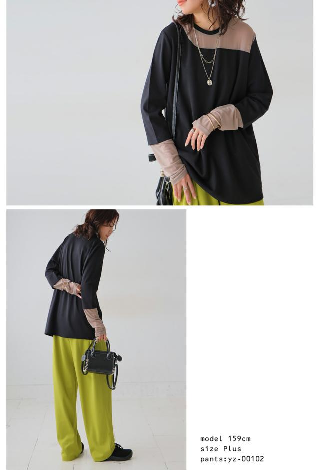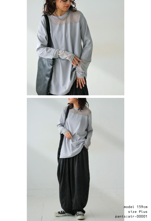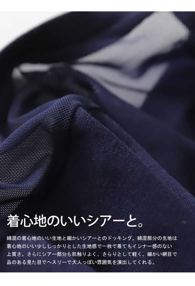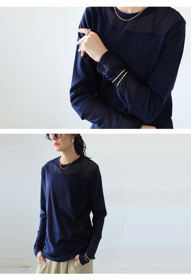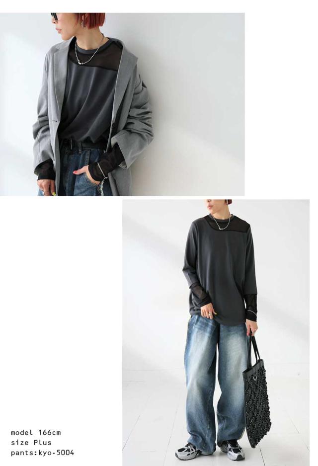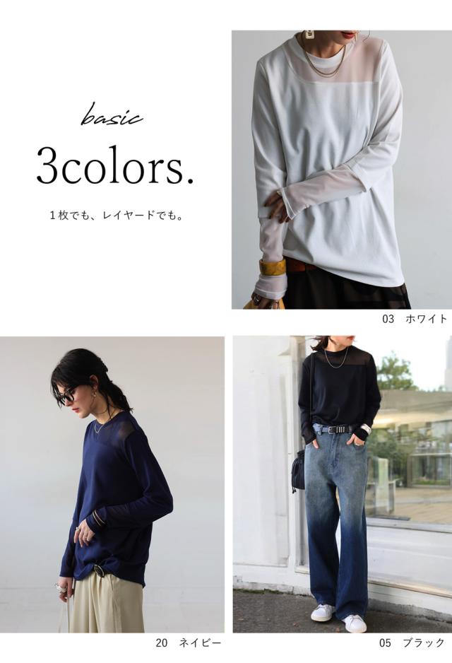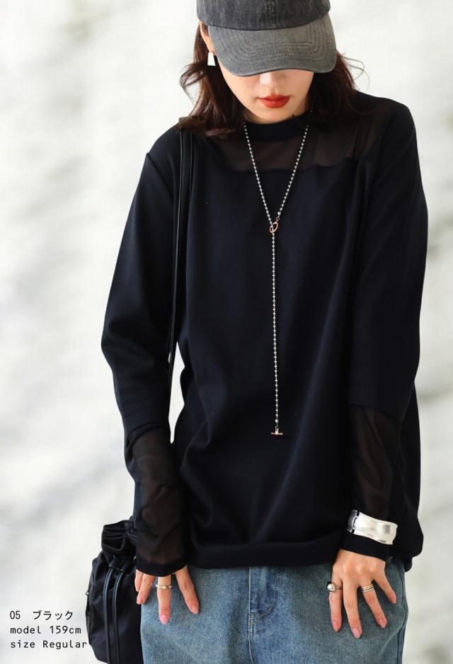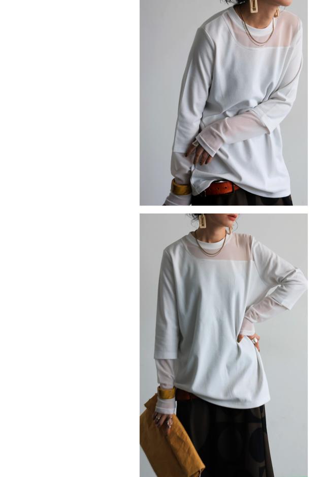 pn-00545 切り替え 異素材 ドッキング シアー 綿 コットン 丸首 クルーネック シンプル 着回し アレンジ デイリー使い レイヤード 抜け感 透け感 肌見せ ヘルシー オーバーサイズ