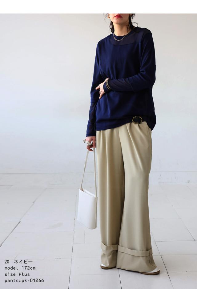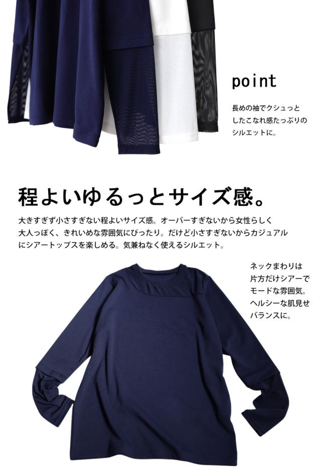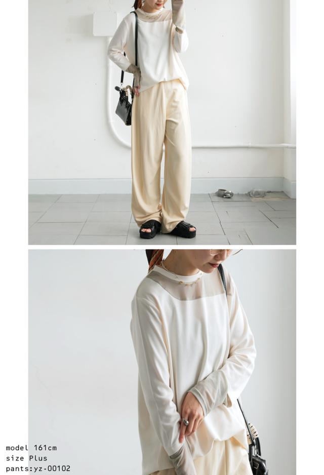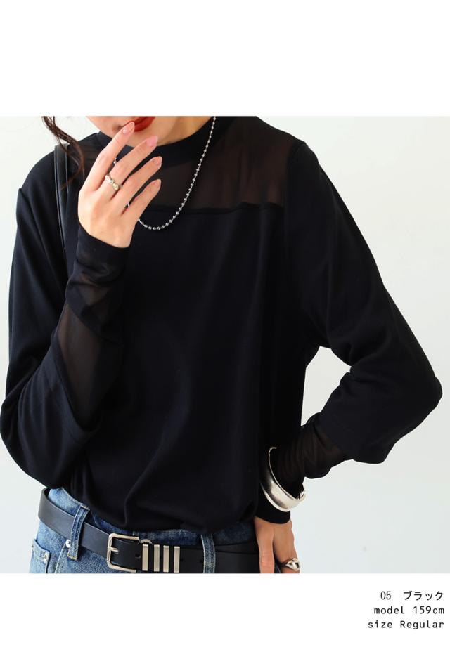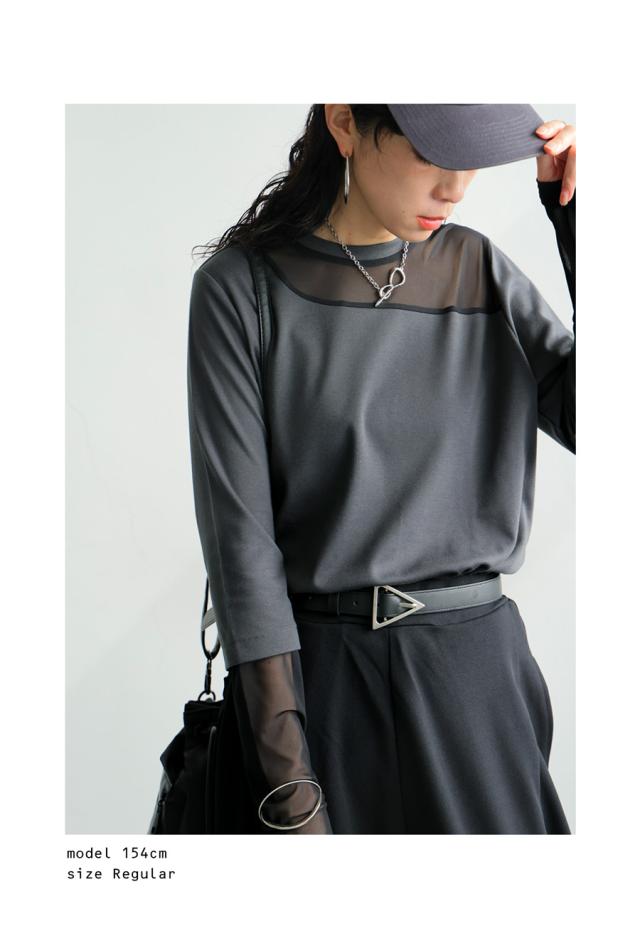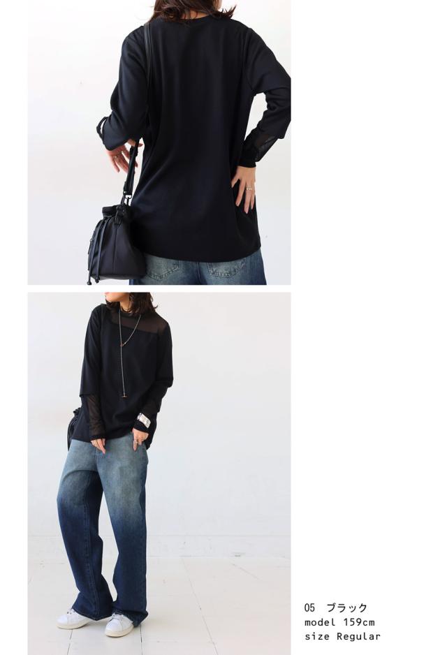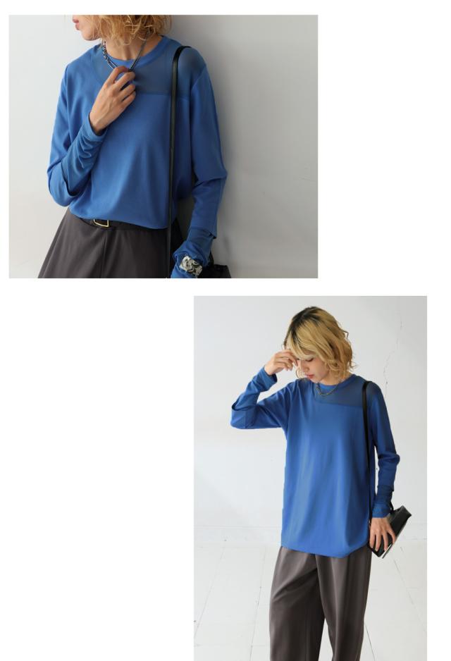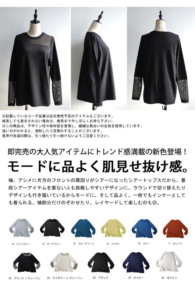 pn-00545 切り替え 異素材 ドッキング シアー 綿 コットン 丸首 クルーネック シンプル 着回し アレンジ デイリー使い レイヤード 抜け感 透け感 肌見せ ヘルシー オーバーサイズ