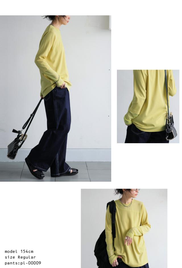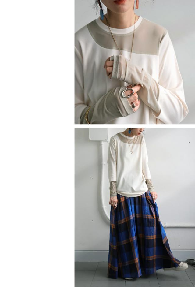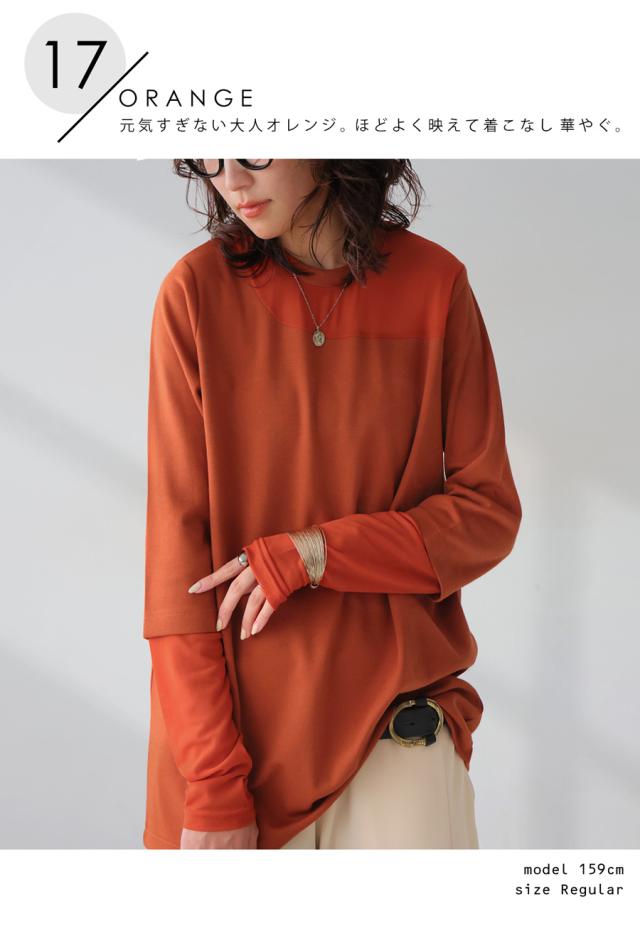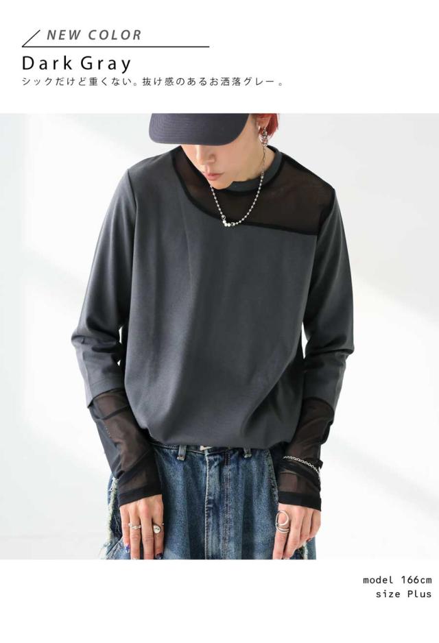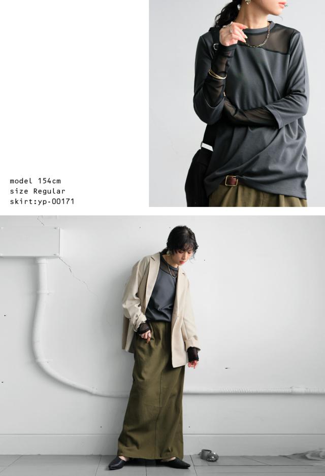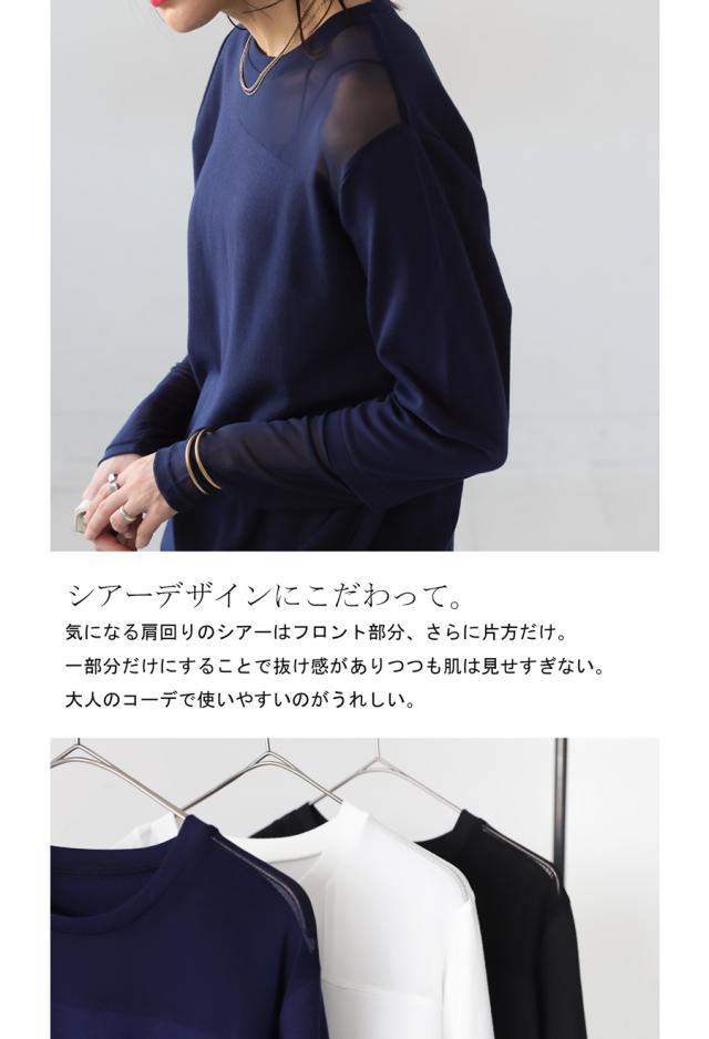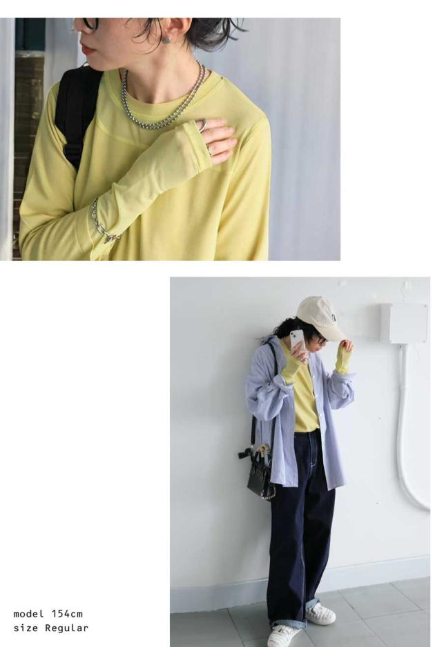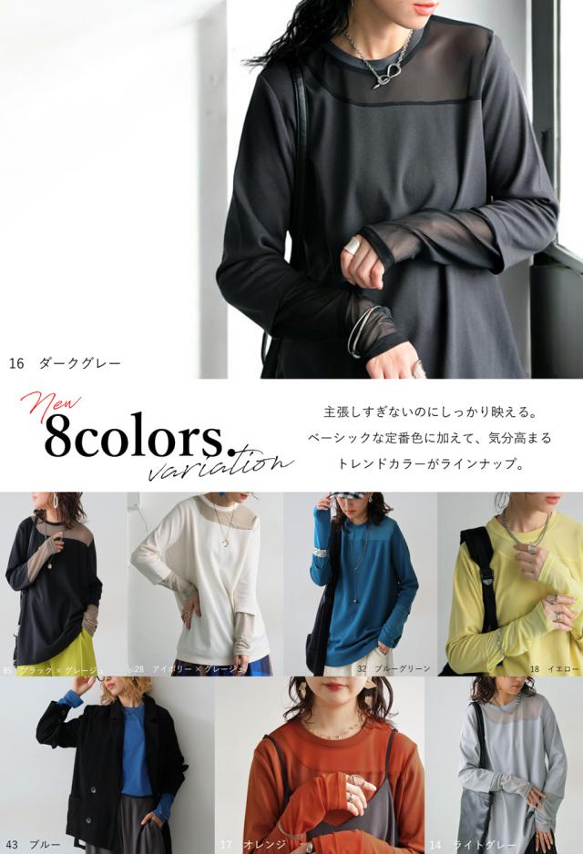 pn-00545 切り替え 異素材 ドッキング シアー 綿 コットン 丸首 クルーネック シンプル 着回し アレンジ デイリー使い レイヤード 抜け感 透け感 肌見せ ヘルシー オーバーサイズ