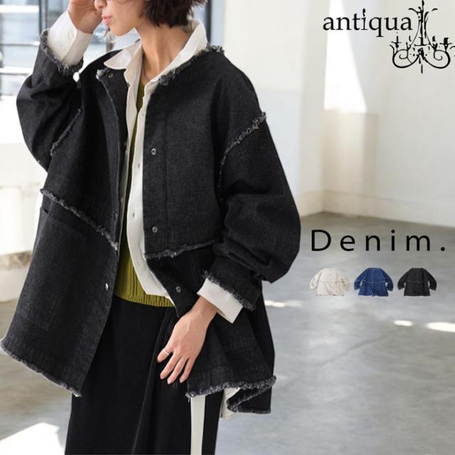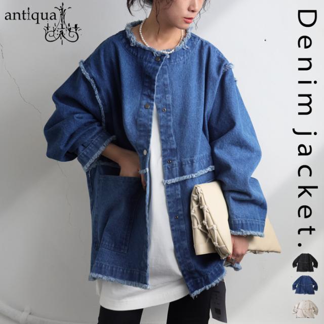 【検索ワード】デニムジャケット レディース アウター デニム ジャケット ノーカラー 丸首 長袖 フリンジ 切り替え 切りっぱなし 前開き ボタン ゆったり 綿 コットン シンプル ヴィンテージ感 古着風 体型カバー 細見え 着痩せ 大きめ 大きいサイズ antiqua アンティカ 大人 おしゃれ 10代 20代 30代 40代 50代 60代 春 秋 冬 お洒落 カジュアル かわいい かっこいい あんてぃか