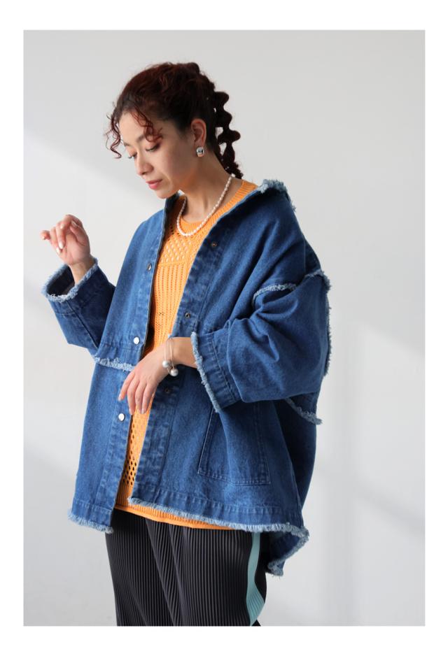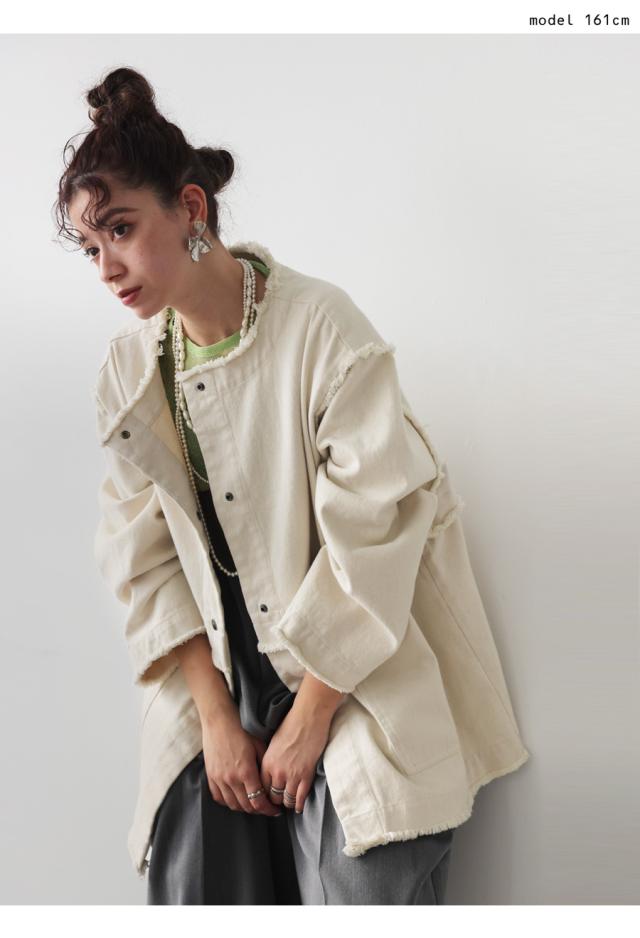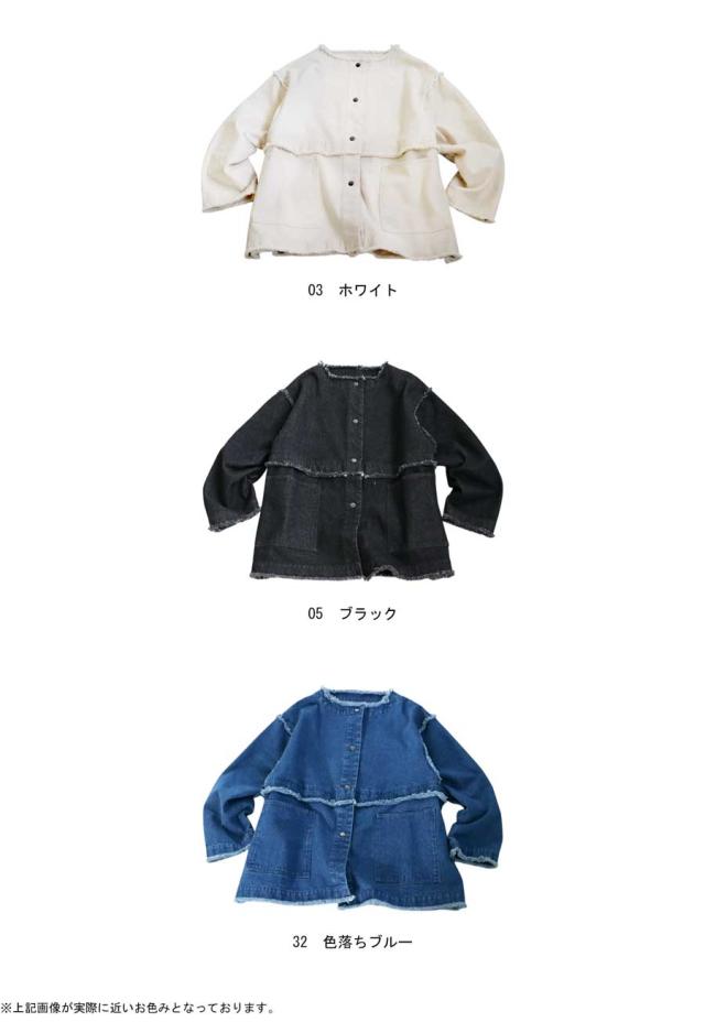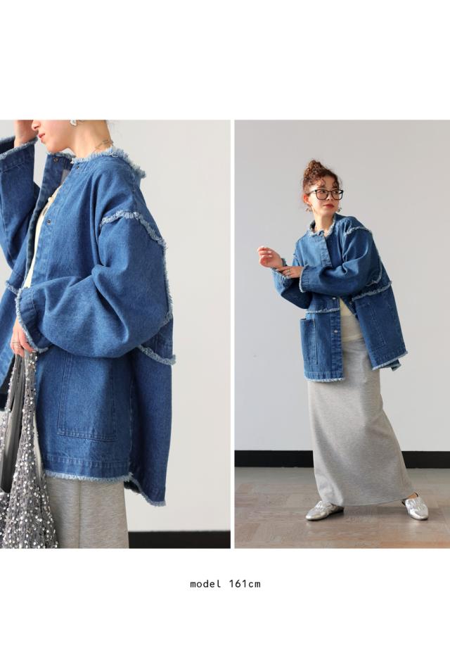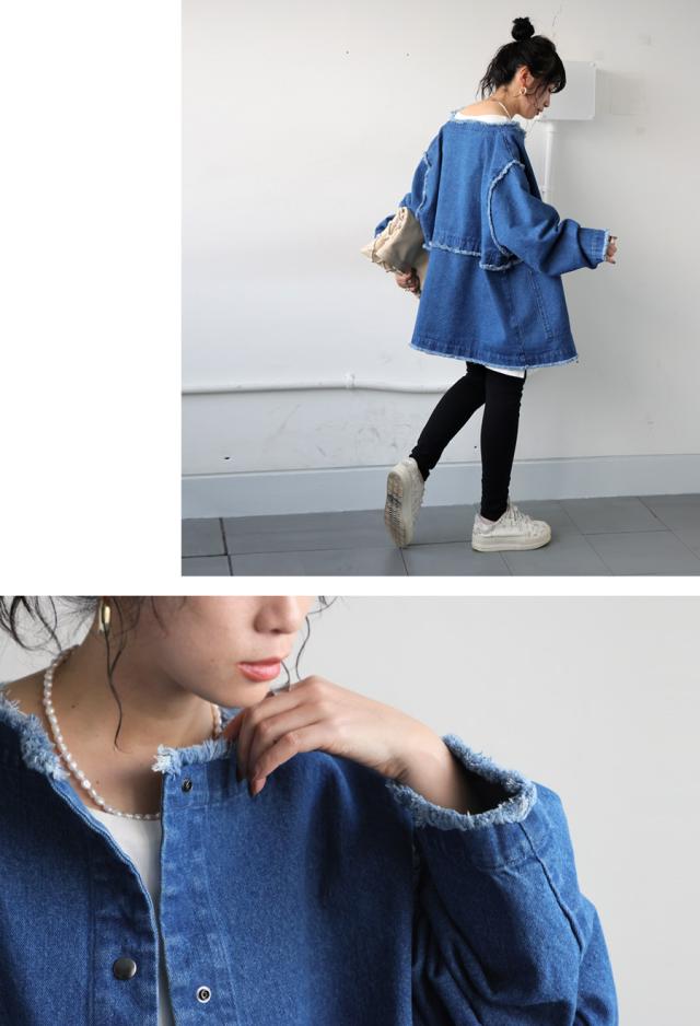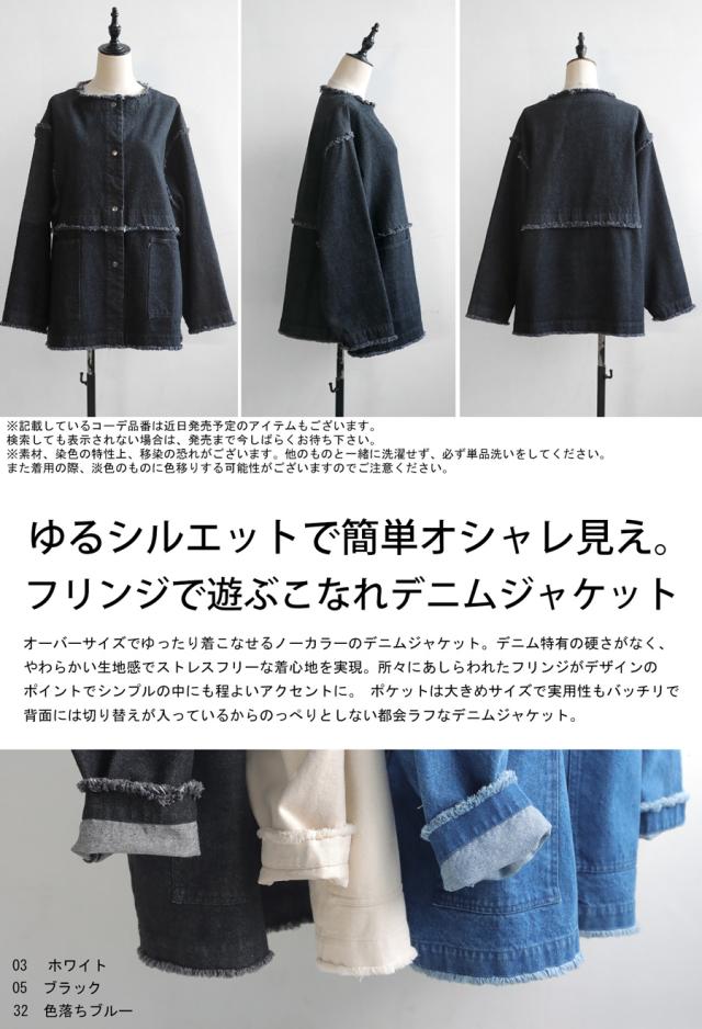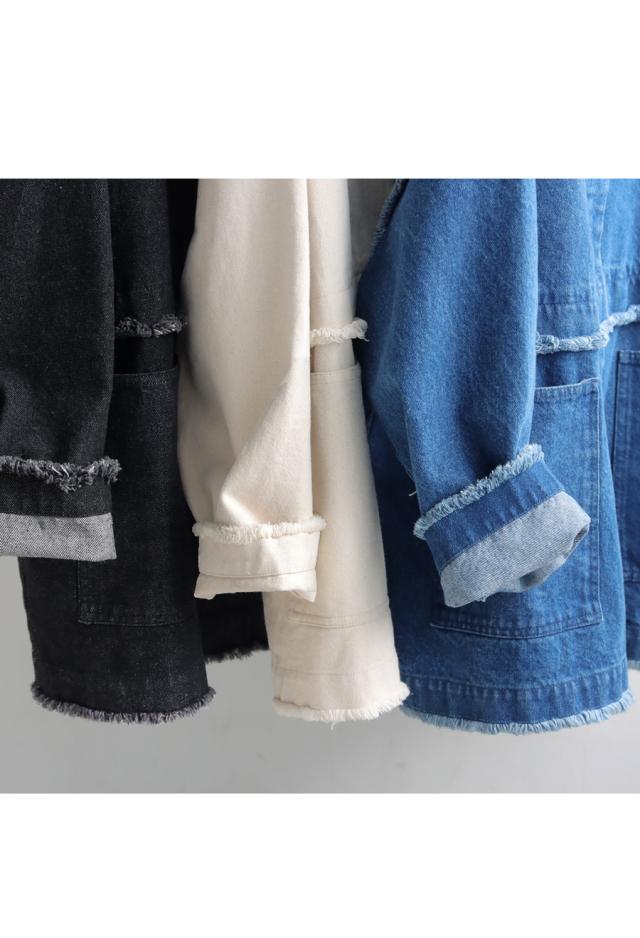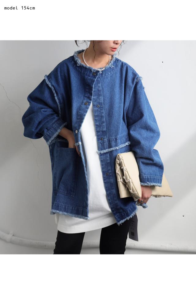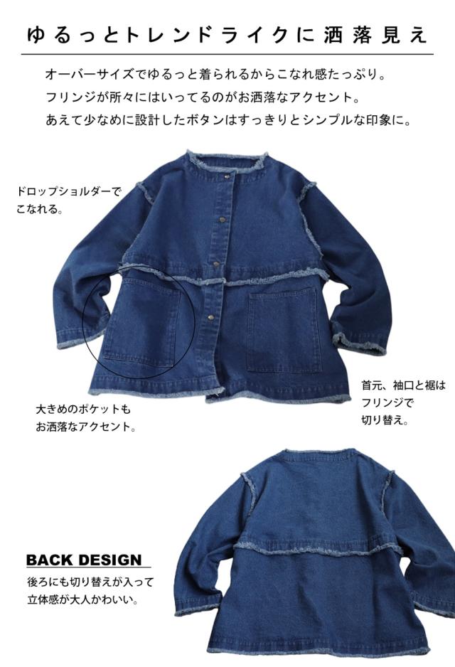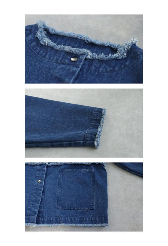 pya-00030 デニム ジャケット ノーカラー 丸首 長袖 フリンジ 切り替え 切りっぱなし 前開き ボタン ゆったり 綿 コットン シンプル ヴィンテージ感 古着風 体型カバー 細見え