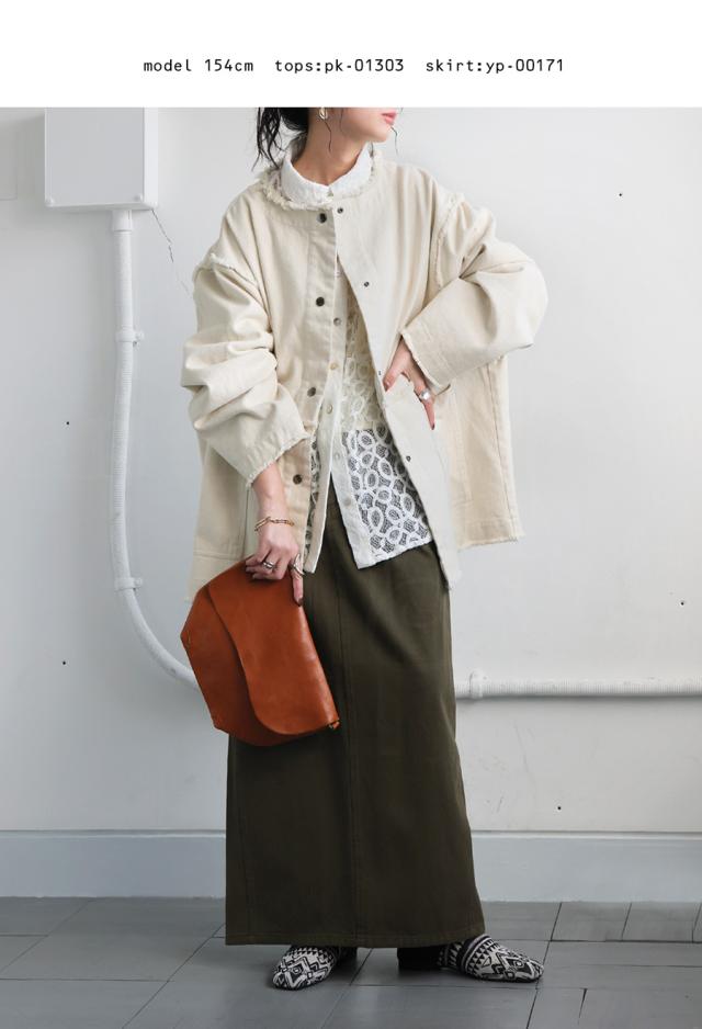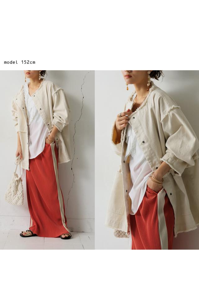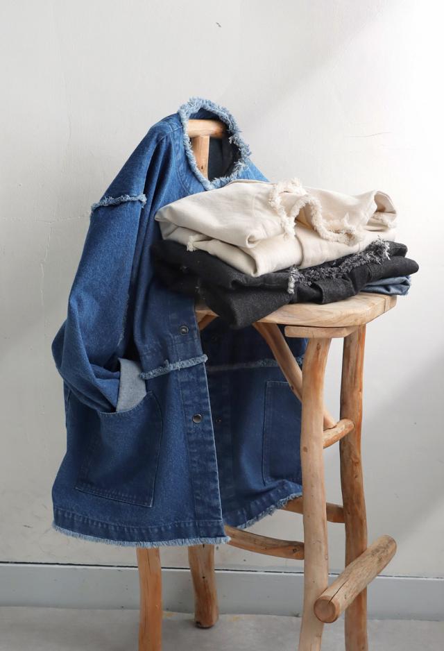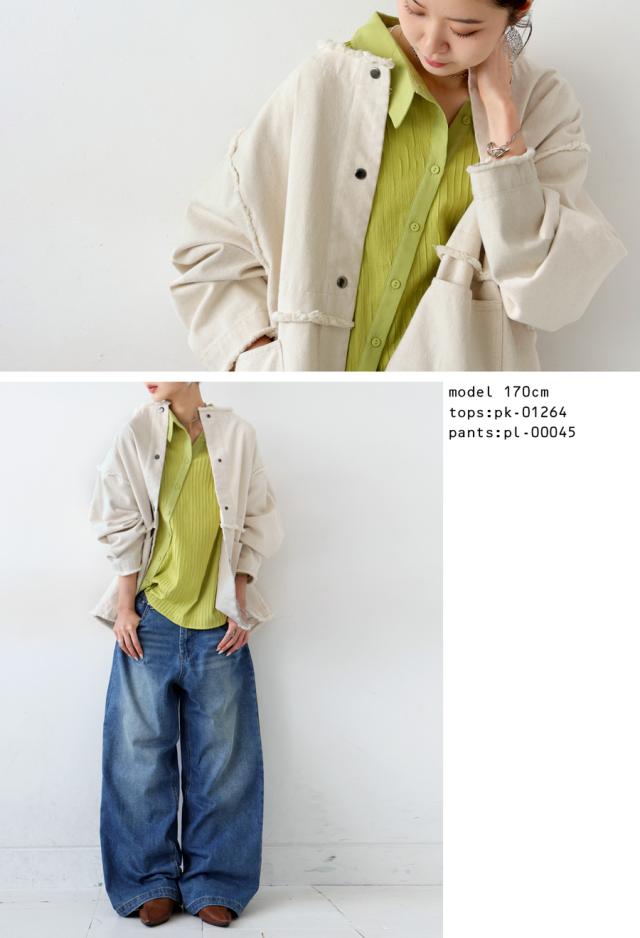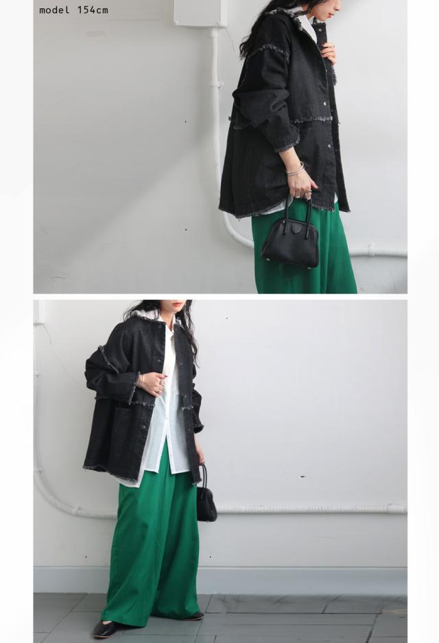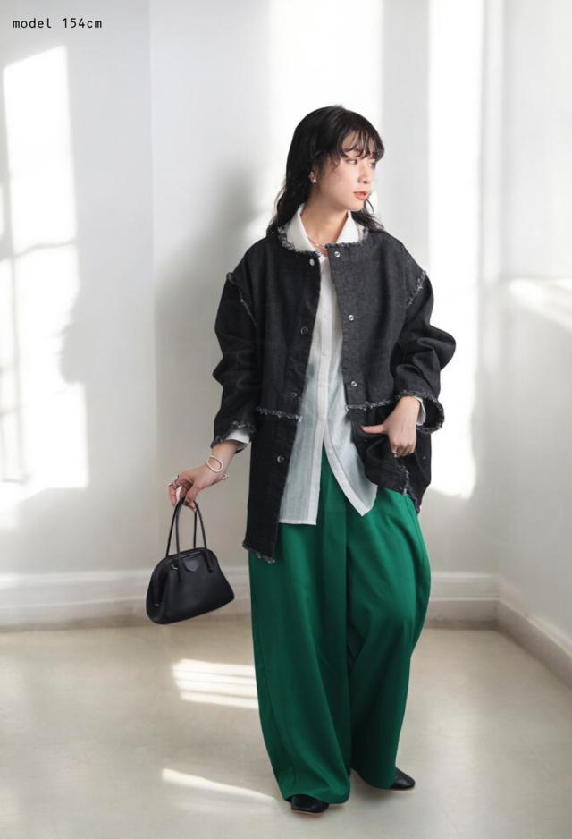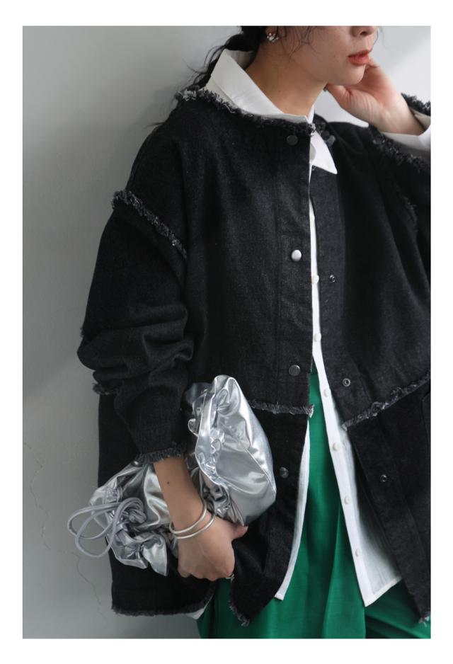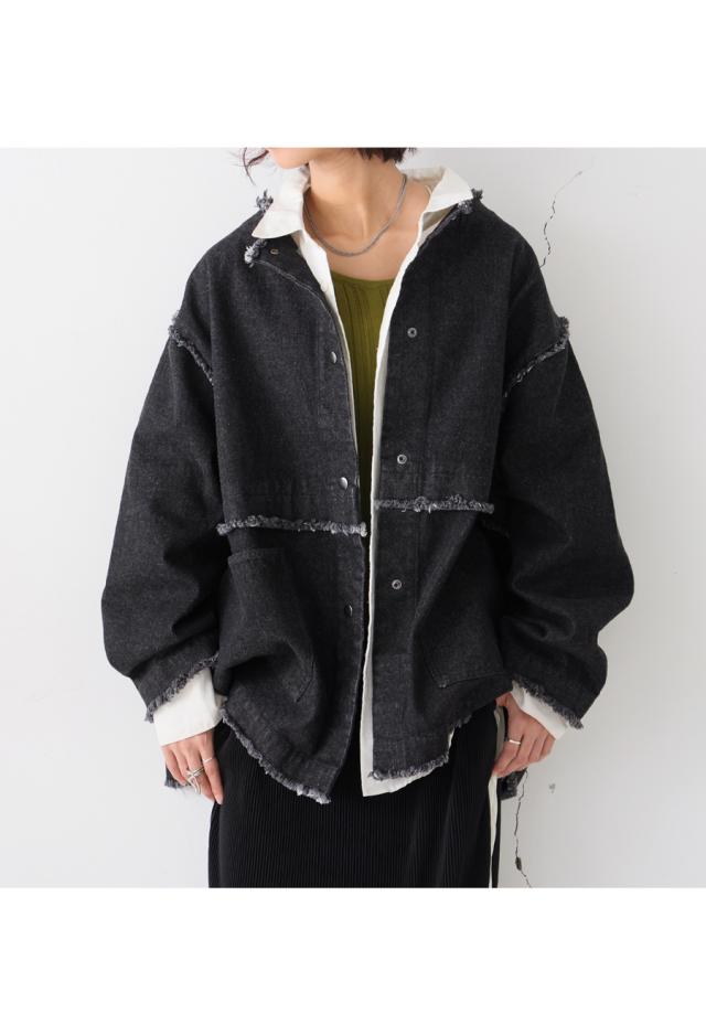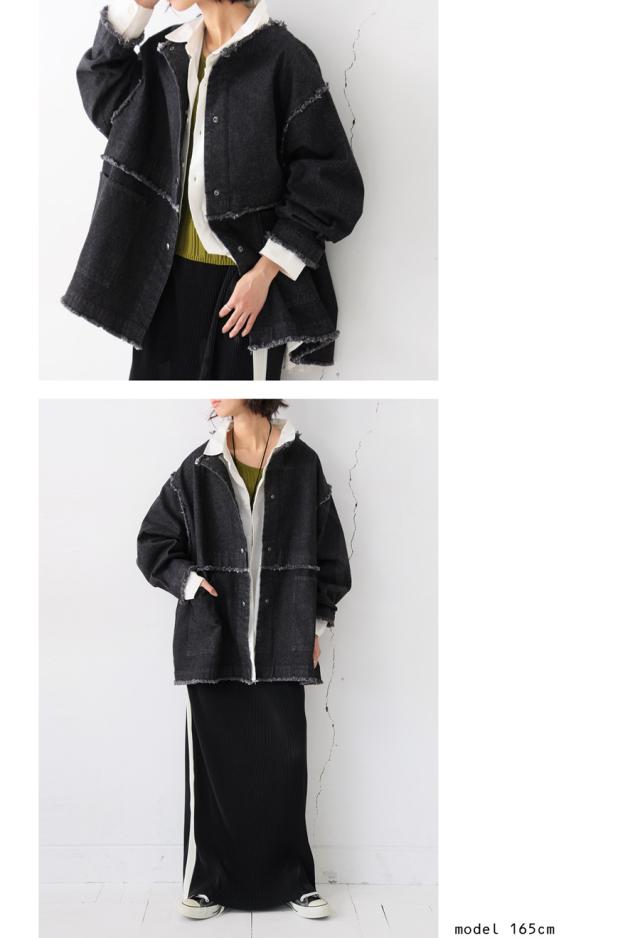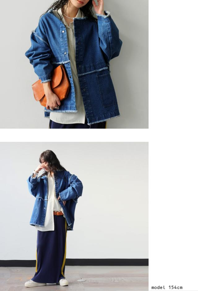 pya-00030 デニム ジャケット ノーカラー 丸首 長袖 フリンジ 切り替え 切りっぱなし 前開き ボタン ゆったり 綿 コットン シンプル ヴィンテージ感 古着風 体型カバー 細見え