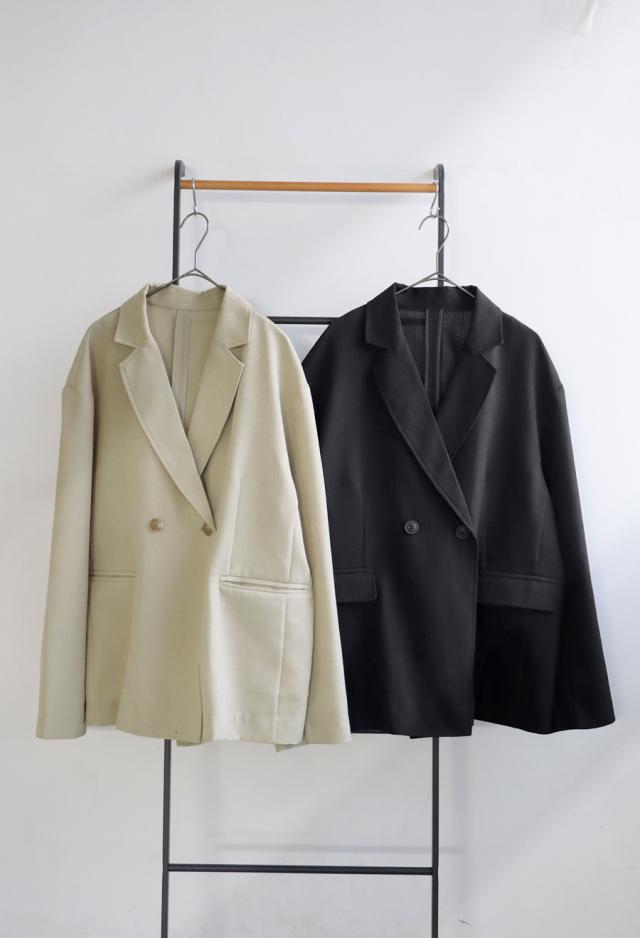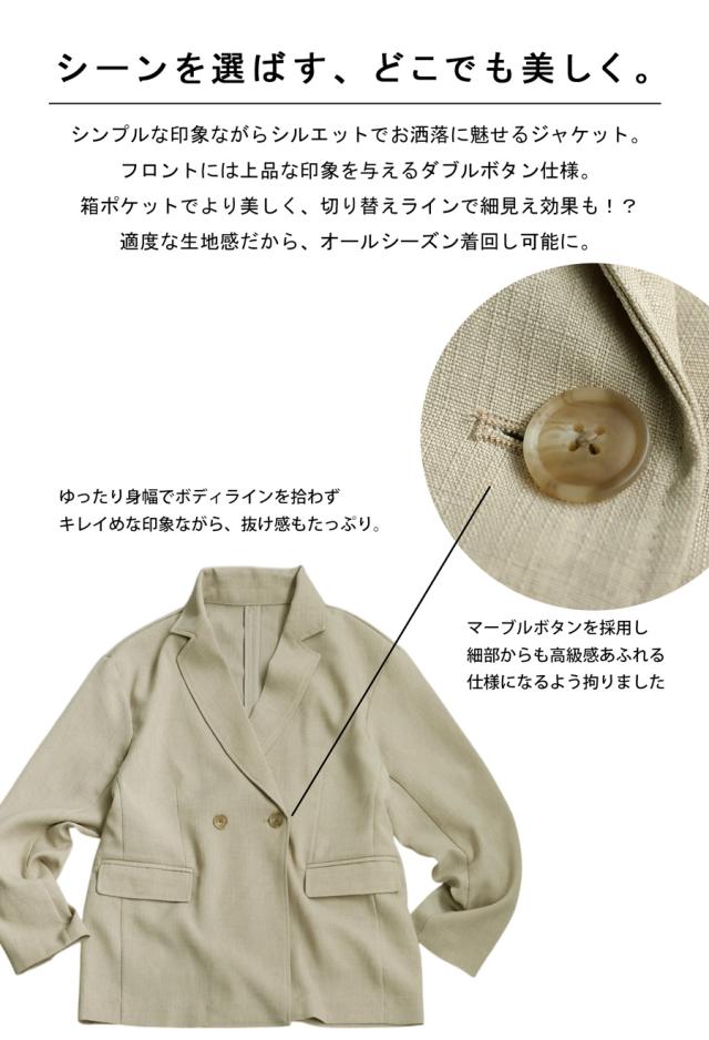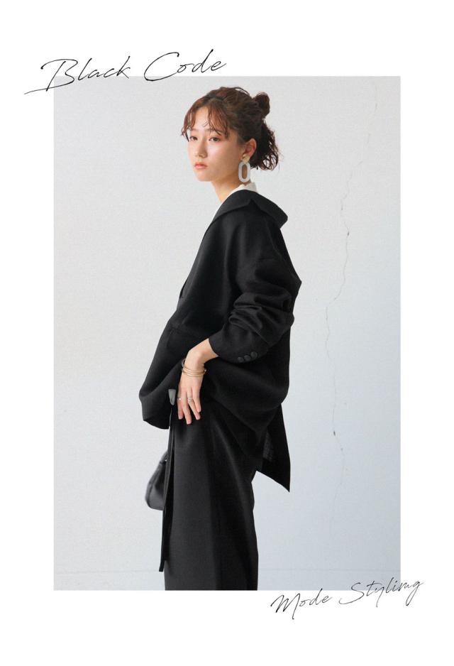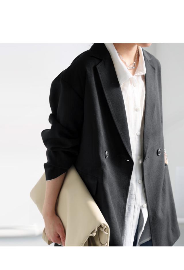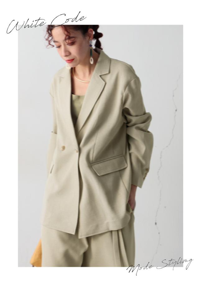 シャープなテーラードデザインとダブルボタンが、シンプルながらモードな雰囲気を演出。