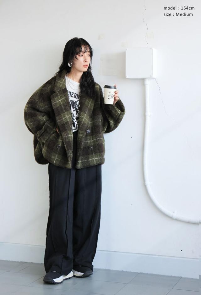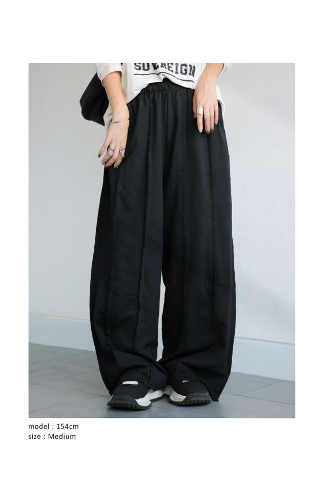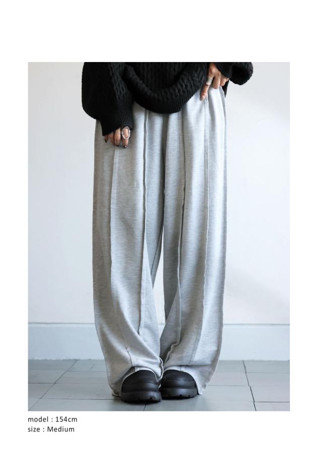 縦ラインを強調するアウトシームが、ワイドシルエットにすっきり感を添えて、自然とスタイルアップを実現。