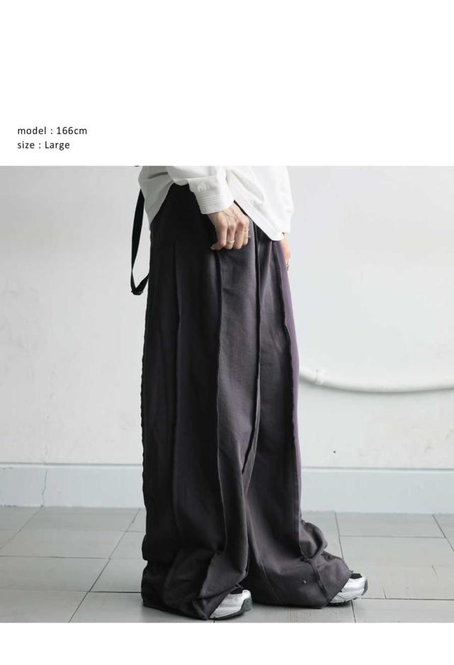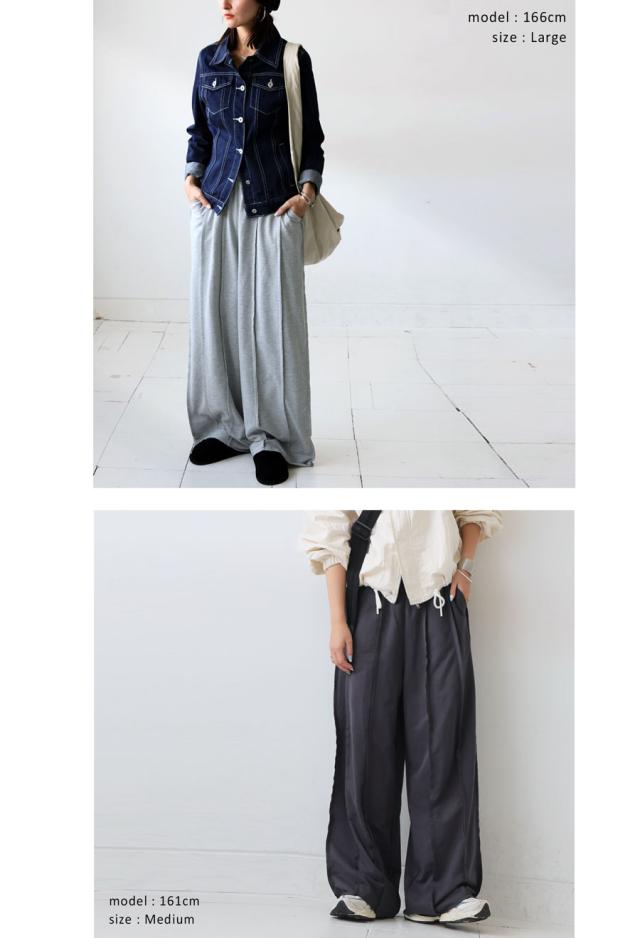 体型カバーを叶えるゆったりしたロング丈と、動きやすいワイドパンツならではのリラクシーな穿き心地が魅力です。