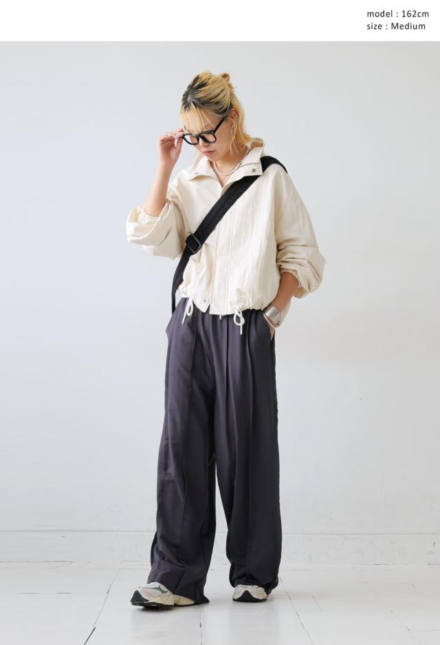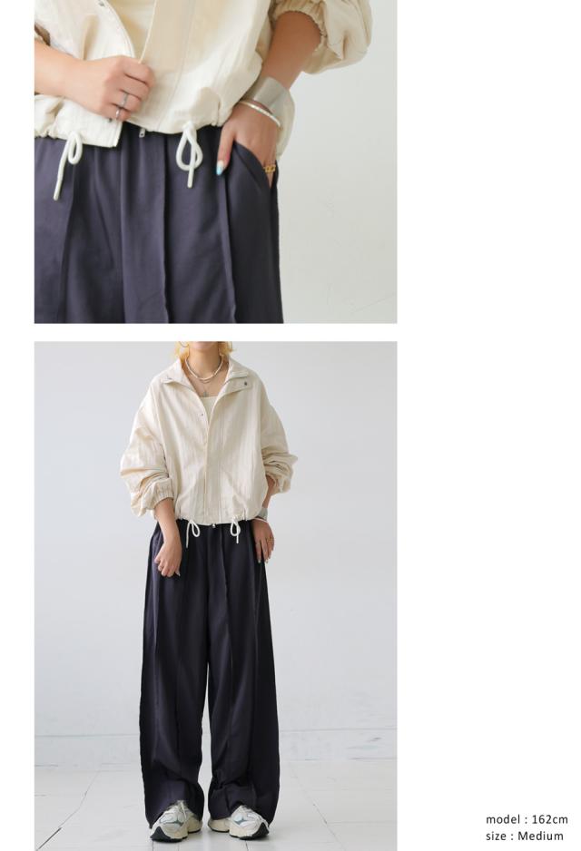 ウエストはゴム&ドロスト仕様でストレスフリー、ポケット付きで機能性も◎。