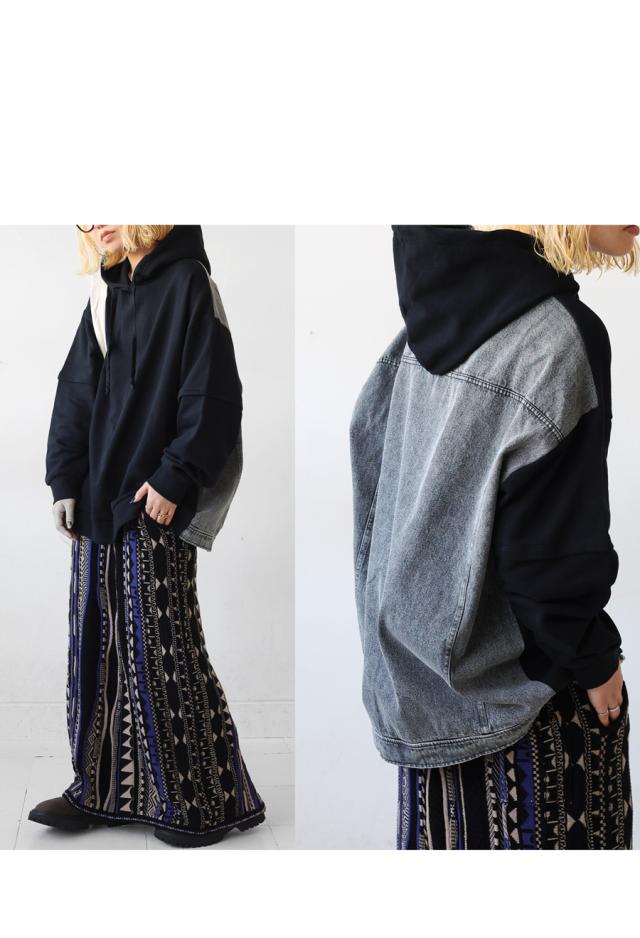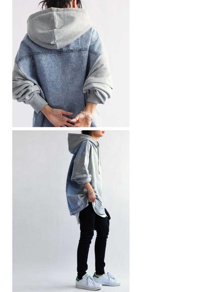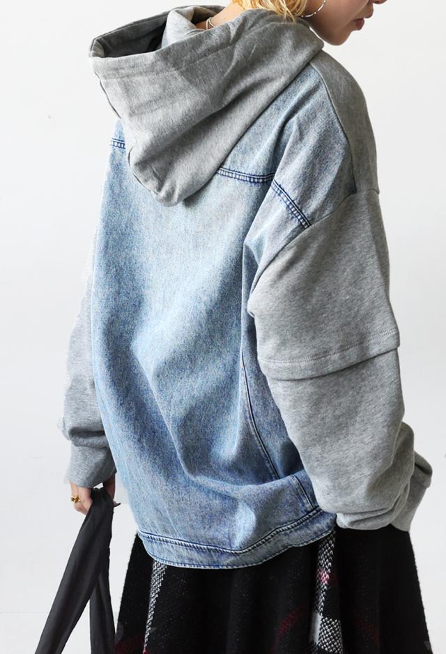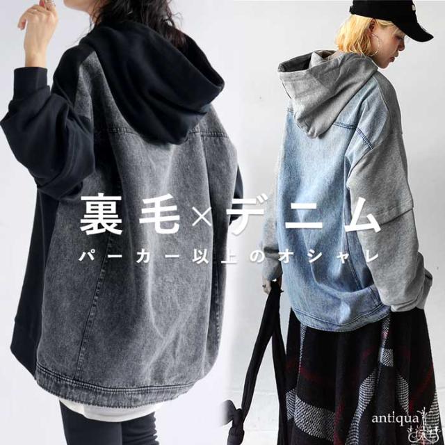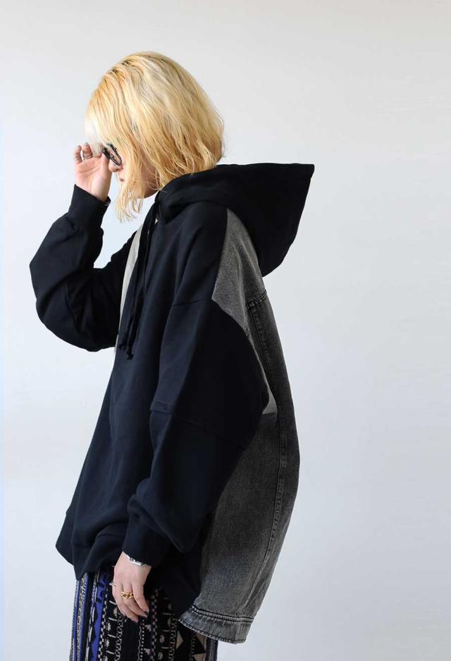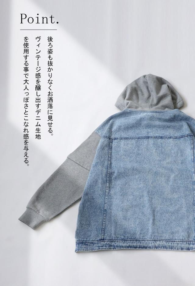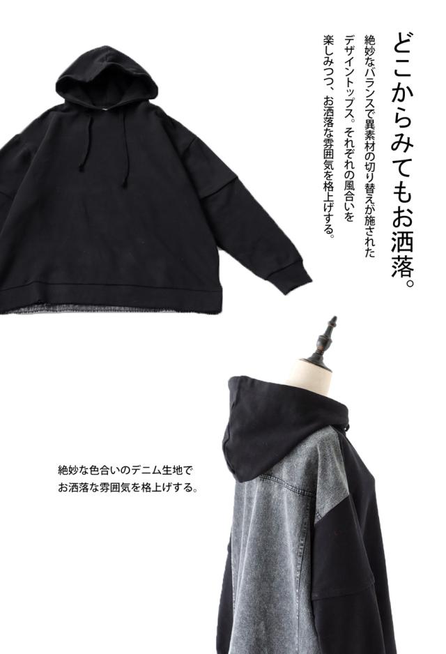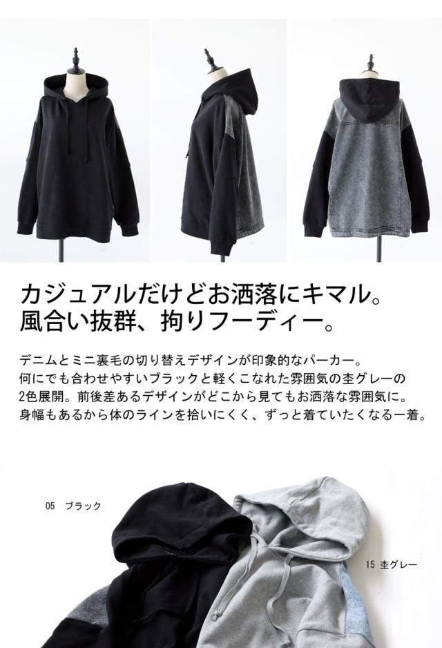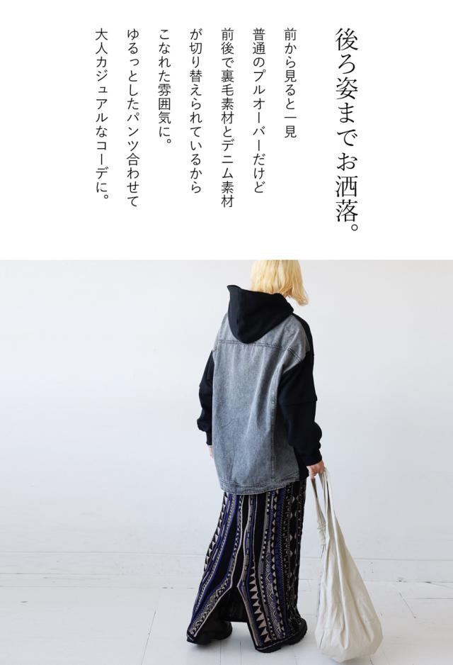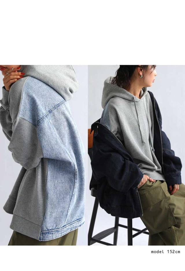 za-00198 プルオーバー フード付き ミニ裏毛 デニム 切り替え 異素材 ドッキング フーディー ゆったり 裏毛 裏毛トップス 裏毛パーカー スウェット 綿100 大きいサイズ