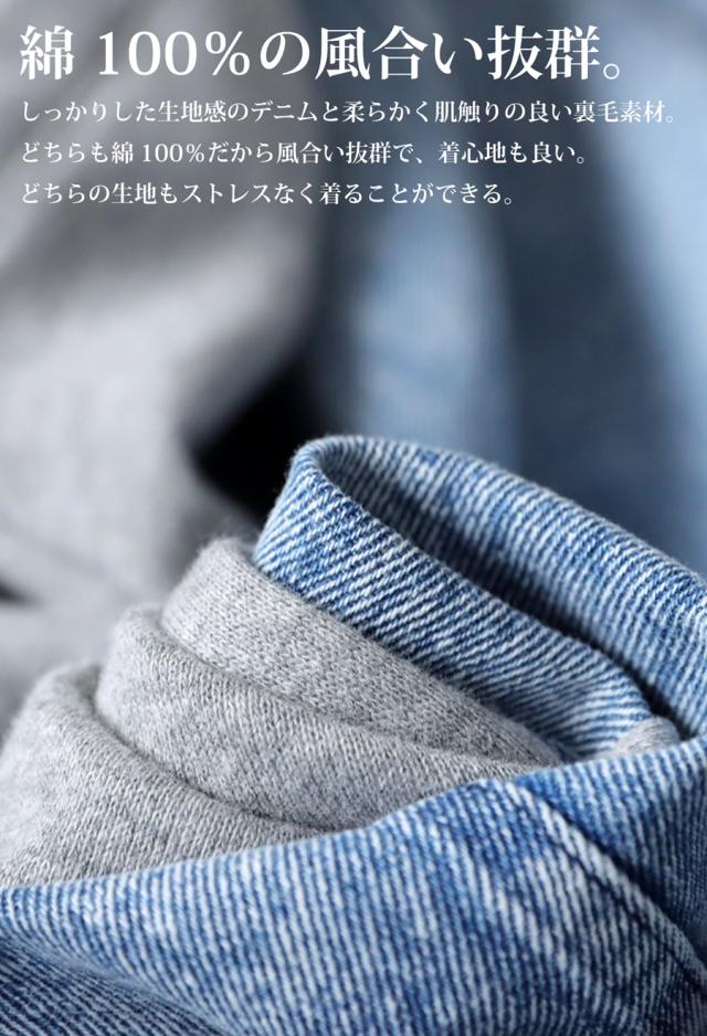 綿100%(コットン)素材で、デニム部分も裏毛部分も柔らかな肌触りと快適な着心地を両立。