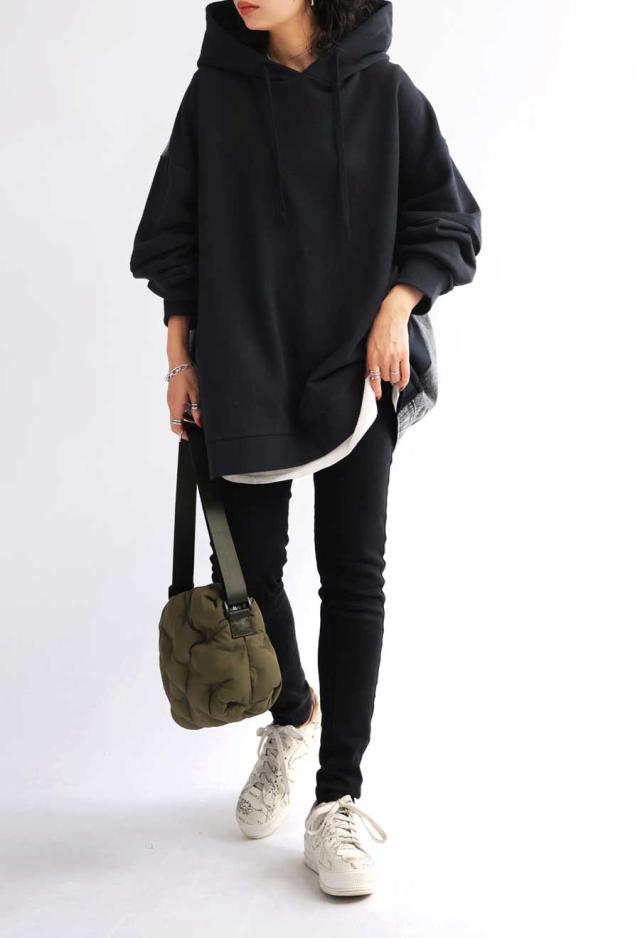 異素材の切り替えが目を惹く、こなれ感漂うデザインパーカー。