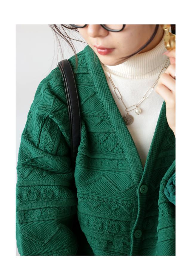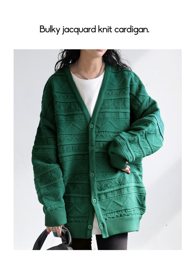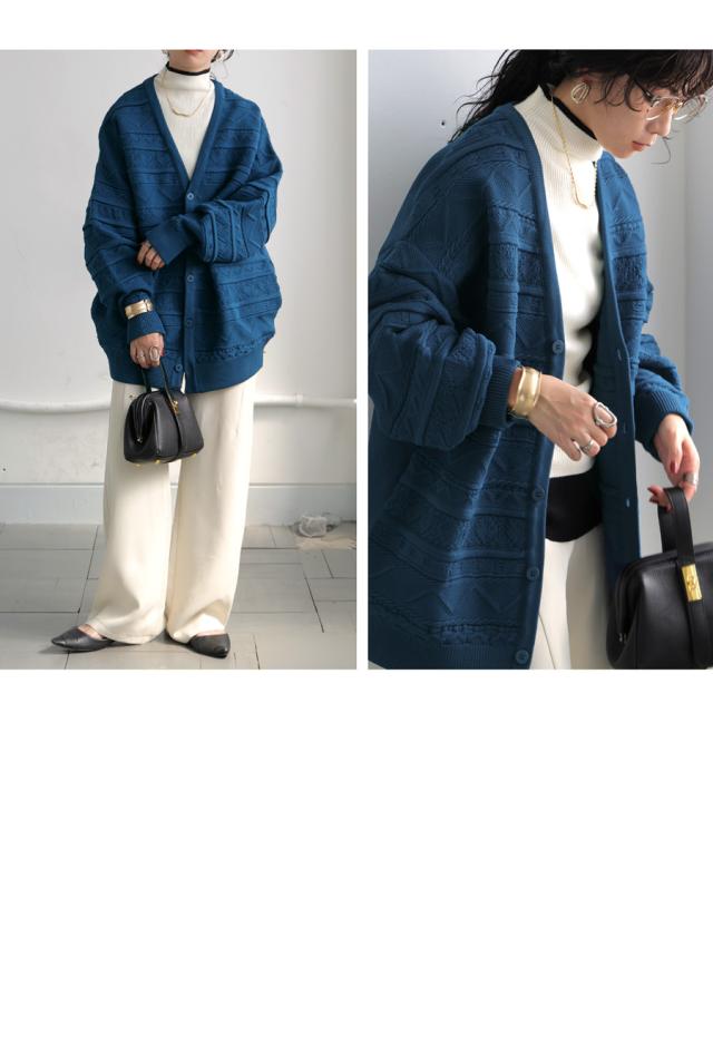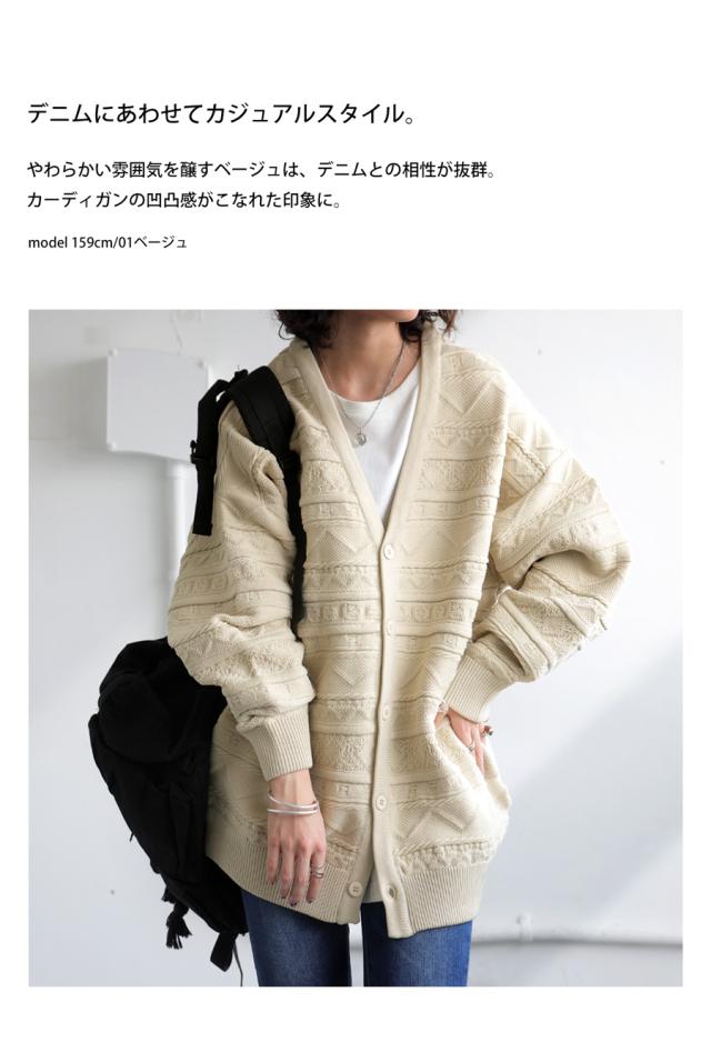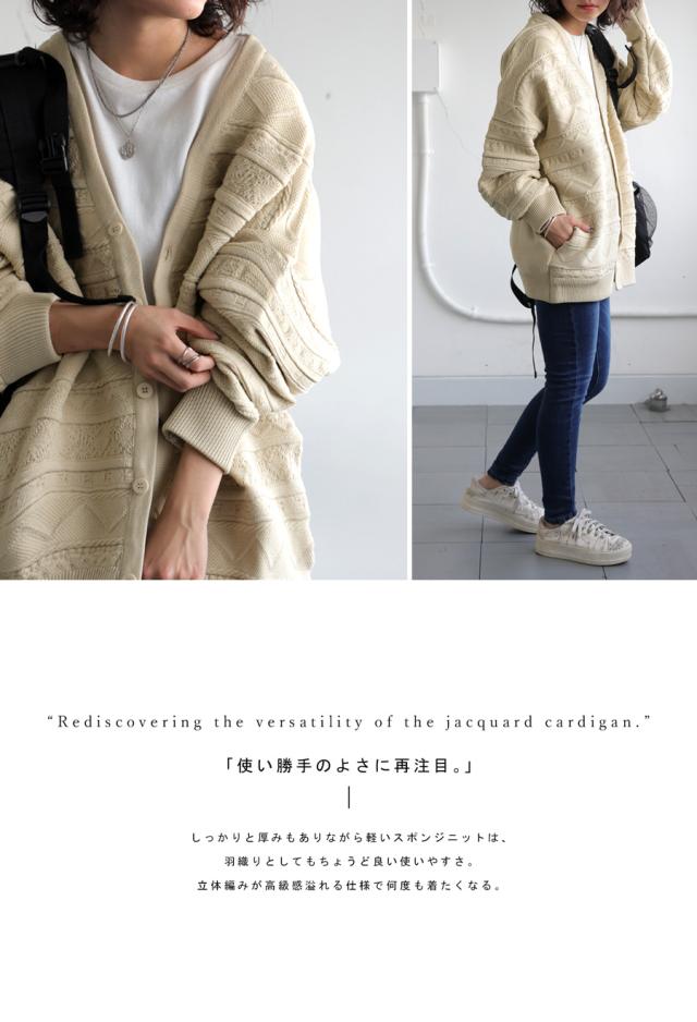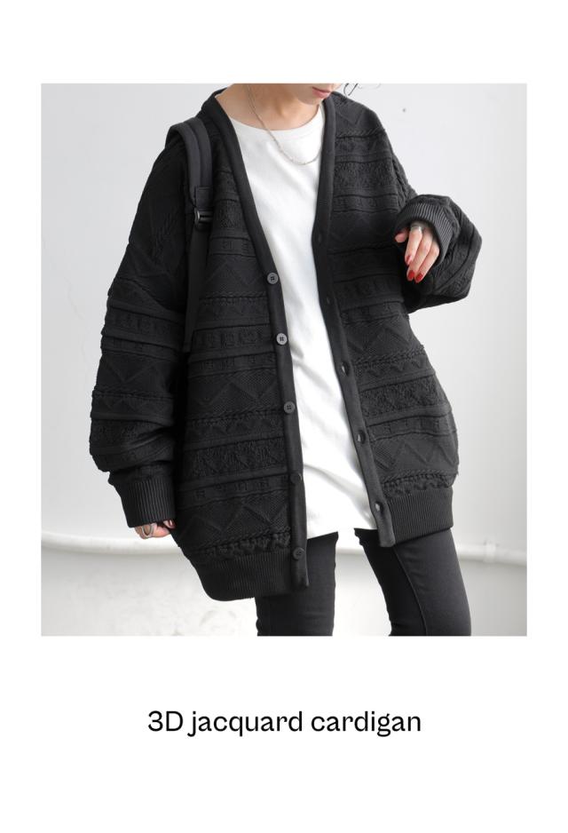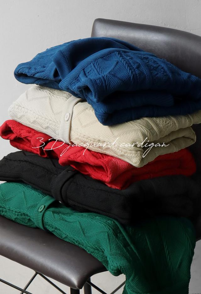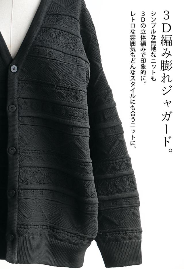 模様の立体編みが表情作る、3Dジャガードニットカーディガン。